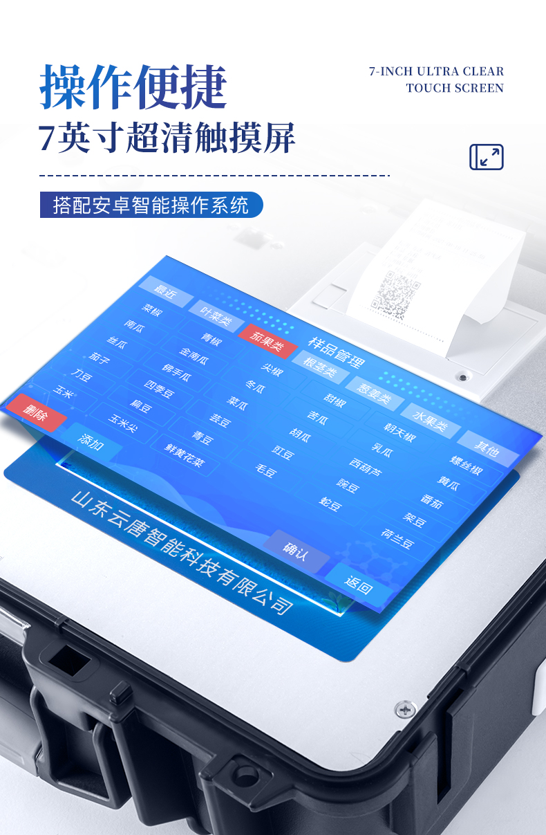 | 機(jī)箱采用工業(yè)級ABS工程塑料箱,方便攜帶,穩(wěn)固耐用,便于流動測試。 | 智能操作系統(tǒng),采用更加人性化操作,主控采用多核處理器,主頻1.88Ghz,運(yùn)轉(zhuǎn)速度更快速,穩(wěn)定性更強(qiáng)。 | 自動判斷樣品是否合格,檢測結(jié)果更加直觀。 | 儀器具有100多種蔬菜名稱菜單庫,分類管理,并可按需添加或刪除蔬菜名,編輯蔬菜名稱,可直接打印出蔬菜名稱。 | 檢測通道:12個(gè)檢測通道,可以同時(shí)測試多個(gè)樣品,循環(huán)檢測,即放即檢,每個(gè)樣品由程序控制分別獨(dú)立工作,不會互相干擾。 | 儀器具有wifi聯(lián)網(wǎng)功能,可將數(shù)據(jù)快速上傳電腦,進(jìn)行數(shù)據(jù)管理與統(tǒng)計(jì),4G信號GPRS遠(yuǎn)傳功能,可插手機(jī)卡實(shí)現(xiàn)數(shù)據(jù)遠(yuǎn)傳平臺,。 | 顯示方式:7英寸高靈敏真彩觸摸屏顯示,人性化中文操作界面,讀數(shù)直觀、簡單。 | 打印機(jī)采用串口5v打印,可選擇手動打印或者自動打印,三分鐘出打印結(jié)果,打印格式為檢測人姓名、吸光度差值、檢測時(shí)間、檢測機(jī)構(gòu)、樣品名稱及結(jié)果判定。 | 光源采用進(jìn)口超高亮發(fā)光二極管,具有低功耗、高精度、穩(wěn)定性強(qiáng)、光源可控可以關(guān)掉不使用的光源,響應(yīng)速度快等優(yōu)點(diǎn)。 | 智能恒流穩(wěn)壓,光強(qiáng)自動校準(zhǔn),長時(shí)間連續(xù)工作光源無溫漂現(xiàn)象。 | 采用USB2.0接口設(shè)計(jì),方便數(shù)據(jù)的存貯和移動,并可隨時(shí)與計(jì)算機(jī)直接相連,并且可用計(jì)算機(jī)控制儀器。實(shí)現(xiàn)數(shù)據(jù)查詢、瀏覽、分析、統(tǒng)計(jì)、打印等。 | 智能化程度高,儀器具有自檢功能:具有開機(jī)自檢和調(diào)零功能,具有自動檢測重復(fù)性功能 | 儀器具有自身保護(hù)功能,可設(shè)置用戶名及密碼,防止非工作人員操作等。 | 采用DC12v直流供電,安全系統(tǒng)更高,并且配備6A鋰電池充電器。 | 儀器具有重新校準(zhǔn)、鎖定、恢復(fù)出廠設(shè)置功能。 |