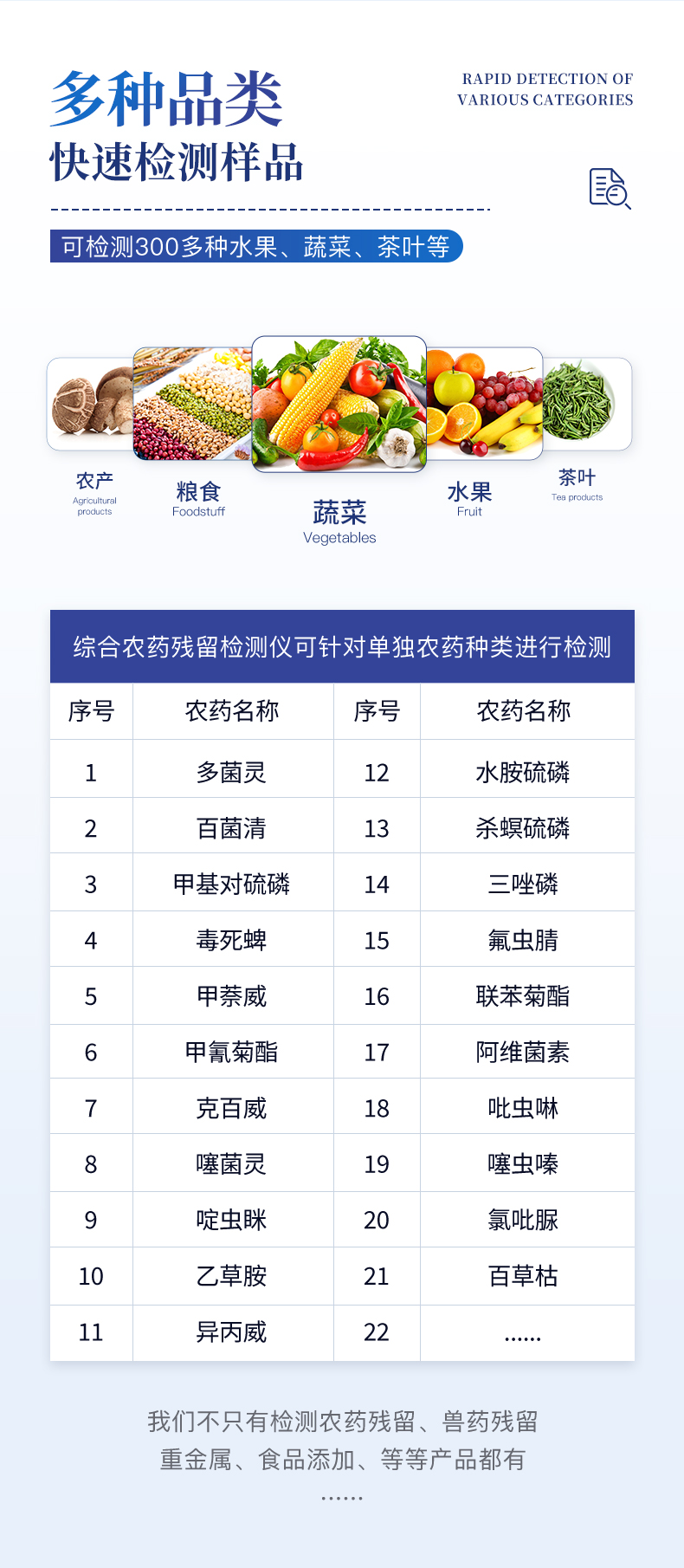 檢測標(biāo)準(zhǔn):依據(jù)國家標(biāo)準(zhǔn)方法(GB/T5009.199-2003)以及世界衛(wèi)生組織WHO、世界糧農(nóng)組織FAO殘留農(nóng)藥檢測標(biāo)準(zhǔn)、世界環(huán)境保護(hù)局EPA參照攝入量等要求來設(shè)計(jì)。采用酶抑制率比色法對水果、蔬菜等農(nóng)林產(chǎn)品中有機(jī)磷和氨基甲酸酯類農(nóng)藥含量進(jìn)行快速準(zhǔn)確的檢測,乙酰膽堿酯酶和丁酰膽堿酯酶試劑均可以使用,符合國家標(biāo)準(zhǔn)和農(nóng)業(yè)部標(biāo)準(zhǔn)的要求。