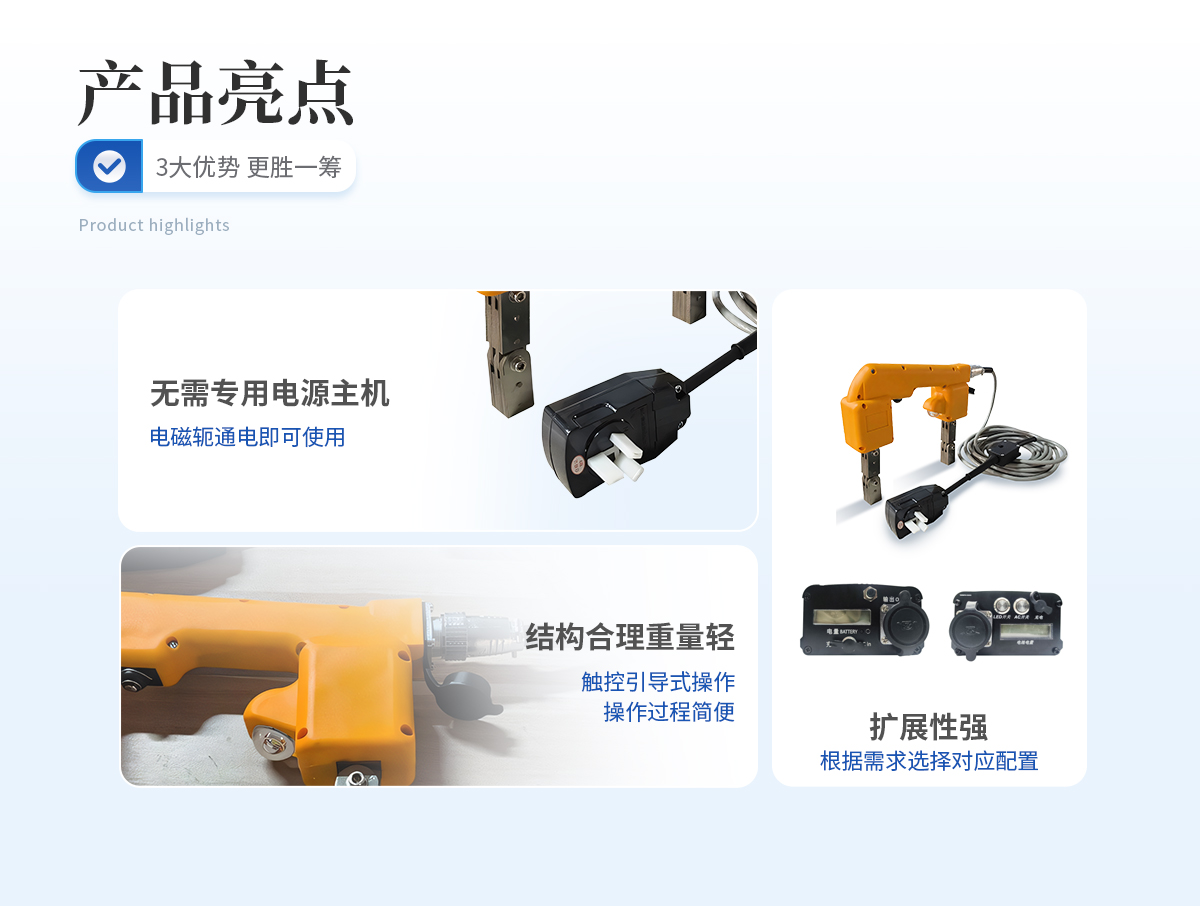 | 1、 無需專用電源主機,電磁軛通電即可使用; | 2、 體積小巧,重量輕; | 3、 開模制作,結(jié)構(gòu)合理,手感舒適; | 4、 磁軛標配白光燈,可選熒光燈(不額外加費用); | 5、 配專用儀器箱; | 6、 擴展性強,可根據(jù)需要增配對應(yīng)的專用電池包,通過專用電源來實現(xiàn)交流、直流磁化功能。可滿足不方便拖電源線的場所使用。 |