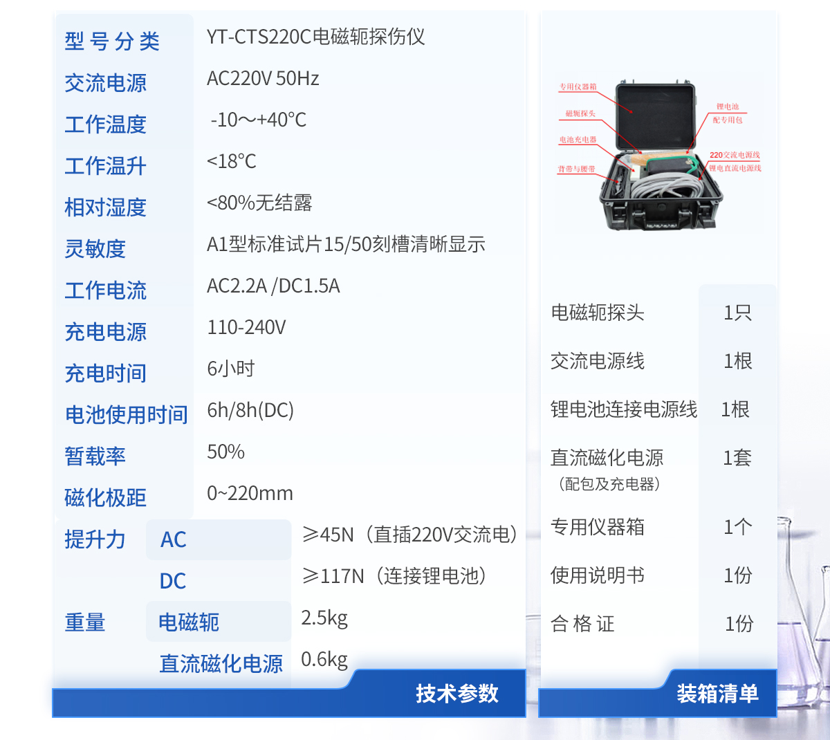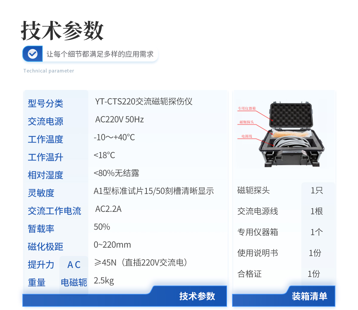 | 1.磁軛探頭1只 | 2.交流電源線1根 | 3.專用儀器箱1個 | 4.使用說明書1份 | 5.合格證1份 |