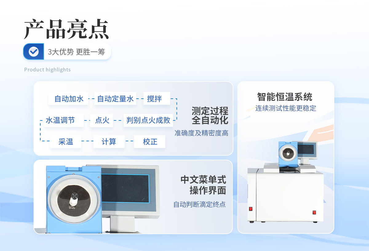 | 1、采用單片機系統(tǒng)來控制儀器,實現(xiàn)啟動后自動加水、自動定量水、攪拌、水溫調(diào)節(jié),點火、判別點火成敗、采溫、計算、校正 。 | 2、裝氧彈外,實現(xiàn)測定過程全自動化,無人為誤差,準確度及精密度高。 | 3、中文菜單式操作界面,在中文大屏幕液晶提示下,用戶裝好氧彈即可完成實驗過程。 | 4、根據(jù)用戶需要可加備USB插口,和windowsXP操作系統(tǒng),即可實現(xiàn)微機控制。 | 5、結(jié)構(gòu)合理,制作精良,測量準確度高,分析速度快,性能穩(wěn)定,抗干擾能力強,使用可靠 | 6、性能穩(wěn)定、故障率低、系統(tǒng)常數(shù)和實驗結(jié)果可長時保存并且關機后不丟失等特點。 |