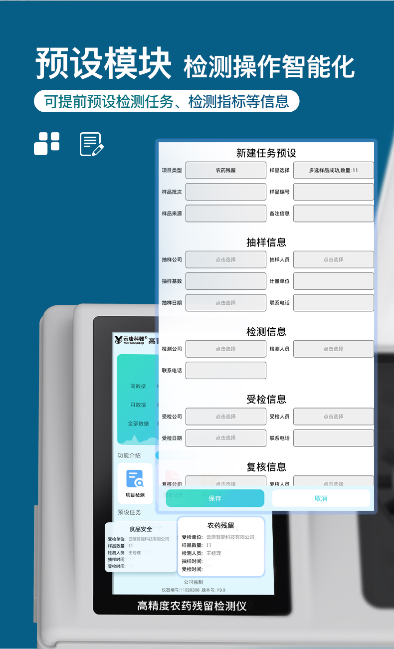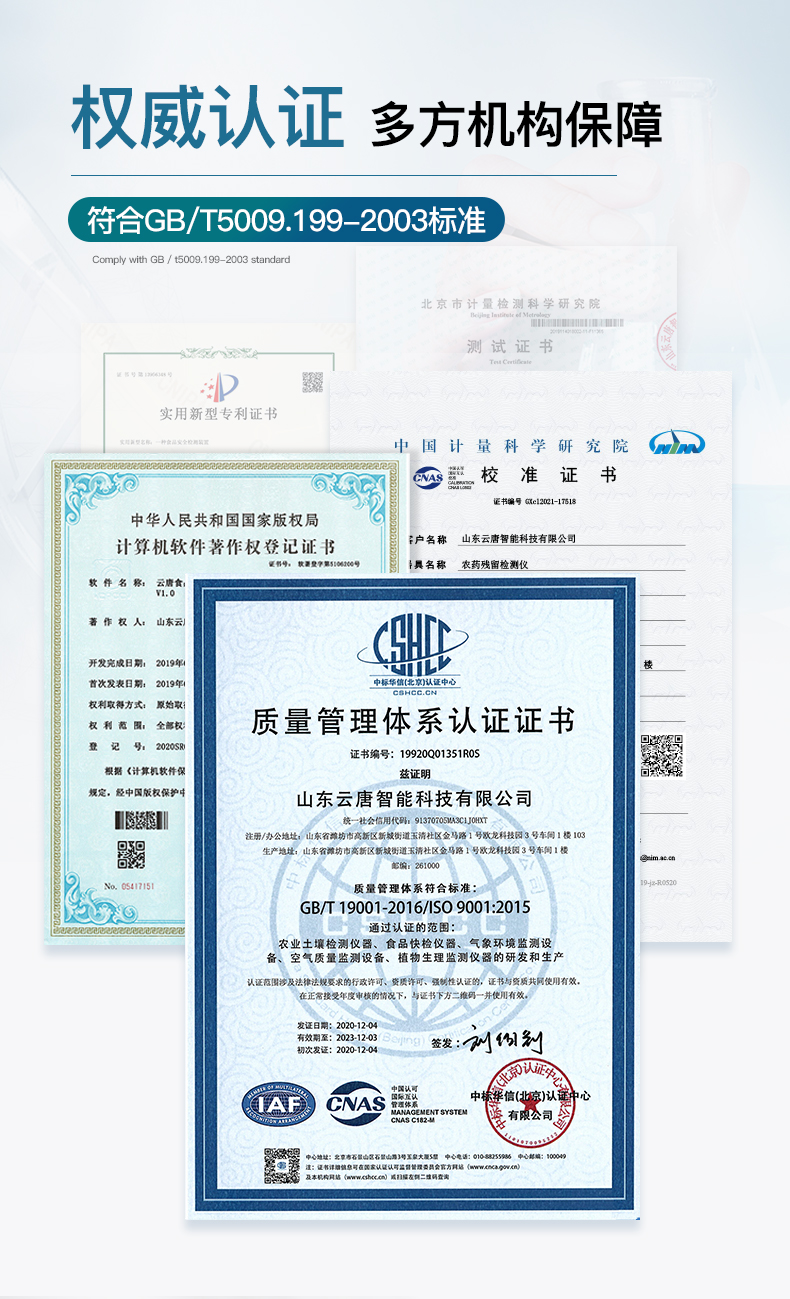 | 儀器采用臺式一體化系統(tǒng)檢測技術(shù),將分光光度模塊、新型農(nóng)殘檢測模塊、數(shù)字化管理模塊、無線通訊模塊高度集成于一體,支持檢測200種食品安全檢測項(xiàng)目,同時(shí)預(yù)留升級檢測方法。 | 儀器檢測模塊標(biāo)準(zhǔn)化、智能化,可隨意自由組合。檢測箱體內(nèi)置多個(gè)標(biāo)準(zhǔn)檢測單元,檢測模塊可以調(diào)整配置。 | 儀器采用全新安卓智能系統(tǒng),主控芯片采用 ARM Cortex-A7,RK3288/4核處理器,10.1寸高清液晶觸摸豎屏,更加**的UI交互界面,運(yùn)轉(zhuǎn)快捷;儀器配備無線通信模塊: 4G(APN)通訊模塊、Wifi模塊,藍(lán)牙傳輸,同時(shí)具有雙USB接口以及RJ45接口能以多種方式實(shí)現(xiàn)數(shù)據(jù)保存和數(shù)據(jù)傳輸功能。 | 創(chuàng)新檢測模式: | ★檢測通道:≥12通道;采用精密旋轉(zhuǎn)比色池設(shè)計(jì),使用同芯片同光源校準(zhǔn)精度,解決不同光源之間的誤差值。1-12通道間誤差0.1%。(***:**202022821055.2) | ★儀器具有自動(dòng)識別比色皿檢測功能,即:將樣品比色皿放入儀器后,點(diǎn)擊樣品檢測,儀器自動(dòng)識別比色皿進(jìn)行通道檢測。 | 進(jìn)口高精光源: | 高精度進(jìn)口四波長冷光源,通道配置 410、520、590、630nm 波長光源,一個(gè)光源芯片驅(qū)動(dòng)一個(gè)光源,誤差極小,每臺設(shè)備單獨(dú)**校準(zhǔn)光源,**比對,同時(shí)參照四種不同波段光源全方位覆蓋市面上99%的農(nóng)殘食品項(xiàng)目檢測。 | 智能化操作系統(tǒng): | 便捷操作系統(tǒng):設(shè)備檢測時(shí)可在同一檢測界面自動(dòng)對應(yīng)相關(guān)檢測通道一次性選擇1-12個(gè)樣品名稱,無須退出界面,節(jié)省操作時(shí)間。 | 數(shù)據(jù)集成系統(tǒng):設(shè)備首頁自動(dòng)統(tǒng)計(jì)檢測數(shù)據(jù)包含:周檢測數(shù)據(jù)、月檢測數(shù)據(jù),全部檢測總數(shù)量,均包含檢測總數(shù),合格數(shù),不合格數(shù),以及相關(guān)柱形分析圖,對各項(xiàng)檢測數(shù)據(jù)清晰掌握,無需電腦查詢,更加快捷直觀。 | 項(xiàng)目預(yù)設(shè)系統(tǒng):支持添加單個(gè)及多個(gè)相同或不相同的任務(wù)預(yù)設(shè),一鍵快速調(diào)取,每一個(gè)任務(wù)分別可以設(shè)置不同的樣品、批次、編號、來源、備注、抽樣信息、檢測信息、受檢信息、復(fù)核信息等更多信息。無縫鏈接平臺和APP實(shí)時(shí)查看下發(fā)任務(wù)。 | 數(shù)據(jù)監(jiān)管系統(tǒng):同步對接監(jiān)管平臺,數(shù)據(jù)可局域網(wǎng)和互聯(lián)網(wǎng)數(shù)據(jù)上傳,檢測結(jié)果可選擇直接傳至食品安全監(jiān)管平臺。集成OSS輸出存儲服務(wù)、區(qū)分設(shè)備定向管理應(yīng)用,進(jìn)行區(qū)域食品安全監(jiān)管及大數(shù)據(jù)分析處理與數(shù)據(jù)統(tǒng)計(jì),檢測區(qū)域食品安全長短期動(dòng)態(tài),達(dá)到食品安全問題預(yù)估、預(yù)警。 | 自定義打印系統(tǒng):內(nèi)置全新打印系統(tǒng),新創(chuàng)自定義打印方式,可按需靈活設(shè)置開啟或關(guān)閉:產(chǎn)品合格證(國家農(nóng)業(yè)部標(biāo)準(zhǔn)要求),二維碼,抽樣信息、檢測信息,受檢信息、復(fù)核信息、抽樣日期、檢測日期等信息的打印。 | 系統(tǒng)遠(yuǎn)程更新功能:可定向分客戶分儀器更新系統(tǒng),按照不同客戶后期實(shí)際需求添加項(xiàng)目,無需機(jī)器返廠,即可遠(yuǎn)程實(shí)時(shí)升級全新系統(tǒng),節(jié)省時(shí)間成本及避免運(yùn)輸造成設(shè)備損壞。 | 儀器主機(jī)采用一體化防水、抗壓、防撞擊、防腐蝕箱體設(shè)計(jì),同時(shí)配備交直流供電,可連接車載電源,可選配大容量充電鋰電池,滿足現(xiàn)場野外檢測需求。 | 安全證書,放心保障:儀器具有中國計(jì)量科學(xué)研究院校準(zhǔn)證書,權(quán)威認(rèn)證。 |
