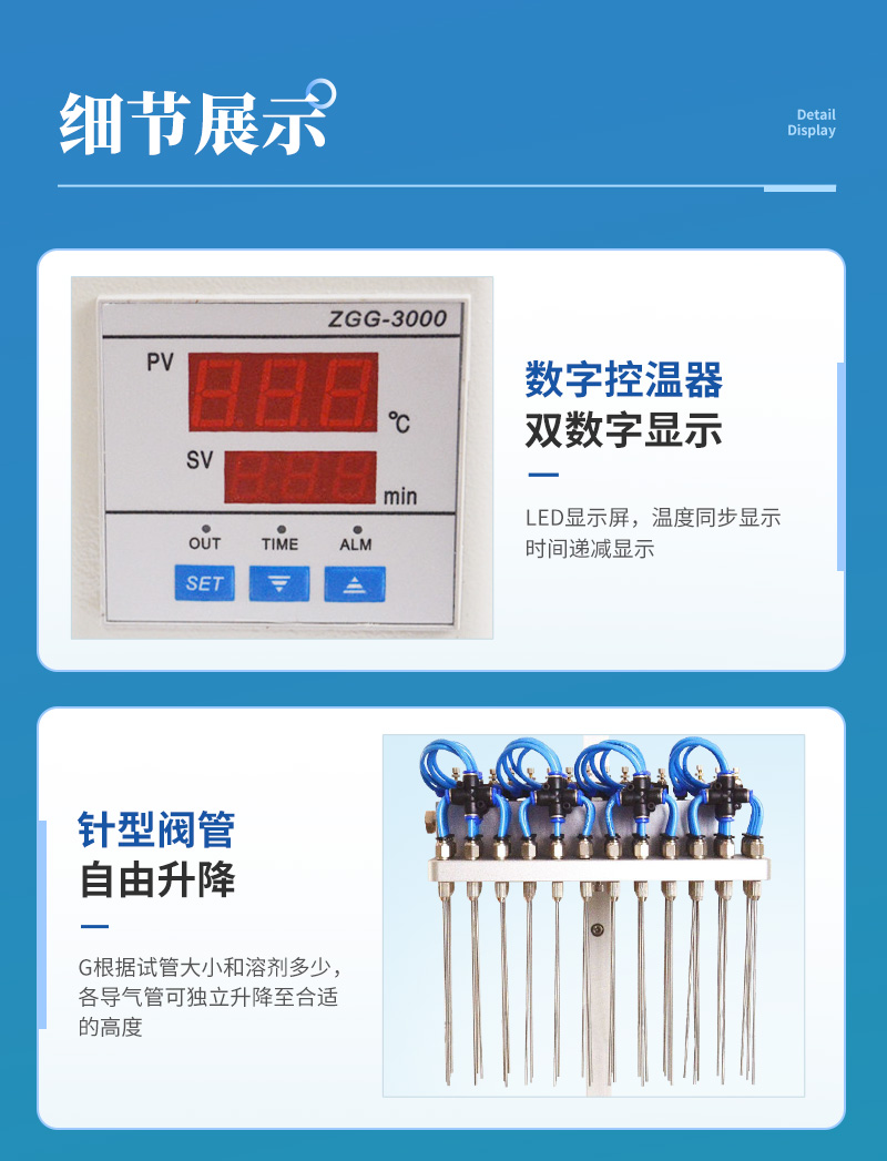 | 分配室上各氣針通道可組合使用或單獨(dú)使用,每一路氣針均可單獨(dú)開關(guān)。分配室的高度可視需要調(diào)節(jié)。 | 每一路氣體流量可單獨(dú)進(jìn)行調(diào)節(jié),克服了不可調(diào)氮吹儀各氣路氣流量大小不一的弱點(diǎn)。 | 數(shù)字溫控器,雙數(shù)字顯示. | 可能與溶劑接觸的部件均采用不銹鋼材料、合金鋁并表面進(jìn)行塑料噴涂,使用壽命長(zhǎng)且清潔方便。 | 整機(jī)可放入通風(fēng)櫥中使用。 | 一般標(biāo)配的加熱塊規(guī)格為孔徑∮16mm。 |