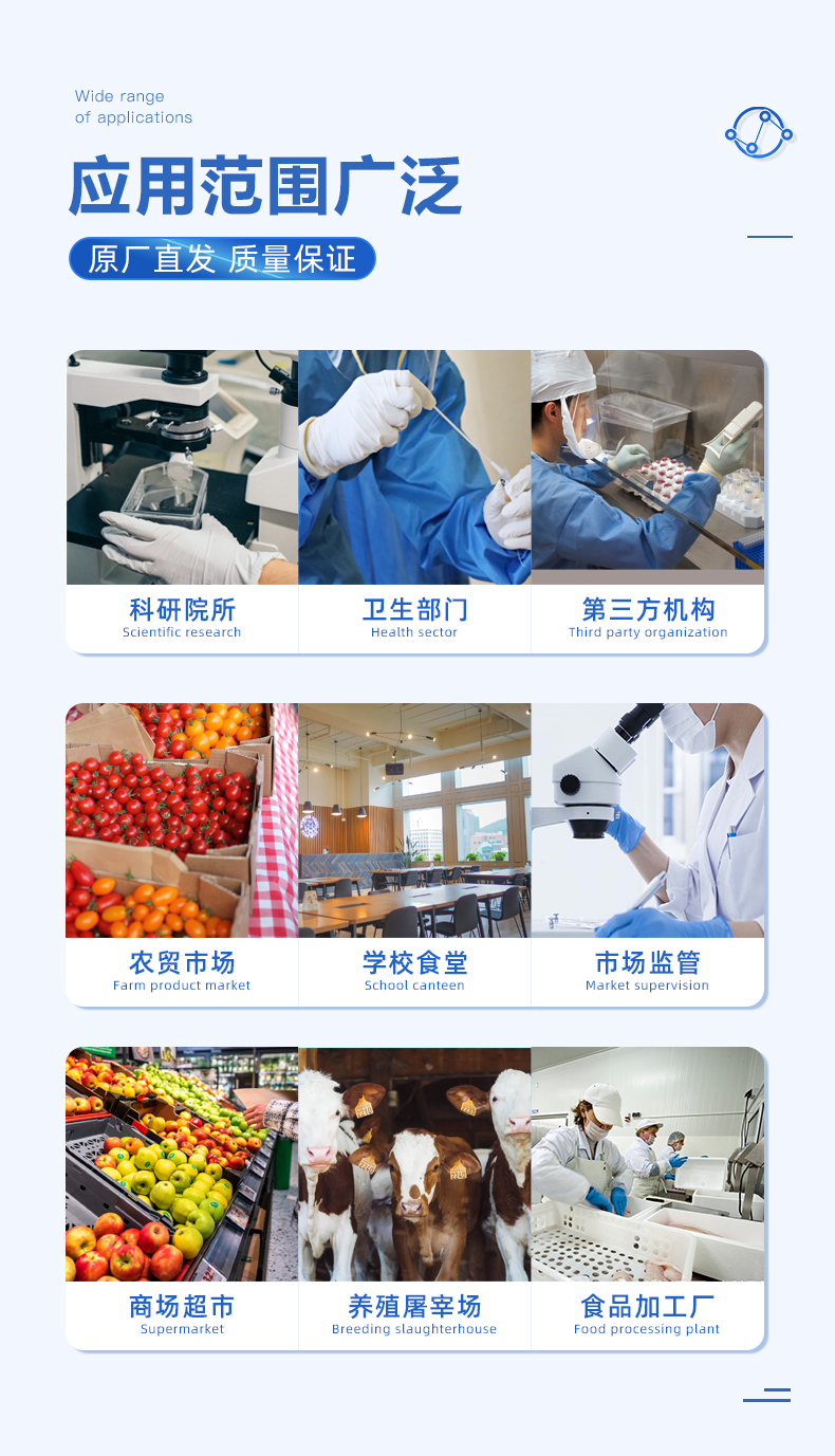 | 食品添加劑:二氧化硫、雙氧水、亞硝酸鹽、硝酸鹽、苯甲酸鈉、山梨酸、糖精鈉、甜蜜素、安賽蜜、硫酸鎂等 | 有毒有害物質(zhì):甲醛、吊白塊、硼砂、過氧化苯甲酰、溴酸鉀、羅丹明B、三聚氰胺、蘇丹紅等 | 果蔬中:有機磷和氨基甲酸酯類農(nóng)藥殘留; | 病害肉診斷:組胺、揮發(fā)性鹽基氮、肉制品酸價、水發(fā)產(chǎn)品中組胺 | 重金屬含量:鉛、鎘、鉻、汞、砷、錫、鎳、鋁等;食用油脂檢測:過氧化值、酸價、油脂丙二醛等。 | 瘦肉精激素類(獸藥):鹽酸克倫特羅、沙丁胺醇、萊克多巴胺、己烯雌酚、喹乙醇等 | 抗生素殘留類(獸藥):四環(huán)素類、硝基呋喃類、磺胺類、沙星類、喹諾酮類、慶大霉素、鏈霉素、阿莫西林、紅霉素等 | 水產(chǎn)品安全類:孔雀石綠、氯霉素、呋喃妥因代謝、呋喃西林代謝、呋喃它酮代謝、呋喃唑酮代謝等 | 真菌毒素類:食用油、糧食及飼料中黃曲霉毒素B1、奶中黃曲霉毒素M1、嘔吐毒素、玉米赤霉烯酮、赭曲霉毒素A等 | 水酒飲品分析:乳品及牛奶中蛋白質(zhì);酒中甲醇、乙醇、雜醇油;蜂蜜中果糖和葡萄糖、蔗糖、淀粉酶、酸度;水中氰化物、余氯,飲料中維C等 | 調(diào)味品成分:食醋的總酸、醬油的總酸、芝麻油純度、谷氨酸鈉、醬油氨基酸態(tài)氮、食鹽中亞鐵氰化鉀、食鹽中碘等 | 食用色素類:紅色色素(胭脂紅、莧菜紅、赤蘚紅、誘惑紅)、黃色色素(檸檬黃、日落黃)、藍色色素(亮藍)等 | 動物疫病類:豬藍耳病毒、豬瘟病毒、豬偽狂犬病毒、豬偽狂犬病毒gE蛋白、豬口蹄疫3ABC蛋白、豬口蹄疫病毒IgG、豬細小病毒、雞禽流感等 |