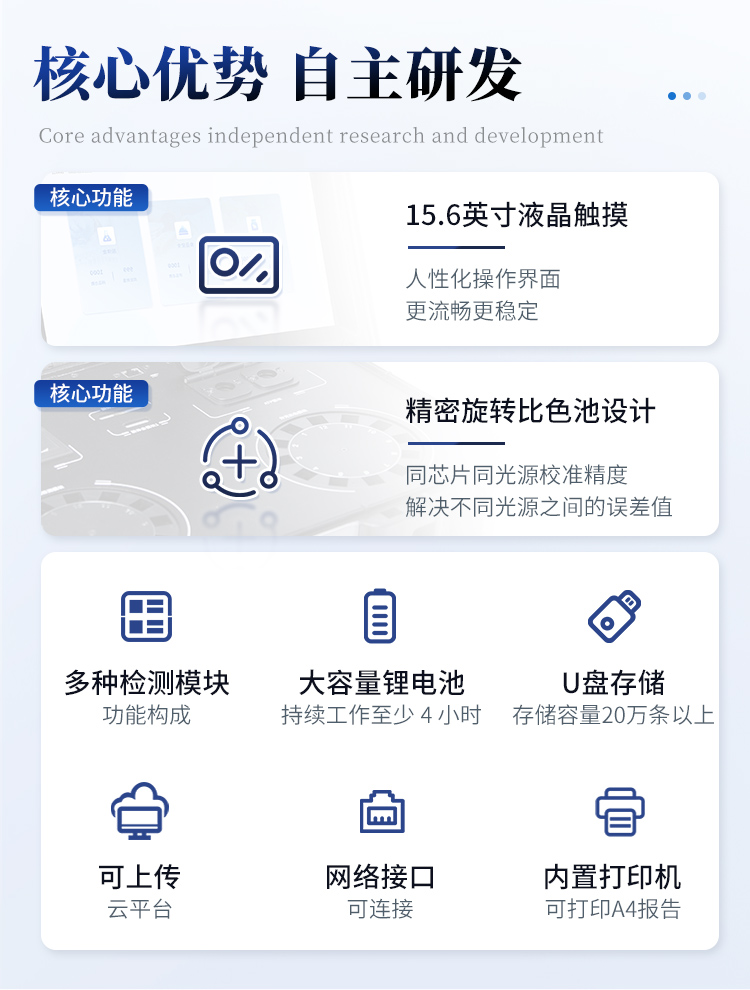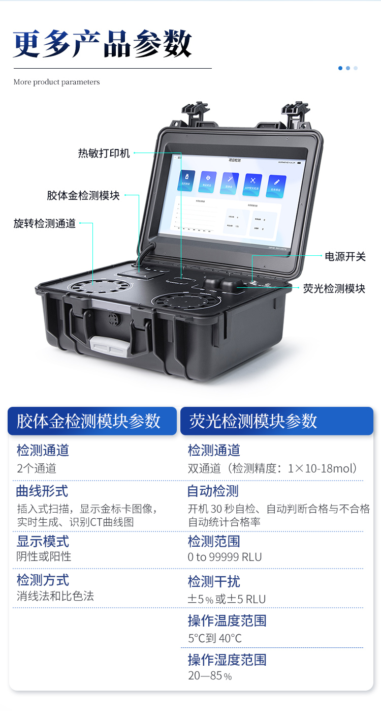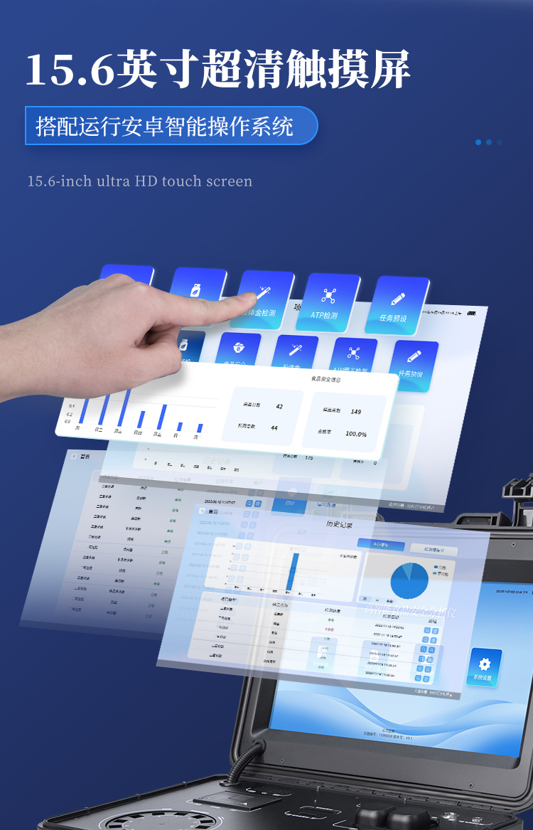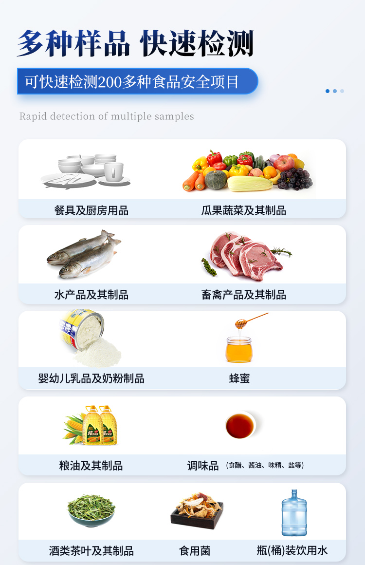 | 1. 功能構(gòu)成:主要包括分光光度模塊、新型農(nóng)殘檢測(cè)模塊、膠體金檢測(cè)模塊、熒光檢測(cè)模塊、數(shù)字化管理模塊等,所有模塊集成一體,可快速檢測(cè)200多種食品安全項(xiàng)目,如獸藥殘留、農(nóng)藥殘留、非法添加劑、細(xì)菌數(shù)值等指標(biāo)。 | 2. 檢測(cè)樣品種類:餐具及廚房用品、瓜果蔬菜及其制品、水產(chǎn)品及其制品、畜禽產(chǎn)品及其制品、嬰幼兒乳品及奶粉制品、蜂蜜、糧油及其制品、調(diào)味品(食醋、醬油、味精、鹽等)、酒類茶葉及其制品、食用菌、飲料、蛋類藥物殘留(雞蛋,鴨蛋等)、米豆面制品、糖果糕點(diǎn)類(小食品)、薯類及膨化食品、瓶(桶)裝飲用水、添加食用色素的食品、使用添加劑的食品、含有有毒有害物質(zhì)的相關(guān)食品。 | 3、顯示屏幕:儀器采用15.6英寸液晶觸摸屏顯,搭配運(yùn)行安卓智能操作系統(tǒng),主控芯片采用ARM Cortex-A7,RK3288/4核處理器,主頻1.88Ghz,操作方便,性能更強(qiáng)。 | 4、供電模式:儀器交直流兩用,直流12V供電,可連接車載電源,配18ah大容量充電鋰電池,電量可實(shí)時(shí)顯示,無(wú)外部電源條件下可持續(xù)工作至少 4 小時(shí)。 | 5、檢測(cè)通道:≥24通道;采用精密旋轉(zhuǎn)比色池設(shè)計(jì),使用同芯片同光源校準(zhǔn)精度,解決不同光源之間的誤差值,更加準(zhǔn)確**,采用高精度進(jìn)口四波長(zhǎng)冷光源,每個(gè)通道均配置 410、520、590、630nm 波長(zhǎng)光源,標(biāo)配**的光路切換裝置,專利光路切換功能可實(shí)現(xiàn)64波長(zhǎng),并且所有檢測(cè)項(xiàng)目可實(shí)現(xiàn)所有通道同時(shí)檢測(cè). | 6、通訊接口:配備無(wú)線通信模塊、4G(APN)通訊模塊、藍(lán)牙傳輸,同時(shí)具有雙USB接口以及RJ45網(wǎng)線接口,可以多方式實(shí)現(xiàn)數(shù)據(jù)保存及數(shù)據(jù)傳輸。 | 7、存儲(chǔ)方式:支持U盤存儲(chǔ),兩個(gè)標(biāo)準(zhǔn)USB接口,免驅(qū)動(dòng)安裝。檢測(cè)結(jié)果存儲(chǔ)容量20萬(wàn)條以上,可生成Excel表格進(jìn)行拷貝,并具有登錄保護(hù)功能。 | 8、操作系統(tǒng):儀器可在同一檢測(cè)界面自動(dòng)對(duì)應(yīng)相關(guān)檢測(cè)通道,一次性選擇不少于11個(gè)樣品名稱,無(wú)需退出界面,節(jié)省操作時(shí)間。并可以對(duì)每個(gè)通道屬性和樣品信息單獨(dú)進(jìn)行編輯,例如送檢單位、人員,檢測(cè)人員等,打印時(shí)勾選打印顯示。 | 9、數(shù)據(jù)集成系統(tǒng):設(shè)備首頁(yè)自動(dòng)匯總分析檢測(cè)數(shù)據(jù),包含:周檢測(cè)數(shù)據(jù)、月檢測(cè)數(shù)據(jù),全部檢測(cè)總數(shù)量,包含檢測(cè)總數(shù),合格數(shù),不合格數(shù),以及相關(guān)柱形分析圖,各項(xiàng)檢測(cè)數(shù)據(jù)一目了然,無(wú)需電腦查詢,更加快捷直觀。 | 10、數(shù)據(jù)庫(kù)系統(tǒng):十幾項(xiàng)數(shù)據(jù)庫(kù)分類管理儀器:包含項(xiàng)目類型、項(xiàng)目數(shù)據(jù)、檢測(cè)數(shù)據(jù)、歷史記錄、國(guó)標(biāo)信息、曲線信息、采樣信息、檢測(cè)信息、受檢信息、復(fù)核信息、圖表信息、光源校準(zhǔn)信息、打印樣式信息、樣品庫(kù)信息等等,數(shù)據(jù)庫(kù)之間互相協(xié)調(diào)聯(lián)動(dòng)保證數(shù)據(jù)的真實(shí)完整性。同時(shí)產(chǎn)品數(shù)據(jù)庫(kù)以及歷史檢測(cè)記錄支持一鍵檢索功能。 | 11、限量規(guī)判系統(tǒng):具有限量查詢、添加物質(zhì)合規(guī)判定系統(tǒng)。檢測(cè)出結(jié)果后,系統(tǒng)自動(dòng)調(diào)用系統(tǒng)數(shù)據(jù)庫(kù)中相關(guān)國(guó)標(biāo)進(jìn)行比對(duì)判定,客觀顯示判定結(jié)果是否合格。 | 12、項(xiàng)目預(yù)設(shè)系統(tǒng):儀器具有任務(wù)預(yù)設(shè)模塊,一鍵提前預(yù)設(shè),給出方便快捷的新檢測(cè)方案,每一個(gè)任務(wù)分別可以設(shè)置不同的樣品、批次、編號(hào)、來(lái)源、備注、抽樣信息、檢測(cè)信息、受檢信息、復(fù)核信息等更多信息。樣品送檢時(shí)一鍵調(diào)取保存信息,并可多次調(diào)取,適用于大批量檢測(cè)業(yè)務(wù),可以大大提高檢測(cè)效率。 | 13、數(shù)據(jù)監(jiān)管系統(tǒng):同步對(duì)接監(jiān)管平臺(tái),數(shù)據(jù)可局域網(wǎng)和互聯(lián)網(wǎng)數(shù)據(jù)上傳,檢測(cè)結(jié)果可直接傳至食品安全監(jiān)管平臺(tái)。進(jìn)行區(qū)域食品安全監(jiān)管及大數(shù)據(jù)分析處理與數(shù)據(jù)統(tǒng)計(jì),監(jiān)測(cè)區(qū)域食品安全長(zhǎng)短期動(dòng)態(tài)及問題預(yù)估、預(yù)警。 | 14.1、全新打印系統(tǒng):內(nèi)置全新打印機(jī),新創(chuàng)自定義打印方式,可按需靈活勾選控制:產(chǎn)品合格證(國(guó)家農(nóng)業(yè)部標(biāo)準(zhǔn)要求),二維碼,抽樣信息、檢測(cè)信息,受檢信息、復(fù)核信息、抽樣日期、檢測(cè)日期等信息的打印。 | 14.2、A4紙版本報(bào)告打印功能:設(shè)備擁有兩種結(jié)果展示方式,可以自動(dòng)生成A4打印模板和小票打印模板兩種樣式,可通過WiFi及網(wǎng)線等方式連接外置打印機(jī)可進(jìn)行打印。 | 15、膠體金檢測(cè)模塊:采用單通道CMOS成像處理技術(shù)及膠體金免疫層析技術(shù),可讀取膠體金卡數(shù)據(jù),自動(dòng)采集、處理分