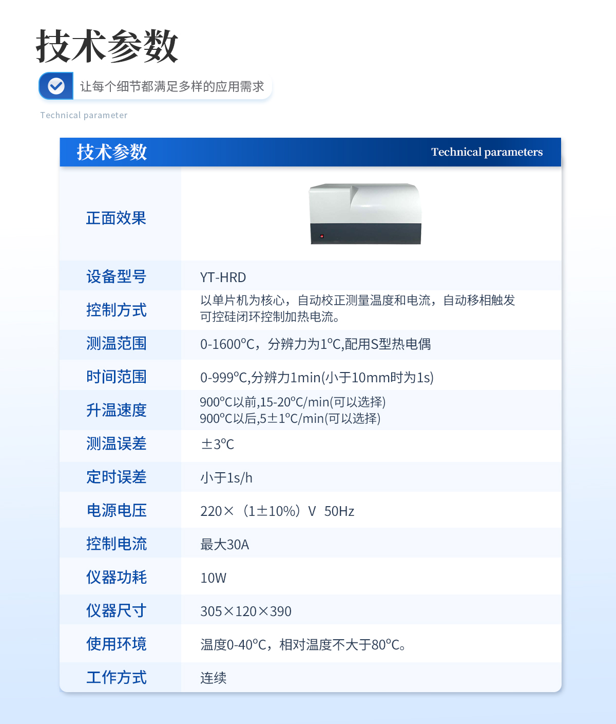 | 1、控制方式:以單片機(jī)為核心,自動校正測量溫度和電流,自動移相觸發(fā)可控硅閉環(huán)控制加熱電流。 | 2、測溫范圍:0-1600oC,分辨力為1oC,配用S型熱電偶. | 3、時間范圍:0-999oC,分辨力1min(小于10mm時為1s) | 4、升溫速度:900oC以前,15-20oC/min(可以選擇).900oC以后,5±1oC/min(可以選擇) | 5、測溫誤差:±3oC | 6、定時誤差:小于1s/h | 7、電源電壓:220×(1±10%)V 50Hz | 8、控制電流:**30A | 9、儀器功耗:10W | 10儀器尺寸(mm):305×120×390 | 11、使用環(huán)境:溫度0-40oC,相對溫度不大于80oC | 12、工作方式:連續(xù) |