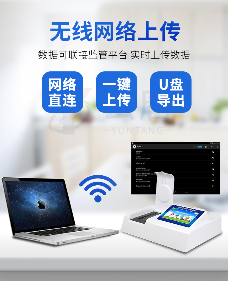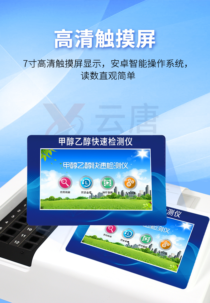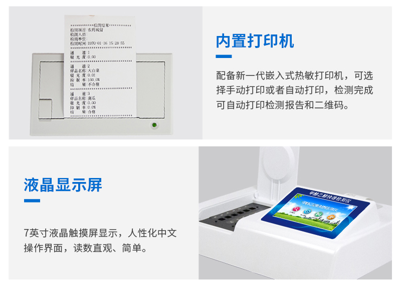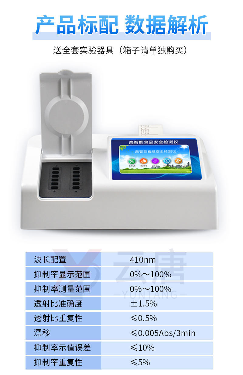 | 儀器采用臺式一體化系統(tǒng)檢測技術,將分光光度模塊、新型農殘檢測模塊、數(shù)字化管理模塊、無線通訊模塊高度集成于一體,支持檢測200種食品安全檢測項目,同時預留升級檢測方法。 | 儀器檢測模塊標準化、智能化,可隨意自由組合。檢測箱體內置多個標準檢測單元,檢測模塊可以調整配置。 | 儀器采用全新安卓智能系統(tǒng),主控芯片采用 ARM Cortex-A7,RK3288/4核處理器,10.1寸高清液晶觸摸豎屏,更加**的UI交互界面,運轉快捷;儀器配備無線通信模塊: 4G(APN)通訊模塊、Wifi模塊,藍牙傳輸,同時具有雙USB接口以及RJ45接口能以多種方式實現(xiàn)數(shù)據(jù)保存和數(shù)據(jù)傳輸功能。 | 創(chuàng)新檢測模式: | ★檢測通道:≥12通道;采用精密旋轉比色池設計,使用同芯片同光源校準精度,解決不同光源之間的誤差值。1-12通道間誤差0.1%。(***:**202022821055.2) | ★儀器具有自動識別比色皿檢測功能,即:將樣品比色皿放入儀器后,點擊樣品檢測,儀器自動識別比色皿進行通道檢測。 | 進口高精光源: | 高精度進口四波長冷光源,通道配置 410、520、590、630nm 波長光源,一個光源芯片驅動一個光源,誤差極小,每臺設備單獨**校準光源,**比對,同時參照四種不同波段光源全方位覆蓋市面上99%的農殘食品項目檢測。 | 智能化操作系統(tǒng): | 便捷操作系統(tǒng):設備檢測時可在同一檢測界面自動對應相關檢測通道一次性選擇1-12個樣品名稱,無須退出界面,節(jié)省操作時間。 | 數(shù)據(jù)集成系統(tǒng):設備首頁自動統(tǒng)計檢測數(shù)據(jù)包含:周檢測數(shù)據(jù)、月檢測數(shù)據(jù),全部檢測總數(shù)量,均包含檢測總數(shù),合格數(shù),不合格數(shù),以及相關柱形分析圖,對各項檢測數(shù)據(jù)清晰掌握,無需電腦查詢,更加快捷直觀。 | 項目預設系統(tǒng):支持添加單個及多個相同或不相同的任務預設,一鍵快速調取,每一個任務分別可以設置不同的樣品、批次、編號、來源、備注、抽樣信息、檢測信息、受檢信息、復核信息等更多信息。無縫鏈接平臺和APP實時查看下發(fā)任務。 | 數(shù)據(jù)監(jiān)管系統(tǒng):同步對接監(jiān)管平臺,數(shù)據(jù)可局域網和互聯(lián)網數(shù)據(jù)上傳,檢測結果可選擇直接傳至食品安全監(jiān)管平臺。集成OSS輸出存儲服務、區(qū)分設備定向管理應用,進行區(qū)域食品安全監(jiān)管及大數(shù)據(jù)分析處理與數(shù)據(jù)統(tǒng)計,檢測區(qū)域食品安全長短期動態(tài),達到食品安全問題預估、預警。 | 自定義打印系統(tǒng):內置全新打印系統(tǒng),新創(chuàng)自定義打印方式,可按需靈活設置開啟或關閉:產品合格證(國家農業(yè)部標準要求),二維碼,抽樣信息、檢測信息,受檢信息、復核信息、抽樣日期、檢測日期等信息的打印。 | 系統(tǒng)遠程更新功能:可定向分客戶分儀器更新系統(tǒng),按照不同客戶后期實際需求添加項目,無需機器返廠,即可遠程實時升級全新系統(tǒng),節(jié)省時間成本及避免運輸造成設備損壞。 | 儀器主機采用一體化防水、抗壓、防撞擊、防腐蝕箱體設計,同時配備交直流供電,可連接車載電源,可選配大容量充電鋰電池,滿足現(xiàn)場野外檢測需求。 | 安全證書,放心保障:儀器具有中國計量科學研究院校準證書,權威認證。 |