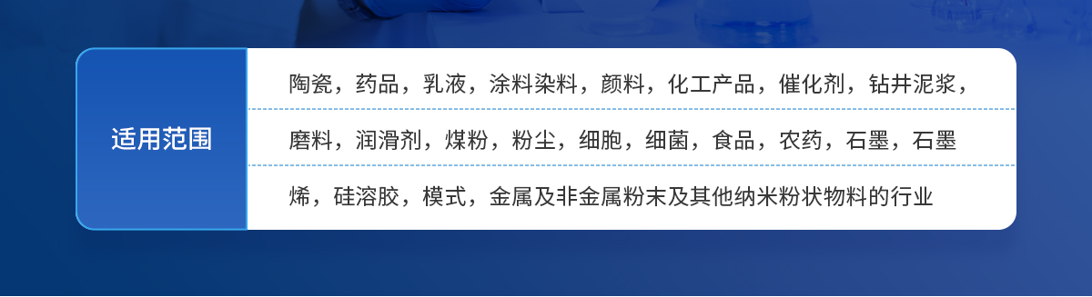 YT-QJL-2008A廣泛應(yīng)用于水泥、陶瓷、藥品、乳液、涂料、染料、顏料、填料、化工產(chǎn)品、催化劑、鉆井泥漿、磨料、潤(rùn)滑劑、煤粉、泥砂、粉塵、細(xì)胞、細(xì)菌、食品、添加劑、農(nóng)藥、炸藥、石墨、感光材料、燃料、墨汁、金屬與非金屬粉末、碳酸鈣、高嶺土、水煤漿及其他粉狀物料。