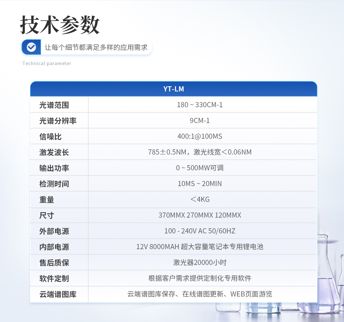 規(guī)格:YT-LM標準版 光譜范圍:180 ~ 3300cm-1 光譜分辨率:9cm-1 信噪比:400:1@100ms 激發(fā)波長:785+0.5nm,激光線寬< 0.06 nm 輸出功率:0~ 500mW可調(diào) 檢測時間:10ms ~ 20min 重量:<4kg 尺寸:370mmx 270mmx 120mm 外部電源:100-240V AC 50/60Hz 內(nèi)部電源:12V 8000mAH 超大容量筆記本專用鋰電池 售后質保:激光器20000小時 軟件定制:根據(jù)客戶需求提供定制化專用軟件 云端譜圖庫:支持云端譜圖保存、 在線譜圖更新、WEB 頁面瀏覽