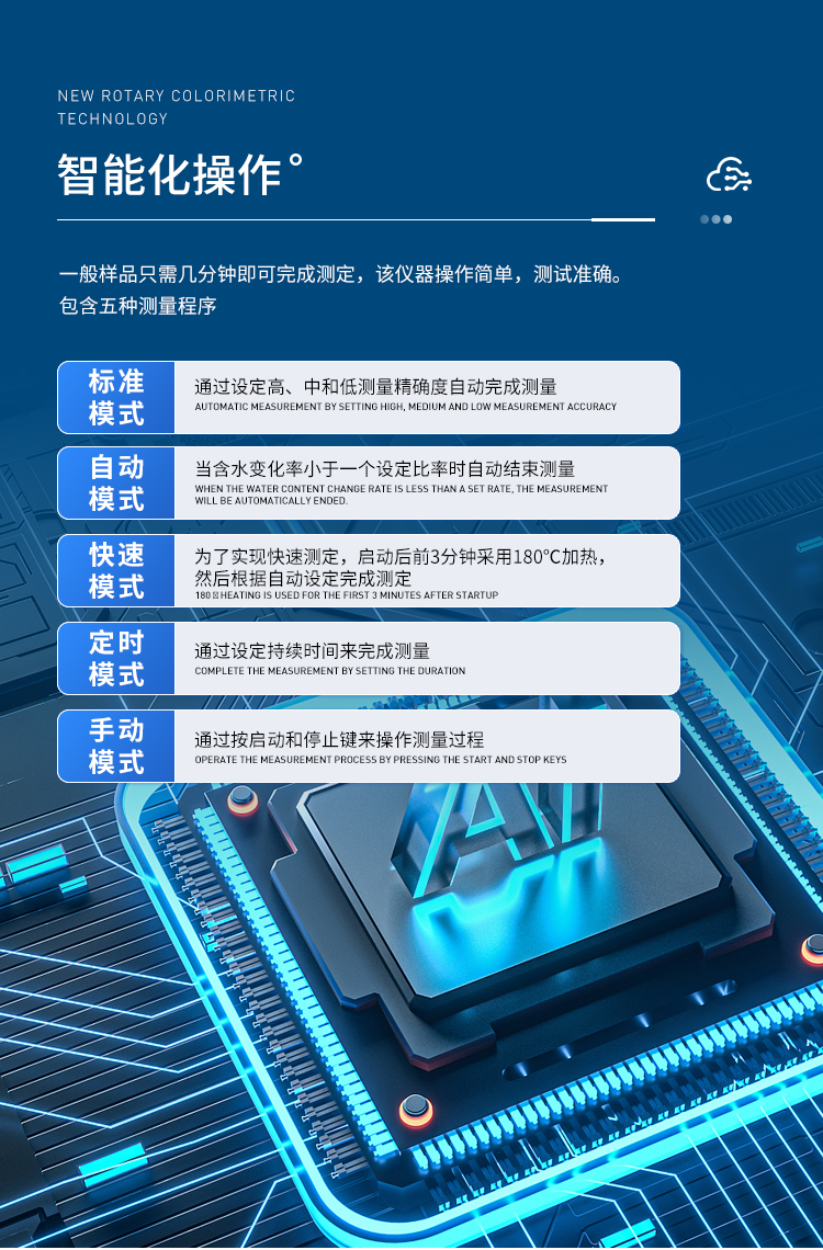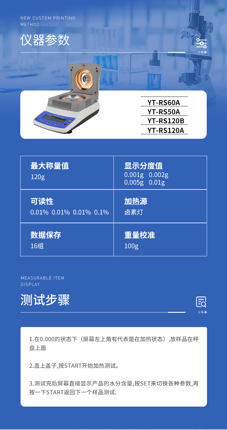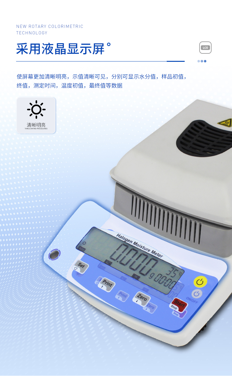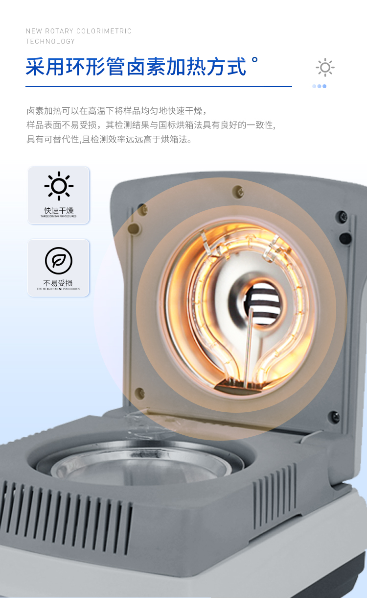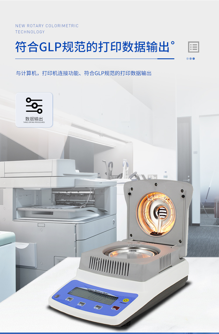 環(huán)狀的鹵素燈確保樣品得到均勻加熱,操作簡便、測量準確。鹵素水分測定儀在測量樣品重量的同時,儀器采用環(huán)形管鹵素加熱方式,快速干燥樣品,在干燥過程中,水分儀持續(xù)測量并即時顯示樣品丟失的水分含量%,干燥程序完成后,*終測定的水分含量值被鎖定顯示。與國際烘箱加熱法相比,鹵素加熱可以在高溫下將樣品均勻地快速干燥,樣品表面不易受損,其檢測結(jié)果與國標烘箱法具有良好的一致性,具有可替代性,且檢測效率遠遠高于烘箱法。智能化操作,一般樣品只需幾分鐘即可完成測定。該儀器操作簡單,測試準確,顯示部分采用液晶顯示屏-使屏幕更加清晰明亮,示值清晰可見,分別可顯示水分值,樣品初值,終值,測定時間,溫度初值,*終值等數(shù)據(jù),并具有與計算機,打印機連接功能、符合GLP規(guī)范的打印數(shù)據(jù)輸出。