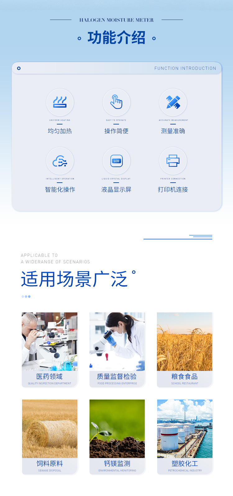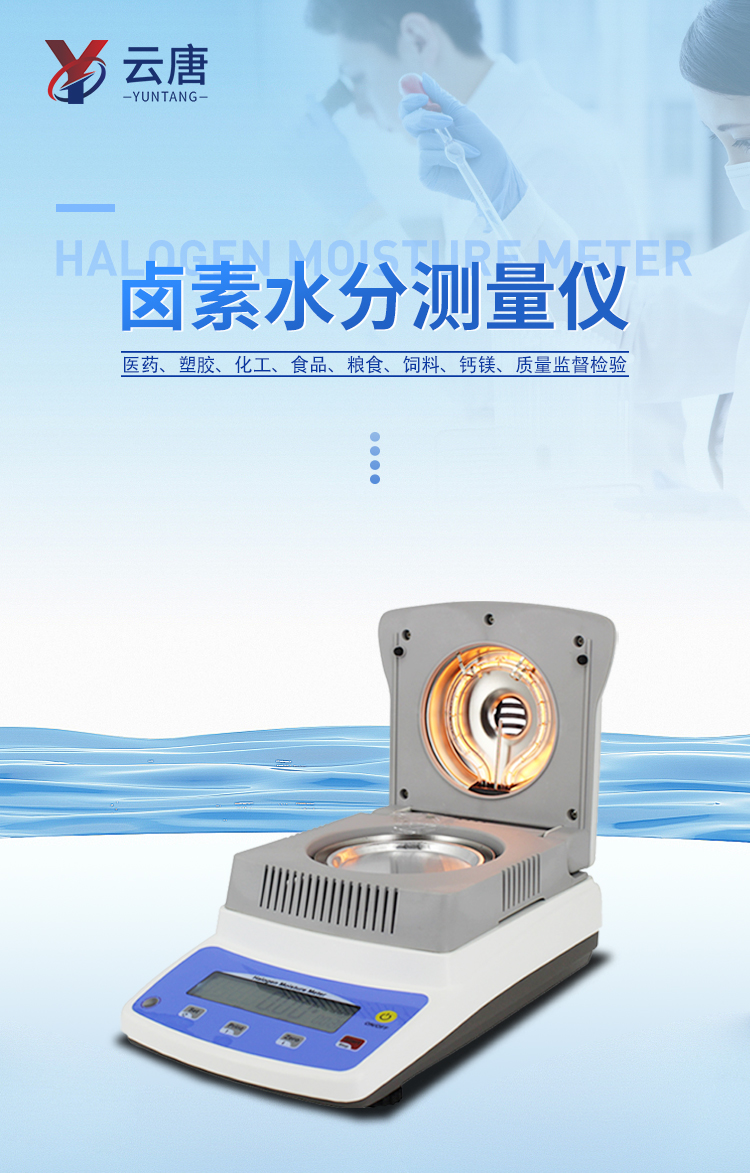 可廣泛應用于一切需要快速測定水分的行業(yè),如醫(yī)藥,糧食、飼料、種子,菜籽,脫水蔬菜、煙草,化工,茶葉,食品、肉類以及紡織,農(nóng)林、造紙、橡膠、塑膠、紡織等行業(yè)中的實驗室與生產(chǎn)過程中。同時滿足固體、顆粒、粉末、膠狀體及液體含水率的測定要求