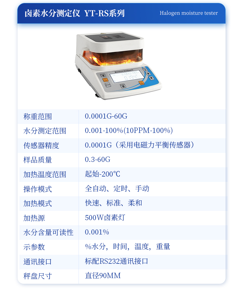 | 型號 :YT-RS120A,**稱量值:120g ,顯示分度值:0.001g,可 讀 性 :0.01% | 型號 : YT-RS120B,**稱量值:120g ,顯示分度值: 0.002g ,可 讀 性 :0.01% | 型號 : YT-RS50A,**稱量值:120g ,顯示分度值: 0.005g ,可 讀 性 :0.01% | 型號 : YT-RS60A,**稱量值:120g ,顯示分度值: 0.01g ,可 讀 性 :0.1% | 加 熱 源 鹵素燈 溫度設置 室溫- 180℃ | 數(shù)據(jù)保存 16組 重量校準 100g | 稱盤尺寸 φ110 (mm) | 外形尺寸 (D*W*H)330*205*165(mm) | 包裝尺寸 (D*W*H)410*315*335 (mm) | 凈 重 3.2kg 毛 重 4.6kg |