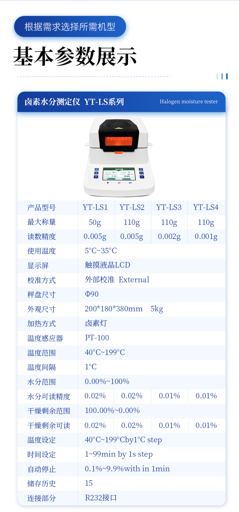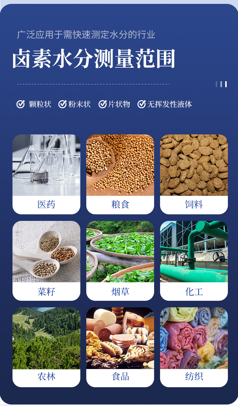 鹵素水分儀用于如:醫(yī)藥、塑膠、化工、食品、糧食、飼料、鈣鎂、質量監(jiān)督檢驗、等各行業(yè)中的生產(chǎn)過與實驗過程中, 具有良好重現(xiàn)性的水分測定結果;清晰的按鍵和水分測定信息顯示,實現(xiàn)直觀簡單地儀器操作;創(chuàng)新的預先存儲的16種不同樣品水分測定方法數(shù)據(jù)庫,使得測試方法的開發(fā)快速、簡單