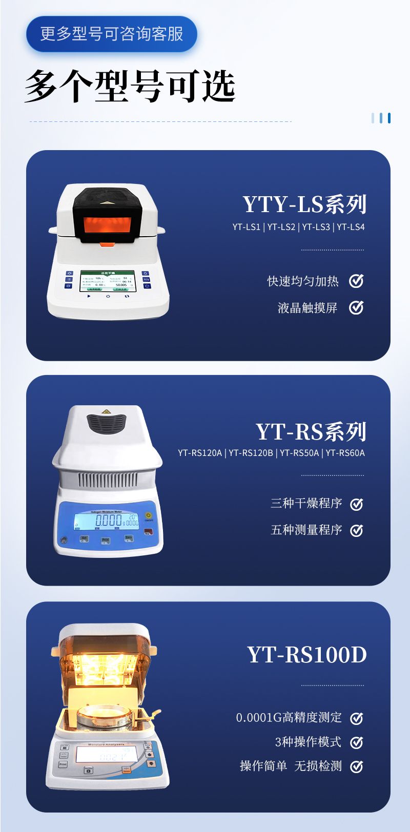 | 產(chǎn)品型號 Model:YT-LS1,**稱量 Range(g):50g,讀數(shù)精度 Readability(g): 0.005g,水分可讀精度 Moisturereadability:0.02%,干燥剩余可讀 Dryresidualreadability:0.02% | 產(chǎn)品型號 Model:YT-LS2,**稱量 Range(g):110g,讀數(shù)精度 Readability(g): 0.005g,水分可讀精度 Moisturereadability:0.02%,干燥剩余可讀 Dryresidualreadability:0.02% | 產(chǎn)品型號 Model:YT-LS3,**稱量 Range(g):110g,讀數(shù)精度 Readability(g): 0.002g,水分可讀精度 Moisturereadability:0.01%,干燥剩余可讀 Dryresidualreadability:0.01% | 產(chǎn)品型號 Model:YT-LS4,**稱量 Range(g):110g,讀數(shù)精度 Readability(g): 0.001g, 水分可讀精度 Moisturereadability :0.01%,干燥剩余可讀 Dryresidualreadability: 0.01% | 使用溫度 OperatingTemp.Range:5°C---35°C | 顯示屏 Display :觸摸液晶LCD | 校準(zhǔn)方式 Calibration:外部校準(zhǔn) External | 秤盤尺寸 Pansize(mm): Φ90 | 外觀尺寸 Dimensions(W*L*H) :200*180*380 | 產(chǎn)品重量 Weight(Kg):5 | 加熱方式 Heatsoure:鹵素?zé)? Halogenlamp | 溫度感應(yīng)器 Temp.sensor: PT-100 | 溫度范圍 Temp.range:40°C---199°C | 溫度間隔 Temp.step:1°C | 水分范圍 Moisturerange :0.00%---100% | 干燥剩余范圍 Dryresidualrange:100.00%---0.00% | ATRO:100%---999% | ATRO:0%---999% | 溫度設(shè)定 Temperaturesetting:40°C---199°Cby1°Cstep | 時間設(shè)定 Timesetting:1---99min by 1s step | 自動停止 Autostop :0.1%---9.9%within 1min | 儲存歷史 Nuberofstorage:15 | 加熱部分 Heater:220V+15% 50Hz115V+15% 400W | 連接部分:R232接口 | 天平部分 Balance: External power supply Output:9V Lnput:220V+15%50Hz |