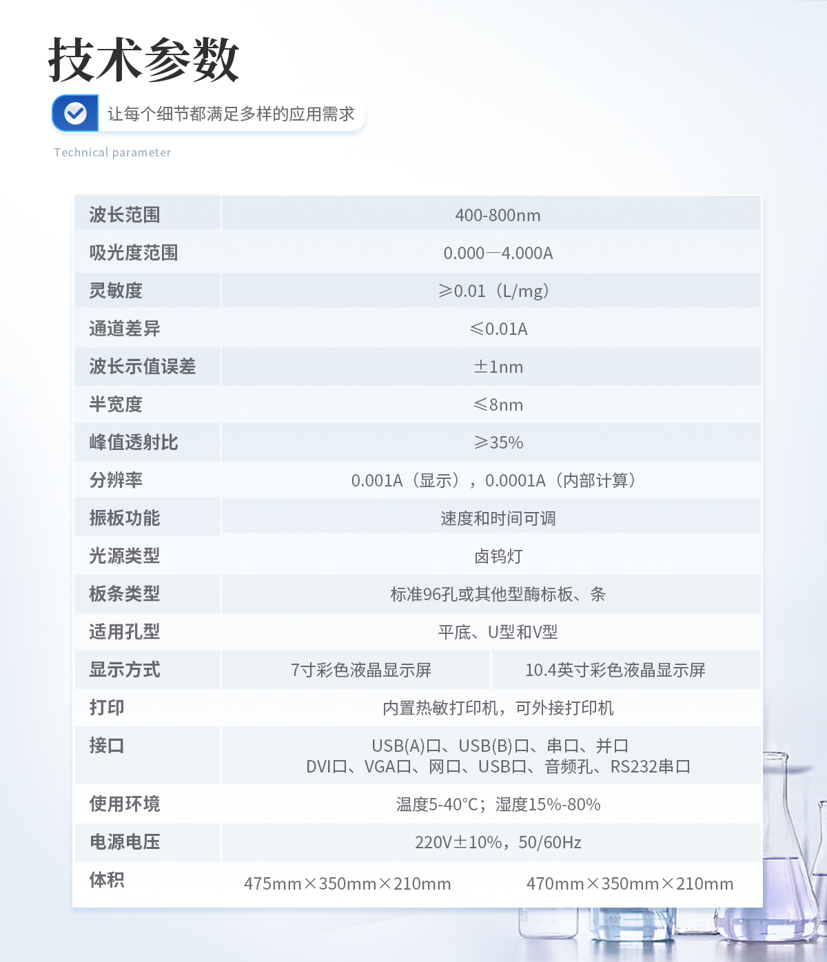 | 波長范圍: 400-800nm | *濾光片配置:10個濾光片位置,標配405nm、450nm、492nm、630nm,選配6定制波長 | 吸光度范圍:0.000―4.000A | *光通道數(shù):8通道光路檢測,另設(shè)一個獨立參比通道 | *示值穩(wěn)定性:≤±0.002A或≤0.5%T/10min。 | *示值誤差(準確性):≤±0.005A或±0.2%T | *重復(fù)性:≤0.2%或≤0.2%T。 | 靈敏度:≥0.01(L/mg)。 | 通道差異:≤0.01A。 | 波長示值誤差:±1nm | 半寬度:≤8nm | 峰值透射比:≥35% | 分辨率:0.001A(顯示),0.0001A(內(nèi)部計算) | *讀板速度:單波長≤3秒/96孔,雙波長≤6秒/96孔 | 振板功能:速度和時間可調(diào) | 光源類型:鹵鎢燈 | 板條類型:標準96孔或其他型酶標板、條 | 適用孔型:平底、U型和V型 | *顯示方式:10.4英寸彩色液晶顯示屏顯示 | 輸入方式:觸摸屏輸入,可選配鼠標和鍵盤 | 打印:內(nèi)置熱敏打印機,可外接打印機 | 接 口:DVI口、VGA口、網(wǎng)口、USB口、音頻孔、RS232串口 | 使用環(huán)境:溫度5-40℃;濕度15%-80% | 電源電壓:220V±10%,50/60Hz | 體積:470mm×350mm×210mm(長×寬×高) | 重量:11.5Kg |