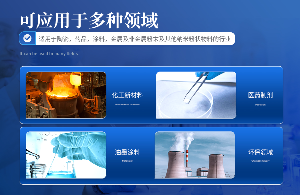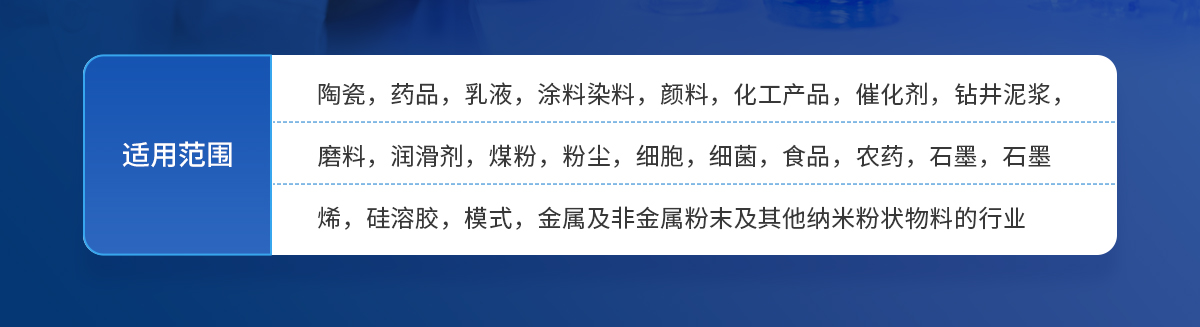 陶瓷,藥品,乳液,涂料染料,顏料,化工產(chǎn)品,催化劑,鉆井泥漿,磨料,潤滑劑,煤粉,粉塵,細(xì)胞,細(xì)菌,食品,農(nóng)藥,石墨,石墨烯,硅溶膠,模式,金屬及非金屬粉末及其他納米粉狀物料的行業(yè)。