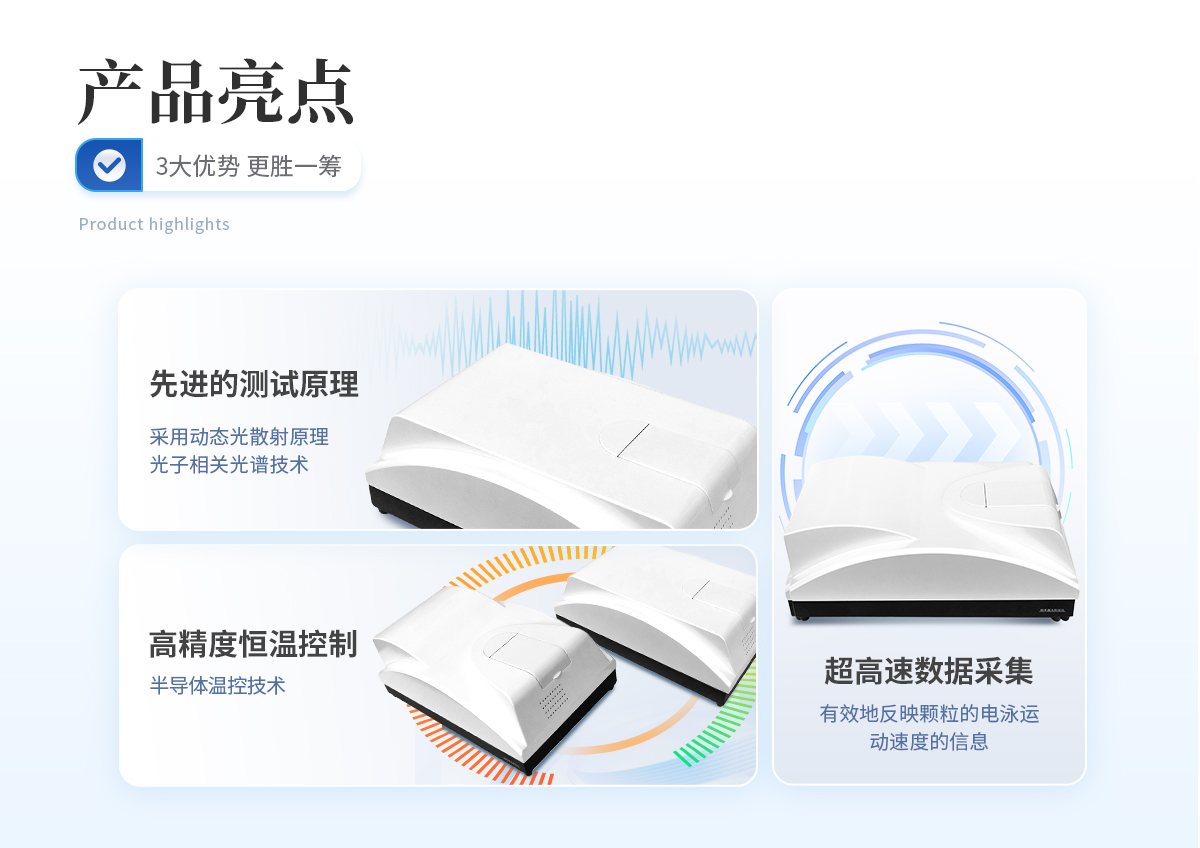 | 雙波長激光器,全自動(dòng)切換 獨(dú)家采用雙波長(λ= 405nm、λ= 532nm)激光器搭建而成的光路系統(tǒng),相關(guān)譜探測系統(tǒng)不僅體積小,而且具有很強(qiáng)的抗干擾能力,從而保證了測試的穩(wěn)定性;對某些具有吸光屬性,傳統(tǒng)單一波長激光器無法檢測的樣品,可進(jìn)行有效檢測; | **的測試原理 采用動(dòng)態(tài)光散射原理和光子相關(guān)光譜技術(shù),根據(jù)顆粒在液體中的布朗運(yùn)動(dòng)速度測定顆粒大小。大小顆粒運(yùn)動(dòng)速度不同,激光照射這些顆粒,不同大小的顆粒將使散射光發(fā)生快慢不同的漲落起伏。光子相關(guān)光譜法就根據(jù)特定方向的光子漲落起伏分析其顆粒大小。 | 超高速數(shù)據(jù)采集 使用PCS技術(shù)測定納米級顆粒大小,必須能夠分辨納秒級信號起伏。本儀器的核心部件采用我公司研制的CR256數(shù)字相關(guān)器,具有識別8ns的**分辨能力和**的信號處理速度,其數(shù)據(jù)處理速度高達(dá)162M。它能實(shí)時(shí)完成動(dòng)態(tài)散射光強(qiáng)的采集和自相關(guān)函數(shù)運(yùn)算,從而有效地反映不同大小顆粒的動(dòng)態(tài)分光散射信息,為測試結(jié)果的準(zhǔn)確性典型基礎(chǔ)。 | 高靈敏度和信噪比 采用專業(yè)級高性能光電倍增管,對光子信號具有**的靈敏度和信噪比。 | 高精度雙溫控保護(hù)系統(tǒng) 采用半導(dǎo)體溫控技術(shù),樣品池溫控系統(tǒng)和激光器溫控系統(tǒng)精度高達(dá)±0.1℃,使被測樣品和激光器光源在整個(gè)測試過程中都處于恒溫狀態(tài),避免溫度變化對不測試結(jié)果的影響,確保測試準(zhǔn)確和重復(fù); | 穩(wěn)定的光路系統(tǒng) 采用光纖技術(shù)搭建而成的光路系統(tǒng),使光子相關(guān)譜探測系統(tǒng)不僅體積小,而且具有很強(qiáng)的抗干擾能力,從而保證了測試的穩(wěn)定性。 |