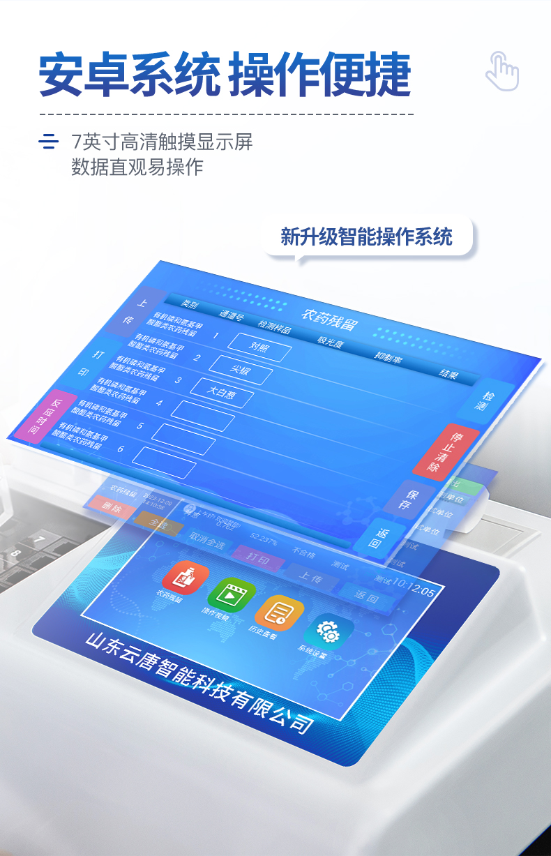 | 乙酰膽堿酯酶和丁酰膽堿酯酶試劑均可以使用,符合國家標準和農(nóng)業(yè)部標準的要求。 | 自動判斷樣品是否合格,檢測結果更加直觀。 | 儀器具有100多種蔬菜名稱菜單庫,分類管理,并可按需添加或刪除蔬菜名,編輯蔬菜名稱,可直接打印出蔬菜名稱。 | 檢測通道:12個檢測通道,可以同時測試多個樣品,循環(huán)檢測,即放即檢,每個樣品由程序控制分別獨立工作,不會互相干擾。 | 智能操作系統(tǒng),采用更加人性化操作,主控采用多核處理器,主頻1.88Ghz,運轉速度更快速,穩(wěn)定性更強。 | 顯示方式:7英寸高靈敏真彩觸摸屏顯示,人性化中文操作界面,讀數(shù)直觀、簡單。 | 打印機采用串口5v打印,可選擇手動打印或者自動打印,三分鐘出打印結果,打印格式為檢測人姓名、吸光度差值、檢測時間、檢測機構、樣品名稱及結果判定。 | 光源采用進口超高亮發(fā)光二極管,具有低功耗、高精度、穩(wěn)定性強、光源可控可以關掉不使用的光源,響應速度快等優(yōu)點。 | 智能恒流穩(wěn)壓,光強自動校準,長時間連續(xù)工作光源無溫漂現(xiàn)象。 | 儀器具有GPRS遠傳功能,可插手機卡實現(xiàn)數(shù)據(jù)遠傳平臺,wifi聯(lián)網(wǎng)功能,可將數(shù)據(jù)快速上傳電腦,進行數(shù)據(jù)管理與統(tǒng)計。 | 采用USB2.0接口設計,方便數(shù)據(jù)的存貯和移動,并可隨時與計算機直接相連,并且可用計算機控制儀器。實現(xiàn)數(shù)據(jù)查詢、瀏覽、分析、統(tǒng)計、打印等。 | 智能化程度高,儀器具有自檢功能:具有開機自檢和調(diào)零功能,具有自動檢測重復性功能 | 儀器具有自身保護功能,可設置用戶名及密碼,防止非工作人員操作等。 | 采用DC12v直流供電,安全系統(tǒng)更高,并且配備6A鋰電池充電器。 | 儀器具有重新校準、鎖定、恢復出廠設置功能。 |