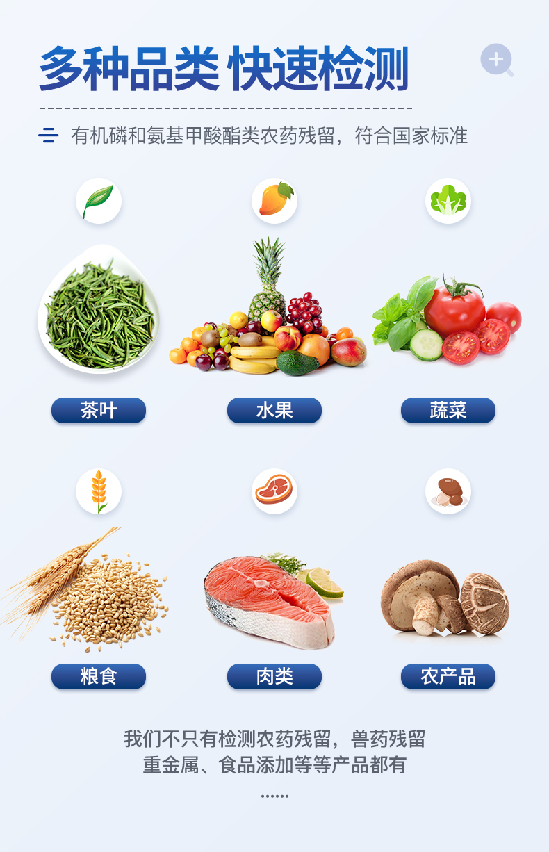 廣泛應用于主要用于蔬菜、水果、茶葉、糧食、農(nóng)副產(chǎn)品等食品中有機磷和氨基甲酸酯類農(nóng)藥殘留的快速檢測;此外還可用于果蔬茶生產(chǎn)基地和農(nóng)貿(mào)批發(fā)銷售市場現(xiàn)場檢測,餐館、學校、食堂、家庭果蔬加工前的安全速測等。