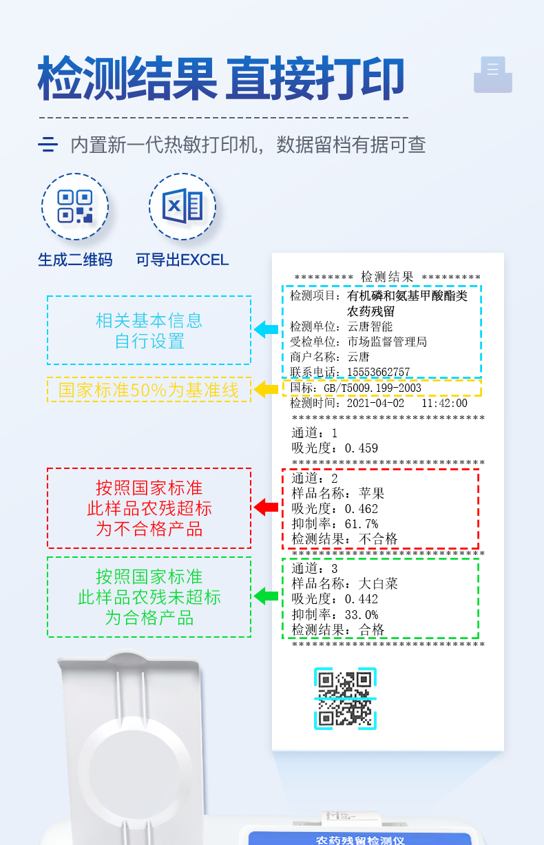 | 乙酰膽堿酯酶和丁酰膽堿酯酶試劑均可以使用,符合國家標(biāo)準(zhǔn)和農(nóng)業(yè)部標(biāo)準(zhǔn)的要求。 | 自動(dòng)判斷樣品是否合格,檢測結(jié)果更加直觀。 | 儀器具有100多種蔬菜名稱菜單庫,分類管理,并可按需添加或刪除蔬菜名,編輯蔬菜名稱,可直接打印出蔬菜名稱。 | 檢測通道:20個(gè)檢測通道,可以同時(shí)測試多個(gè)樣品,循環(huán)檢測,即放即檢,每個(gè)樣品由程序控制分別獨(dú)立工作,不會(huì)互相干擾。 | 智能操作系統(tǒng),采用更加人性化操作,主控采用多核處理器,主頻1.88Ghz,運(yùn)轉(zhuǎn)速度更快速,穩(wěn)定性更強(qiáng)。 | 顯示方式:7英寸高靈敏真彩觸摸屏顯示,人性化中文操作界面,讀數(shù)直觀、簡單。 | 打印機(jī)采用串口5v打印,可選擇手動(dòng)打印或者自動(dòng)打印,三分鐘出打印結(jié)果,打印格式為檢測人姓名、吸光度差值、檢測時(shí)間、檢測機(jī)構(gòu)、樣品名稱及結(jié)果判定。 | 光源采用進(jìn)口超高亮發(fā)光二極管,具有低功耗、高精度、穩(wěn)定性強(qiáng)、光源可控可以關(guān)掉不使用的光源,響應(yīng)速度快等優(yōu)點(diǎn)。 | 智能恒流穩(wěn)壓,光強(qiáng)自動(dòng)校準(zhǔn),長時(shí)間連續(xù)工作光源無溫漂現(xiàn)象。 | 儀器具有GPRS遠(yuǎn)傳功能,可插手機(jī)卡實(shí)現(xiàn)數(shù)據(jù)遠(yuǎn)傳平臺(tái),wifi聯(lián)網(wǎng)功能,可將數(shù)據(jù)快速上傳電腦,進(jìn)行數(shù)據(jù)管理與統(tǒng)計(jì)。 | 采用USB2.0接口設(shè)計(jì),方便數(shù)據(jù)的存貯和移動(dòng),并可隨時(shí)與計(jì)算機(jī)直接相連,并且可用計(jì)算機(jī)控制儀器。實(shí)現(xiàn)數(shù)據(jù)查詢、瀏覽、分析、統(tǒng)計(jì)、打印等。 | 智能化程度高,儀器具有自檢功能:具有開機(jī)自檢和調(diào)零功能,具有自動(dòng)檢測重復(fù)性功能 | 儀器具有自身保護(hù)功能,可設(shè)置用戶名及密碼,防止非工作人員操作等。 | 采用DC12v直流供電,安全系統(tǒng)更高,并且配備6A鋰電池充電器。 | 儀器具有重新校準(zhǔn)、鎖定、恢復(fù)出廠設(shè)置功能。 |