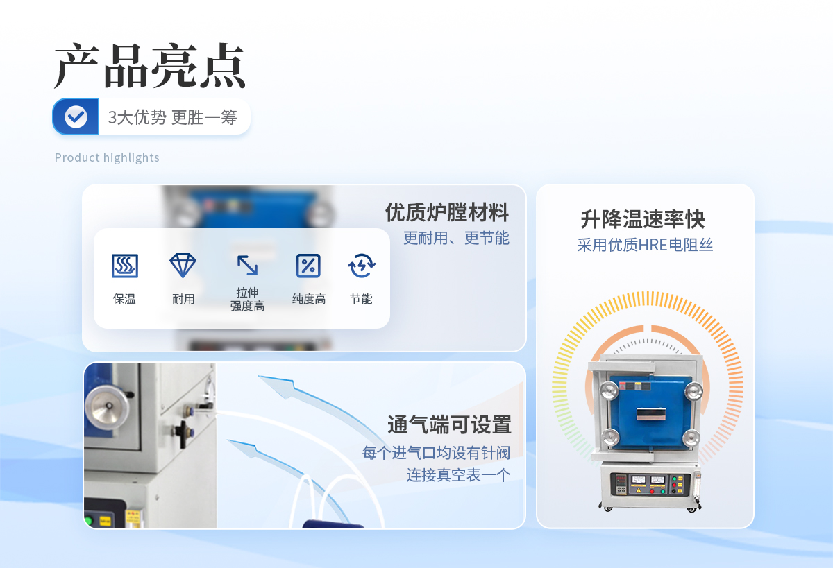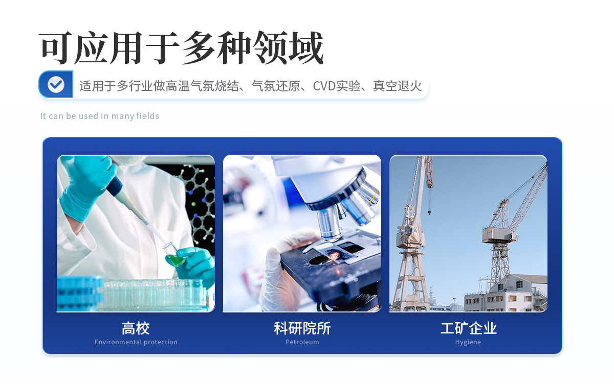 用于高校、科研院所、工礦企業(yè)做高溫氣氛燒結(jié)、氣氛還原、CVD實(shí)驗(yàn)、真空退火等。具有溫場(chǎng)均勻、升降溫速率快、節(jié)能、可通入多重氣體等特點(diǎn)。