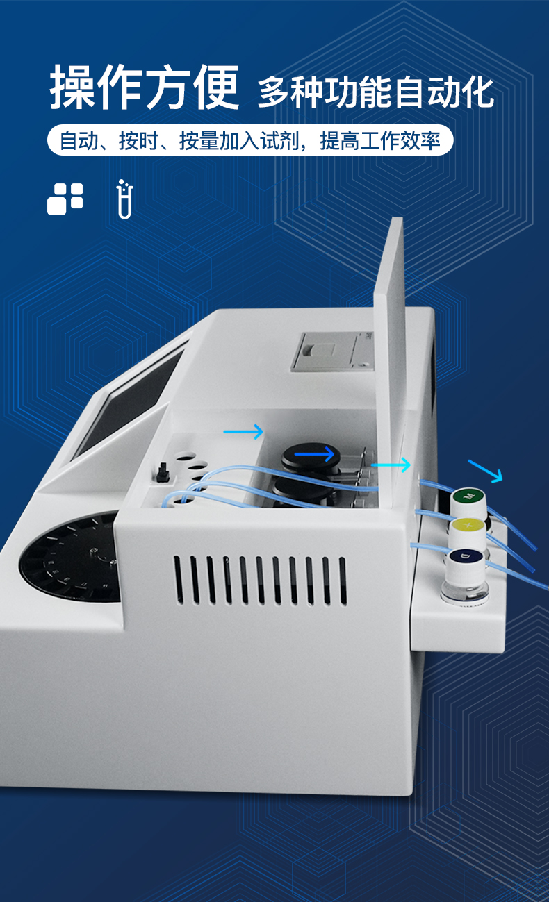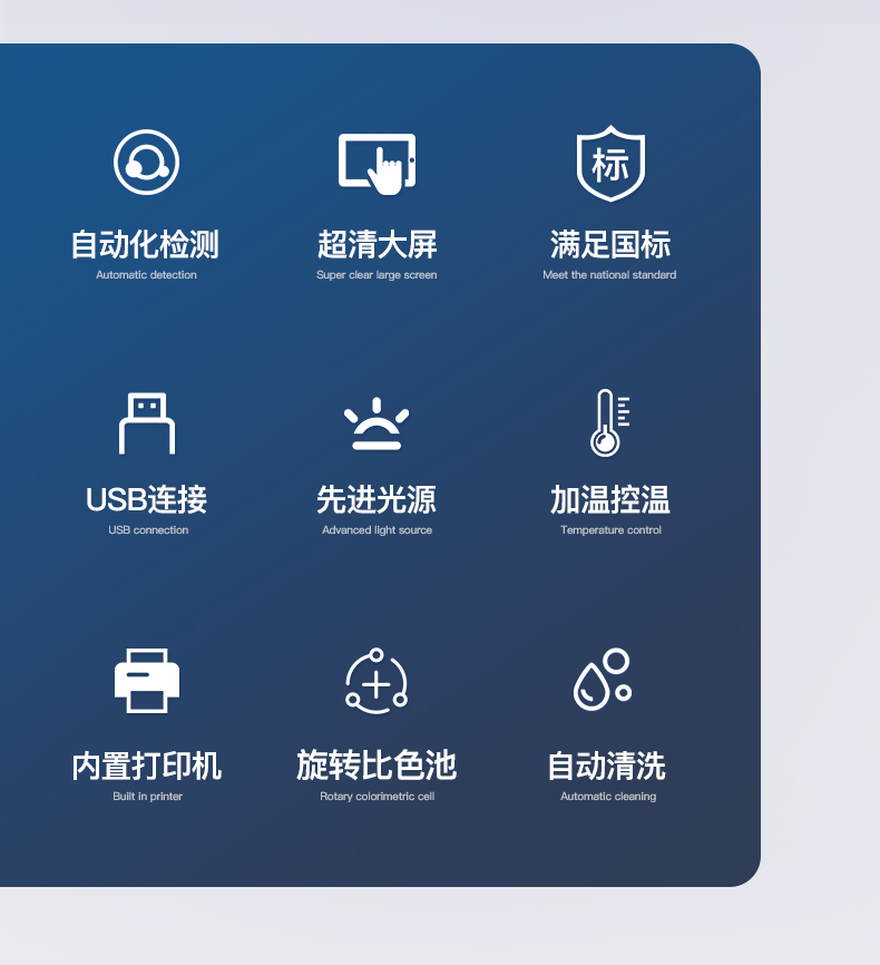 | 人性化界面,操作方便 | 儀器按照試劑要求自動、按時(shí)、按量加入試劑,提高工作效率 | 儀器自動對未正常放置的樣本或異常的樣本進(jìn)行檢查并提示 | 采用**的冷光源,保證了光源的穩(wěn)定性及數(shù)據(jù)的準(zhǔn)確性 | 大容量存儲器,能存儲12萬條數(shù)據(jù),滿足客戶需求 | 內(nèi)置微型熱敏打印機(jī),快速打印檢測結(jié)果,方便數(shù)據(jù)留存 | 可通過數(shù)據(jù)線連接電腦,將檢測的數(shù)據(jù)上傳至電腦端 | 儀器可自動清洗管路,避免試劑污染 | 儀器檢測消耗試劑量和常規(guī)儀器一致 | 儀器具有自動加溫溫控系統(tǒng) |