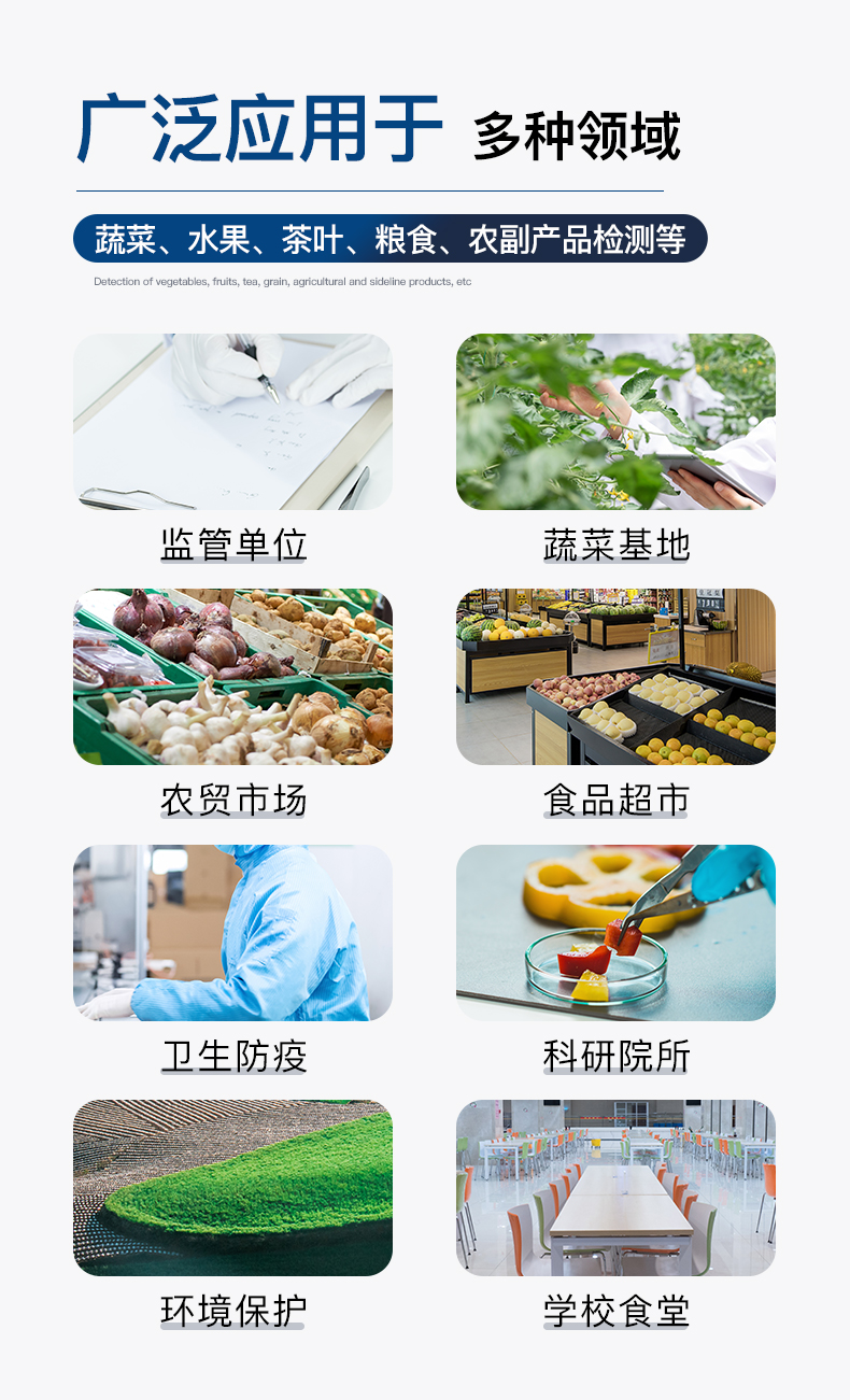 廣泛應(yīng)用于主要用于蔬菜、水果、茶葉、糧食、農(nóng)副產(chǎn)品等食品中有機(jī)磷和氨基甲酸酯類農(nóng)藥殘留的快速檢測;此外還可用于果蔬茶生產(chǎn)基地和農(nóng)貿(mào)批發(fā)銷售市場現(xiàn)場檢測,餐館、學(xué)校、食堂、家庭果蔬加工前的安全速測等,為廣大人民的生活安全提供保障。