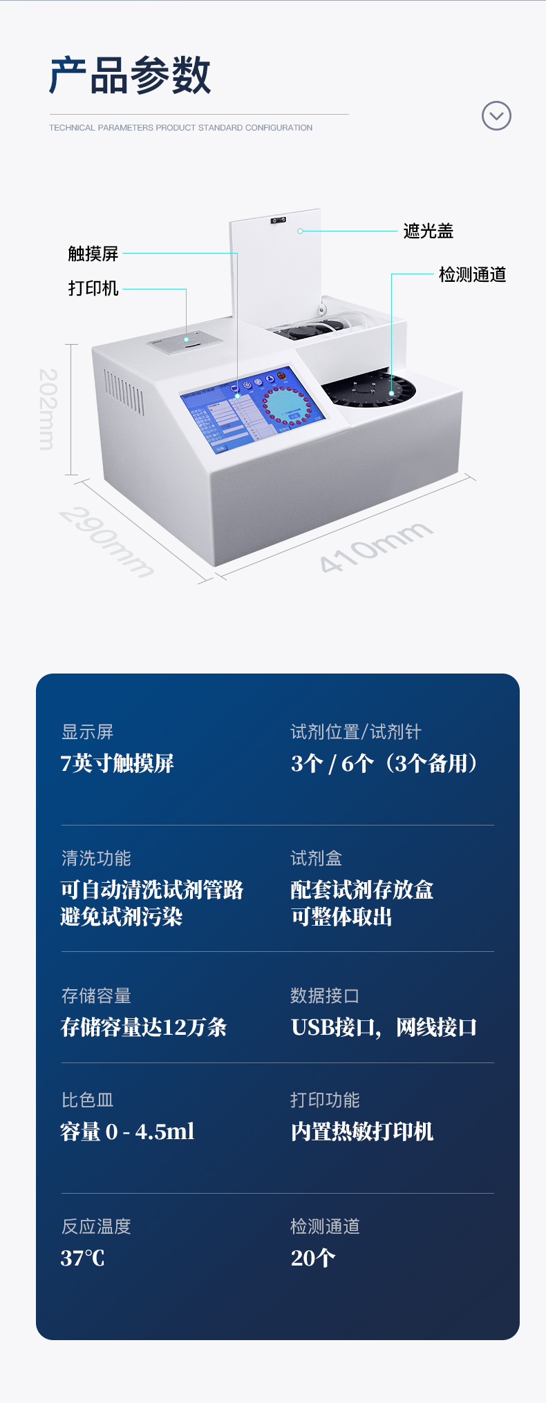 | 波長配置:410 | 試 劑 針:3根 | 檢測通道:20個(gè) | 反應(yīng)溫度:37℃,儀器具有自動加溫溫控系統(tǒng) | 觸 摸 屏:7寸觸摸屏,可單機(jī)操作 | 比 色 皿:容量 0 - 4.5ml | 試 劑 盒:配套試劑存放盒,可整體取出 | 清洗功能:可自動清洗試劑管路,避免試劑污染 | 加樣功能:儀器按照試劑要求自動、按時(shí)、按量加入試劑,提高工作效率 | 自動混勻:儀器測試過程中自動震蕩混勻保證試劑充分反應(yīng) | 實(shí)時(shí)監(jiān)控:儀器測試過程中顯示實(shí)時(shí)運(yùn)行狀態(tài) | 打印功能:內(nèi)置熱敏打印機(jī),可快速打印檢測結(jié)果,方便數(shù)據(jù)留存 | 數(shù)據(jù)存儲:大容量存儲器,能存儲12萬條數(shù)據(jù) | 數(shù)據(jù)接口:外接USB接口,網(wǎng)線接口 | 網(wǎng)絡(luò)連接:可連接有線網(wǎng)絡(luò)和無線wifi | 上位機(jī)軟件:儀器配套電腦端上位機(jī)軟件,可通過軟件進(jìn)行寫入?yún)?shù)及讀取數(shù)據(jù) | 樣本檢測:儀器自動對未正常放置的樣本或異常的樣本進(jìn)行檢查并報(bào)警提示 | 試劑檢測:儀器測試前和測試過程中時(shí)刻對試劑進(jìn)行檢查,檢查試劑是否缺失,如有異常儀器會進(jìn)行報(bào)警提示,對已經(jīng)加入試劑的樣本進(jìn)行正常測試,不影響測試結(jié)果,對未測試的樣本停止測試。 | 數(shù)據(jù)上傳:儀器數(shù)據(jù)可傳入電腦端,按照客戶需求進(jìn)行保存或打印 | 儀器重量:約7KG | 儀器尺寸:410mm*290mm*202mm |