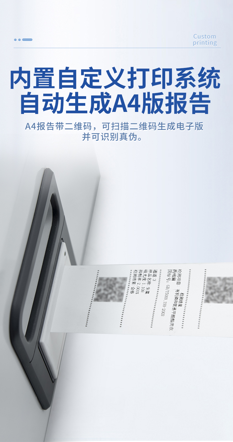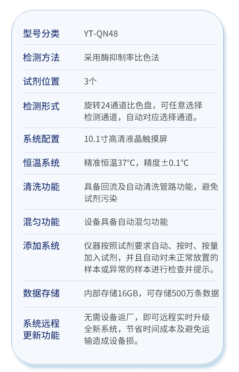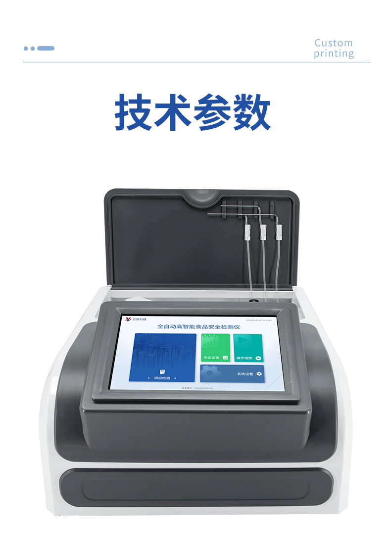 | 1. 試劑位置:3個 | 2. 檢測形式:旋轉(zhuǎn)48通道比色盤,可任意選擇檢測通道,自動對應選擇通道。 | 3. 系統(tǒng)配置:10.1寸高清液晶觸摸屏,采用ARM Cortex-A7,RK3288/4核處理器,運行內(nèi)存1GB。Android7.1.1 系統(tǒng)分辨率1280×800。 | 4.恒溫系統(tǒng):具有自動加溫溫控系統(tǒng),精準恒溫37℃,精度±0.1℃。 | 5.添加系統(tǒng):儀器按照試劑要求自動、按時、按量加入試劑,并且自動對未正常放置的樣本或異常的樣本進行檢查并提示。 | 6.清洗功能:儀器具備回流及自動清洗管路功能,避免試劑污染。 | 7.混勻功能:設備具備自動混勻功能。 | 8.光源校準:設備可自動校準,確保檢測準確度。 | 9.實時監(jiān)控:儀器測試過程中屏幕顯示運行狀態(tài),可實時查看。 | 10.數(shù)據(jù)存儲:內(nèi)部存儲16GB,可存儲500萬條數(shù)據(jù)。 | 11.樣品多選功能:設備具備樣品一鍵多選功能,選擇樣品自動匹配檢測通道。 | 12.項目預設:可提前設置單個及多個相同或不相同的檢測任務,可單次或者多次調(diào)取,減少檢測時間。 | 13.自定義打印系統(tǒng):內(nèi)置自定義打印系統(tǒng),可按需靈活設置開啟或關閉:產(chǎn)品合格證(國家農(nóng)業(yè)部標準),二維碼,抽樣信息、檢測信息,受檢信息等信息的打印。 | 14.A4版本報告打印功能:設備可自動生成A4版報告,A4報告帶二維碼,可掃描二維碼生成電子版,并可識別真?zhèn)巍?/td> | 15.傳輸方式:儀器配備無線通信模塊: 4G(APN)通訊模塊、Wifi模塊,藍牙傳輸模塊,同時具有USB接口以及RJ45接口能以多種方式實現(xiàn)數(shù)據(jù)保存和數(shù)據(jù)傳輸功能,設備數(shù)據(jù)可以同步上傳至平臺。 | 16.數(shù)據(jù)監(jiān)管系統(tǒng):設備自帶監(jiān)管平臺,并可同步對接監(jiān)管平臺,數(shù)據(jù)可局域網(wǎng)和互聯(lián)網(wǎng)數(shù)據(jù)上傳,檢測結(jié)果可直接傳至食品安全監(jiān)管平臺。達到食品安全問題預估、預警。 | 17.系統(tǒng)遠程更新功能:無需設備返廠,即可遠程實時升級全新系統(tǒng),節(jié)省時間成本及避免運輸造成設備損。 |
