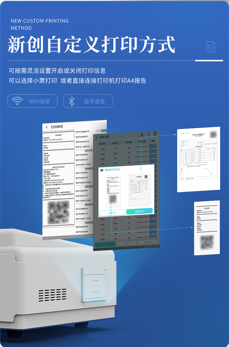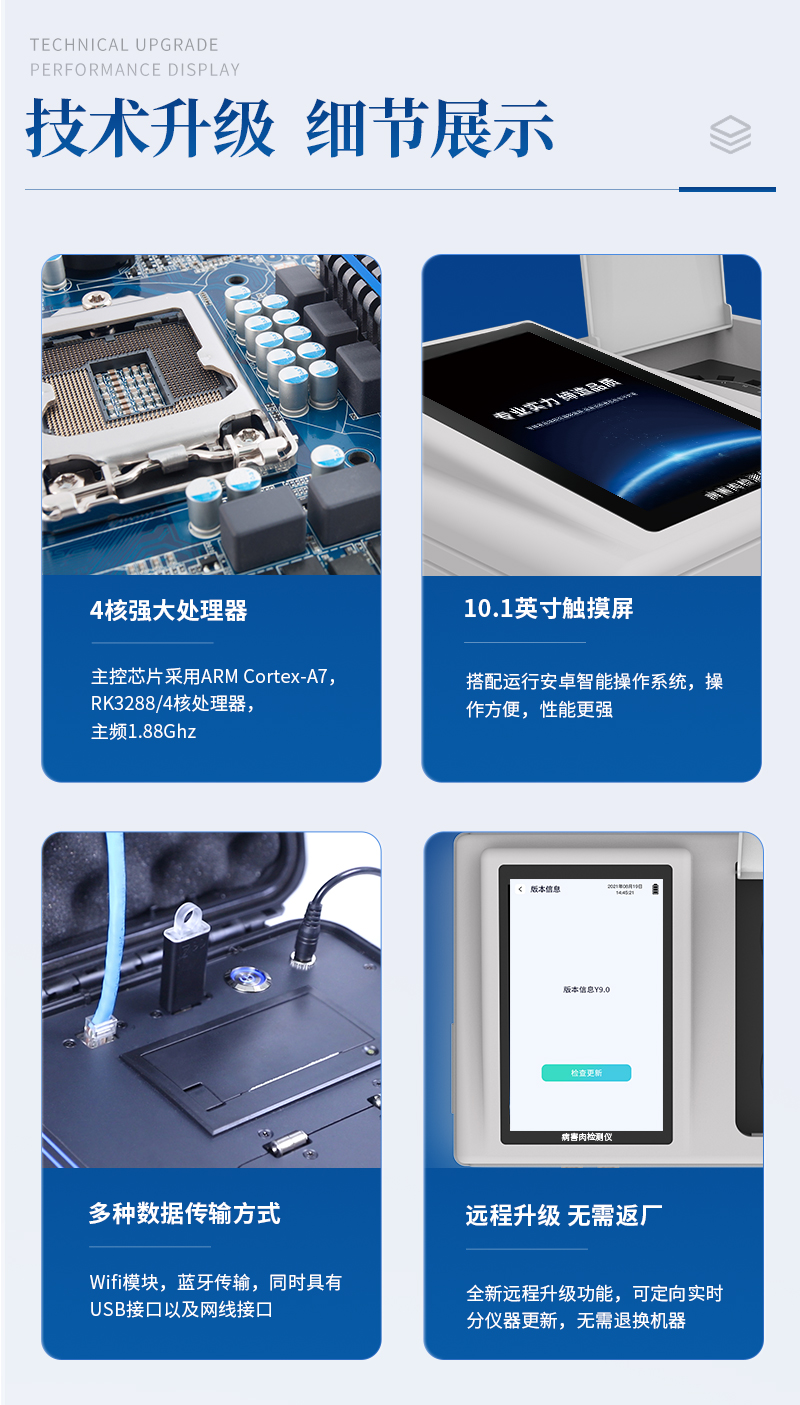 | 儀器采用臺(tái)式一體化系統(tǒng)檢測(cè)技術(shù),將分光光度模塊、數(shù)字化管理模塊、無線通訊模塊高度集成于一體,可支持檢測(cè)60種食品安全檢測(cè)項(xiàng)目,同時(shí)預(yù)留升級(jí)檢測(cè)方法。 | 儀器檢測(cè)模塊標(biāo)準(zhǔn)化、智能化,檢測(cè)項(xiàng)目可隨意自由組合。檢測(cè)箱體內(nèi)置多個(gè)標(biāo)準(zhǔn)檢測(cè)單元,檢測(cè)模塊可以調(diào)整配置。 | 顯示屏幕:儀器采用10.1英寸豎向液晶觸摸屏顯,搭配運(yùn)行安卓智能操作系統(tǒng),主控芯片采用ARM Cortex-A7,RK3288/4核處理器,主頻1.88Ghz,操作方便,性能更強(qiáng)。 | 檢測(cè)通道:≥12通道;采用精密旋轉(zhuǎn)比色池設(shè)計(jì),使用同芯片同光源校準(zhǔn)精度,解決不同光源之間的誤差值,更加準(zhǔn)確**。(1-12通道間誤差0.1%,***:**202022821055.2) | 儀器光源:高精度進(jìn)口四波長冷光源,每個(gè)通道均配置 410、520、590、630nm 波長光源,標(biāo)配**的光路切換裝置,專利光路切換功能可實(shí)現(xiàn)64波長,并且所有檢測(cè)項(xiàng)目可實(shí)現(xiàn)所有通道同時(shí)檢測(cè)。 | 設(shè)備可一鍵校準(zhǔn),自動(dòng)保存校準(zhǔn)數(shù)據(jù),自動(dòng)對(duì)比校驗(yàn),得到精準(zhǔn)光源,采用Android SP存儲(chǔ)數(shù)據(jù),光源數(shù)據(jù)永不丟失,方便每一次使用。 | 通訊接口:配備無線通信模塊、4G(APN)通訊模塊、藍(lán)牙傳輸,同時(shí)具有雙USB接口以及RJ45網(wǎng)線接口,可以多方式實(shí)現(xiàn)數(shù)據(jù)保存及數(shù)據(jù)傳輸。 | 存儲(chǔ)方式:支持U盤存儲(chǔ),標(biāo)準(zhǔn)USB接口,免驅(qū)動(dòng)安裝。檢測(cè)結(jié)果存儲(chǔ)容量20萬條以上,可生成Excel表格進(jìn)行拷貝,并具有登錄保護(hù)功能。 | 智能化操作系統(tǒng): | 1、操作系統(tǒng):儀器可在同一檢測(cè)界面自動(dòng)對(duì)應(yīng)相關(guān)檢測(cè)通道,一次性選擇1-12個(gè)樣品名稱,無需退出界面,節(jié)省操作時(shí)間。并可以對(duì)每個(gè)通道屬性和樣品信息單獨(dú)進(jìn)行編輯,例如送檢單位、人員,檢測(cè)人員等,打印時(shí)勾選打印顯示。 | 2、數(shù)據(jù)集成系統(tǒng):設(shè)備首頁自動(dòng)匯總分析檢測(cè)數(shù)據(jù),包含:周檢測(cè)數(shù)據(jù)、月檢測(cè)數(shù)據(jù),全部檢測(cè)總數(shù)量,均包含檢測(cè)總數(shù),合格數(shù),不合格數(shù),以及相關(guān)柱形分析圖,各項(xiàng)檢測(cè)數(shù)據(jù)一目了然,無需電腦查詢,更加快捷直觀。 | 3、數(shù)據(jù)庫系統(tǒng):十幾項(xiàng)數(shù)據(jù)庫分類管理儀器:包含項(xiàng)目類型、項(xiàng)目數(shù)據(jù)、檢測(cè)數(shù)據(jù)、歷史記錄、國標(biāo)信息、曲線信息、采樣信息、檢測(cè)信息、受檢信息、復(fù)核信息、圖表信息、光源校準(zhǔn)信息、打印樣式信息、樣品庫信息等等,數(shù)據(jù)庫之間互相協(xié)調(diào)聯(lián)動(dòng)保證數(shù)據(jù)的真實(shí)完整性。同時(shí)產(chǎn)品數(shù)據(jù)庫以及歷史檢測(cè)記錄支持一鍵檢索功能。 | 4、限量規(guī)判系統(tǒng):具有限量查詢、添加物質(zhì)合規(guī)判定系統(tǒng)。檢測(cè)出結(jié)果后,系統(tǒng)自動(dòng)調(diào)用系統(tǒng)數(shù)據(jù)庫中相關(guān)國標(biāo)進(jìn)行比對(duì)判定,客觀顯示判定結(jié)果是否合格。 | 5、項(xiàng)目預(yù)設(shè)系統(tǒng):儀器具有任務(wù)預(yù)設(shè)模塊,一鍵提前預(yù)設(shè),給出方便快捷的新檢測(cè)方案,每一個(gè)任務(wù)分別可以設(shè)置不同的樣品、批次、編號(hào)、來源、備注、抽樣信息、檢測(cè)信息、受檢信息、復(fù)核信息等更多信息。樣品送檢時(shí)一鍵調(diào)取保存信息,并可多次調(diào)取,大大提高檢測(cè)效率。 | 6、數(shù)據(jù)監(jiān)管系統(tǒng):同步對(duì)接監(jiān)管平臺(tái),數(shù)據(jù)可局域網(wǎng)和互聯(lián)網(wǎng)數(shù)據(jù)上傳,檢測(cè)結(jié)果可選擇直接傳至食品安全監(jiān)管平臺(tái)。進(jìn)行區(qū)域食品安全監(jiān)管及大數(shù)據(jù)分析處理與數(shù)據(jù)統(tǒng)計(jì),檢測(cè)區(qū)域食品安全長短期動(dòng)態(tài),達(dá)到食品安全問題預(yù)估、預(yù)警。 | 7.1、全新打印系統(tǒng):內(nèi)置全新打印機(jī),新創(chuàng)自定義打印方式,可按需靈活勾選控制:二維碼,抽樣信息、檢測(cè)信息,受檢信息、復(fù)核信息、抽樣日期、檢測(cè)日期等信息的打印。 | 7.2、A4紙版本報(bào)告打印功能(可選配):設(shè)備擁有兩種結(jié)果展示方式,可以自動(dòng)生成A4打印模板和小票打印模板兩種樣式,可通過WiFi及網(wǎng)線等方式鏈接外置打印機(jī)可進(jìn)行打印。 | 供電模式:儀器交直流兩用,直流12V供電,可連接車載電源,可配6ah大容量充電鋰電池,電量可實(shí)時(shí)顯示,方便戶外流動(dòng)測(cè)試。 | 儀器具備遠(yuǎn)程升級(jí)功能,可定向分客戶分儀器更新,開機(jī)后自動(dòng)更新,并可持續(xù)性免費(fèi)更新系統(tǒng)版本,無需像傳統(tǒng)產(chǎn)品返廠更新,節(jié)省時(shí)間及人力成本并避免了物流運(yùn)輸返廠升級(jí)導(dǎo)致設(shè)備損壞的潛在風(fēng)險(xiǎn)。 |