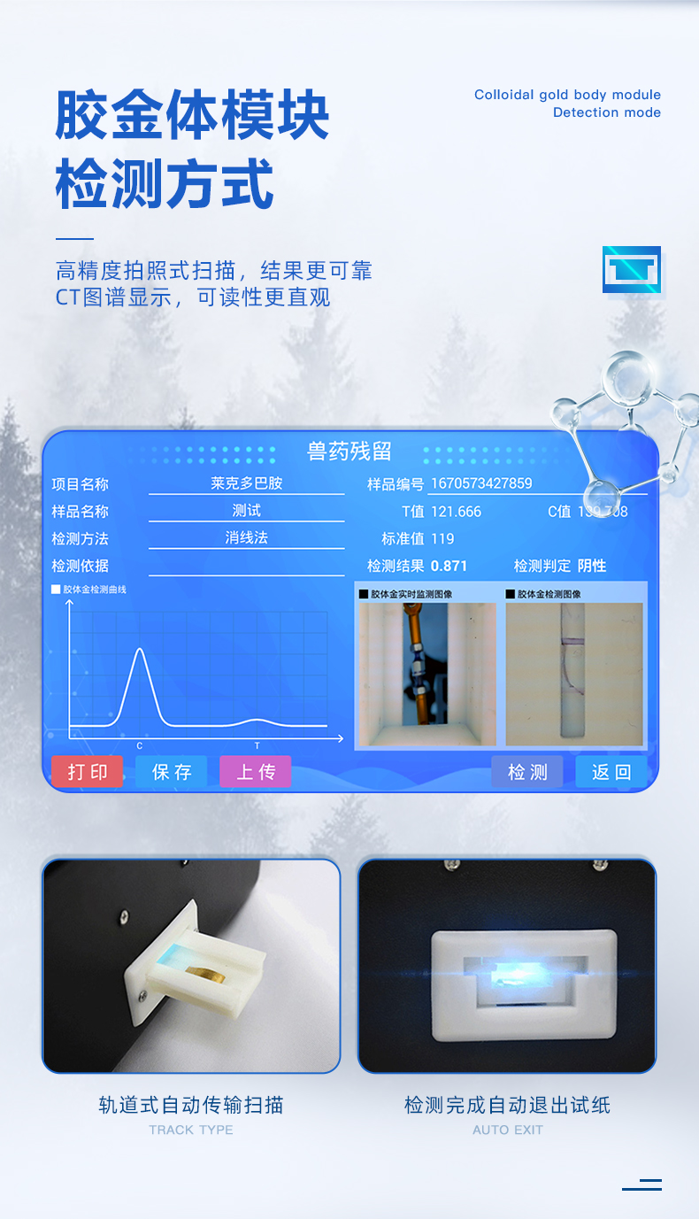 | 儀器采用手提式一體化系統(tǒng)檢測技術,將分光光度模塊、膠體金檢測模塊、新型農(nóng)殘檢測模塊、數(shù)字化管理模塊、無線通訊模塊高度集成于一體,支持檢測200種食品安全檢測項目,同時預留升級檢測方法。 | 儀器檢測模塊標準化、智能化,檢測項目可隨意自由組合。檢測箱體內(nèi)置多個標準檢測單元,檢測模塊可以調整配置。 | 顯示屏幕:儀器采用10.1英寸豎向液晶觸摸屏顯,搭配運行安卓智能操作系統(tǒng),主控芯片采用ARM Cortex-A7,RK3288/4核處理器,主頻1.88Ghz,操作方便,性能更強。 | 檢測通道:≥12通道;采用精密旋轉比色池設計,使用同芯片同光源校準精度,解決不同光源之間的誤差值,更加準確**。(1-12通道間誤差0.1%,***:**202022821055.2) | 儀器光源:高精度進口四波長冷光源,每個通道均配置 410、520、590、630nm 波長光源,標配**的光路切換裝置,專利光路切換功能可實現(xiàn)64波長,并且所有檢測項目可實現(xiàn)所有通道同時檢測。 | 設備可一鍵校準,自動保存校準數(shù)據(jù),自動對比校驗,得到精準光源,采用Android SP存儲數(shù)據(jù),光源數(shù)據(jù)永不丟失,方便每一次使用。 | 通訊接口:配備無線通信模塊、4G(APN)通訊模塊、藍牙傳輸,同時具有雙USB接口以及RJ45網(wǎng)線接口,可以多方式實現(xiàn)數(shù)據(jù)保存及數(shù)據(jù)傳輸 | 存儲方式:支持U盤存儲,標準USB接口,免驅動安裝。檢測結果存儲容量20萬條以上,可生成Excel表格進行拷貝,并具有登錄保護功能。 | 智能化操作系統(tǒng): | 1)操作系統(tǒng):儀器可在同一檢測界面自動對應相關檢測通道,一次性選擇1-12個樣品名稱,無需退出界面,節(jié)省操作時間。并可以對每個通道屬性和樣品信息單獨進行編輯,例如送檢單位、人員,檢測人員等,打印時勾選打印顯示。 | 2)數(shù)據(jù)集成系統(tǒng):設備首頁自動匯總分析檢測數(shù)據(jù),包含:周檢測數(shù)據(jù)、月檢測數(shù)據(jù),全部檢測總數(shù)量,均包含檢測總數(shù),合格數(shù),不合格數(shù),以及相關柱形分析圖,各項檢測數(shù)據(jù)一目了然,無需電腦查詢,更加快捷直觀。 | 3)數(shù)據(jù)庫系統(tǒng):十幾項數(shù)據(jù)庫分類管理儀器:包含項目類型、項目數(shù)據(jù)、檢測數(shù)據(jù)、歷史記錄、國標信息、曲線信息、采樣信息、檢測信息、受檢信息、復核信息、圖表信息、光源校準信息、打印樣式信息、樣品庫信息等等,數(shù)據(jù)庫之間互相協(xié)調聯(lián)動保證數(shù)據(jù)的真實完整性。同時產(chǎn)品數(shù)據(jù)庫以及歷史檢測記錄支持一鍵檢索功能。 | 4)限量規(guī)判系統(tǒng):具有限量查詢、添加物質合規(guī)判定系統(tǒng)。檢測出結果后,系統(tǒng)自動調用系統(tǒng)數(shù)據(jù)庫中相關國標進行比對判定,客觀顯示判定結果是否合格。 | 5)項目預設系統(tǒng):儀器具有任務預設模塊,一鍵提前預設,給出方便快捷的新檢測方案,每一個任務分別可以設置不同的樣品、批次、編號、來源、備注、抽樣信息、檢測信息、受檢信息、復核信息等更多信息。樣品送檢時一鍵調取保存信息,并可多次調取,大大提高檢測效率。 | 6)數(shù)據(jù)監(jiān)管系統(tǒng):同步對接監(jiān)管平臺,數(shù)據(jù)可局域網(wǎng)和互聯(lián)網(wǎng)數(shù)據(jù)上傳,檢測結果可選擇直接傳至食品安全監(jiān)管平臺。進行區(qū)域食品安全監(jiān)管及大數(shù)據(jù)分析處理與數(shù)據(jù)統(tǒng)計,檢測區(qū)域食品安全長短期動態(tài),達到食品安全問題預估、預警。 | 7)打印系統(tǒng):內(nèi)置全新打印機,新創(chuàng)自定義打印方式,可按需靈活勾選控制:產(chǎn)品合格證(國家農(nóng)業(yè)部標準要求),二維碼,抽樣信息、檢測信息,受檢信息、復核信息、抽樣日期、檢測日期等信息的打印。 | 供電模式:儀器交直流兩用,直流12V供電,可連接車載電源,可配6ah大容量充電鋰電池,電量可實時顯示,方便戶外流動測試。 | 膠體金檢測模塊:采用雙通道CMOS成像處理技術及膠體金免疫層析技術,可同時讀取雙膠體金卡數(shù)據(jù),自動采集、處理分析,將檢測結果顯示,并可根據(jù)參考限值自動判斷檢測結果,可檢測常見的獸藥殘留、生物毒素、抗生素、違禁添加物等。 | 1)探測技術:CMOS成像探測; | 2)檢測通道:1個通道; | 3)檢測方式:消線法和比色法; | 4)顯示模式:陰性或陽性; | 5)曲線形式:軌道式掃描方式,顯示金標卡圖像,實時生成、識別CT曲線圖,無需手動調整,完成檢測后自動退出檢測卡。兼容市場上其他金標卡,使用耗材不受限制。 | 儀器加入遠程升級功能,可定向分客戶分儀器更新,開機后自動更新,客戶無需任何操作,即可升級全新項目。做到了無需退換機器即可實現(xiàn)實時遠程升級檢測儀器。 |