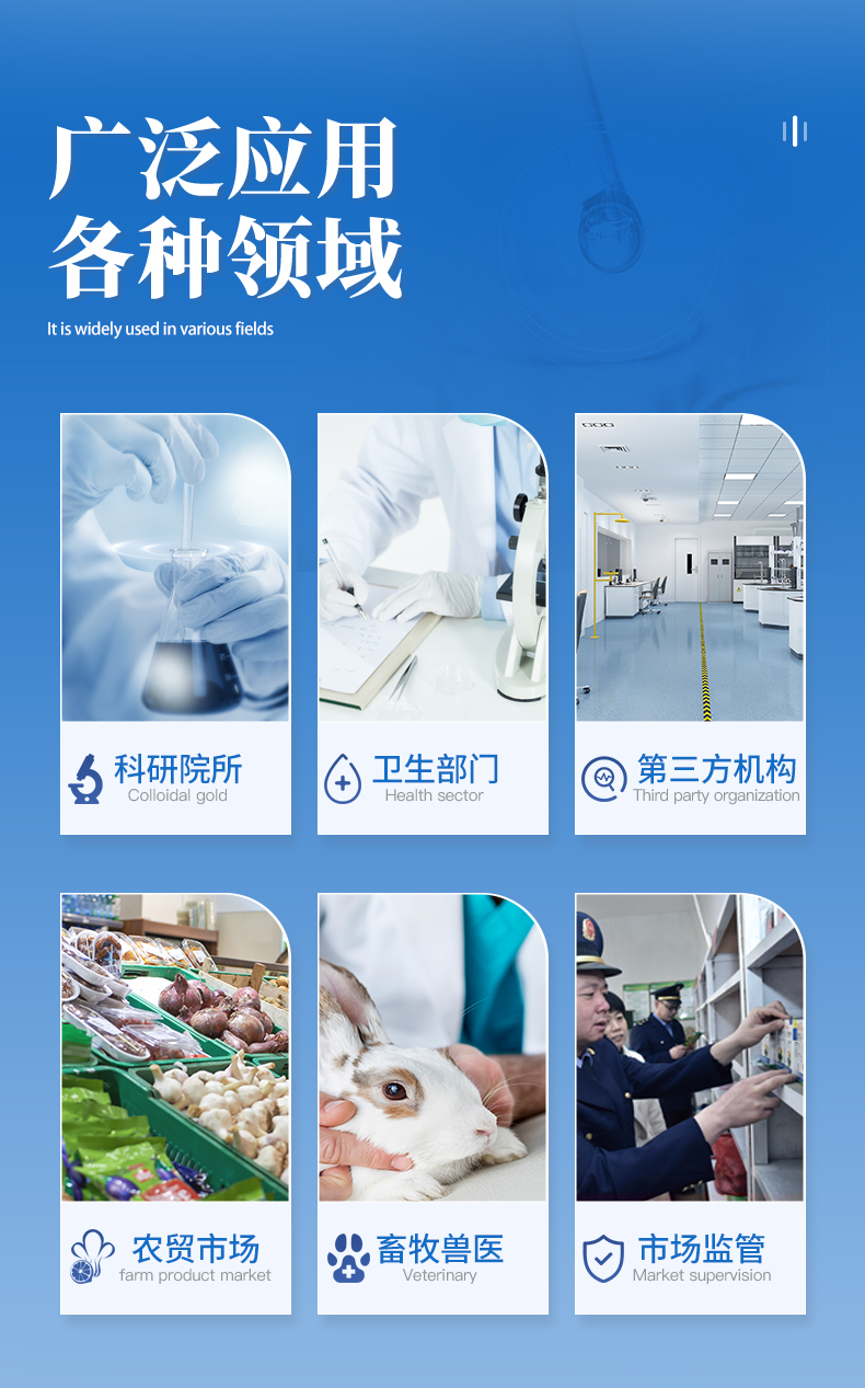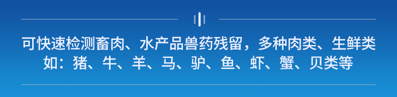 | 食品添加劑:二氧化硫、雙氧水、亞硝酸鹽、硝酸鹽、苯甲酸鈉、山梨酸鉀、糖精鈉、甜蜜素、木耳硫酸鎂等 | 有毒有害物質(zhì):甲醛、吊白塊、硼砂、過氧化苯甲酰、溴酸鉀、羅丹明B、三聚氰胺、蘇丹紅、工業(yè)堿、尿素、明礬等 | 果蔬:農(nóng)藥殘留(酶抑制率法) | 病害肉:組胺、揮發(fā)性鹽基氮 | 重金屬含量:鉛、鎘、鉻、汞、砷、錫、鎳、鋁等 | 水產(chǎn)品安全類:孔雀石綠、氯霉素、呋喃妥因、呋喃西林、呋喃它酮、呋喃唑酮等 | 瘦肉精激素類(獸藥):鹽酸克倫特羅、沙丁胺醇、萊克多巴胺、己烯雌酚等 | 抗生素殘留:四環(huán)素類、硝基呋喃類、磺胺類、β-興奮劑類、沙星類、磺胺類、喹諾酮類,甲砜霉素,氟苯尼考,金剛烷胺、替米考星、慶大霉素、林可霉素、鏈霉素、恩諾沙星、環(huán)丙沙星、頭孢啦啶、青霉素、阿莫西林等 | 真菌毒素類:食用油、糧食及飼料中黃曲霉毒素B1、黃曲霉毒素總量,奶中黃曲霉毒素M1、嘔吐毒素、玉米赤霉烯酮、赭曲霉毒素A、T2毒素、伏馬毒素等 | 調(diào)味品成分: 食醋的總酸、醬油的總酸、芝麻油純度、谷氨酸鈉、醬油氨基酸態(tài)氮、食鹽中亞鐵氰化鉀、食鹽中碘等 | 食用色素類:紅色色素(胭脂紅、莧菜紅、莧菜紅)、黃色色素(檸檬黃、日落黃)、藍(lán)色色素(亮藍(lán))等 | 動(dòng)物疫病類:禽流感、新城疫、牛羊口蹄疫、牛羊結(jié)核病、牛羊包蟲、牛羊布病、小反芻獸、豬藍(lán)耳病毒、豬瘟病毒、豬偽狂犬病毒、豬細(xì)小、豬圓環(huán)、犬細(xì)小病毒、犬瘟熱病毒、犬狂犬病毒等 | 蜂蜜成分:果糖和葡萄糖、蔗糖、淀粉酶、酸度等 | 食用油檢測:過氧化值、酸價(jià)等 | 蛋類藥物殘留:氯霉素,四環(huán)素,磺胺類,喹諾酮類,呋喃西林,呋喃它酮,呋喃妥因,呋喃唑酮,氟苯尼考,阿莫西林、頭孢氨芐、紅霉素、鏈霉素等 | 酒類及乳品牛奶中蛋白質(zhì):酒中甲醇、乙醇、乳品及牛奶中蛋白質(zhì)、乳品硫氰酸鈉、三聚氰胺, |