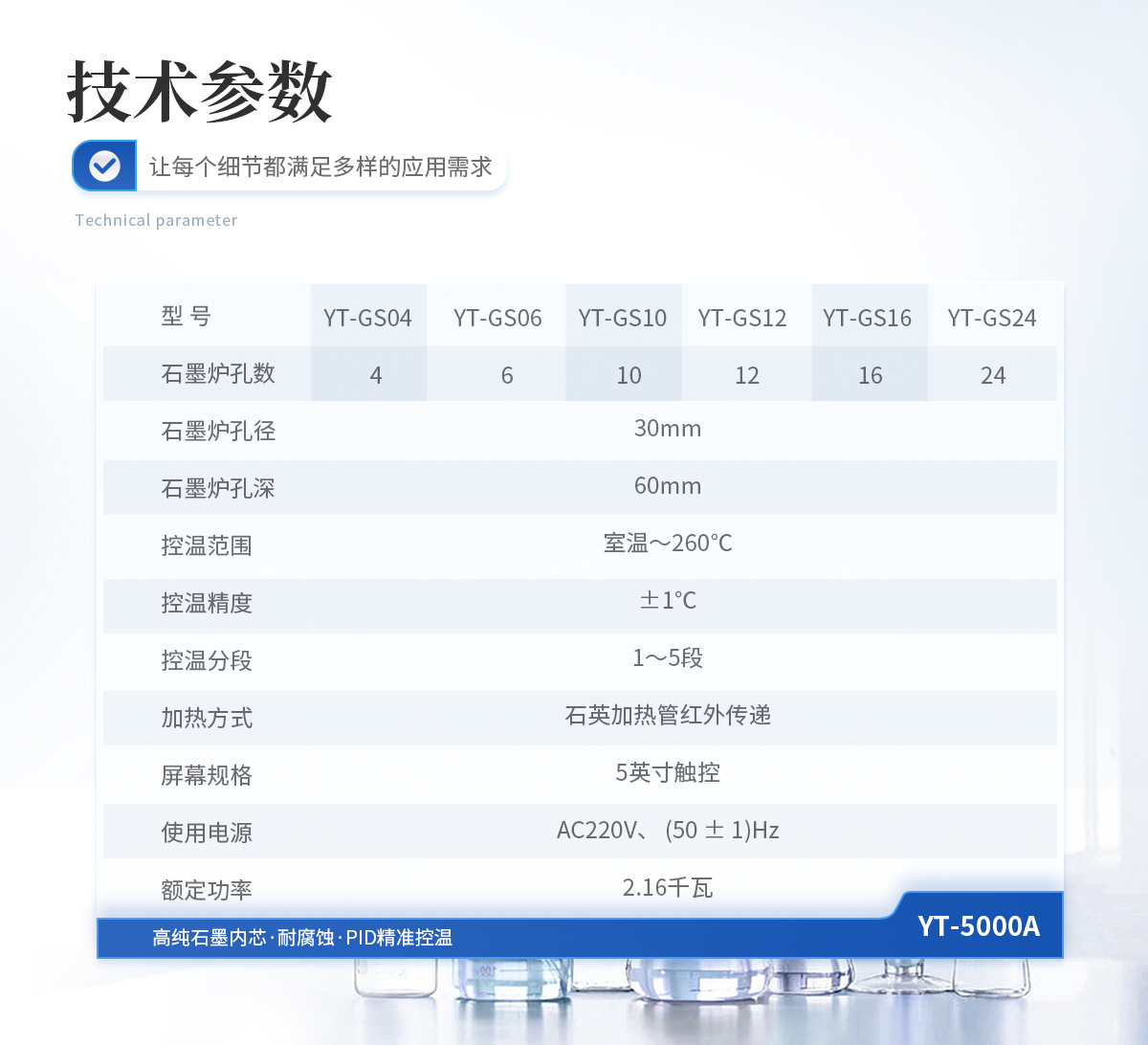 石墨爐孔:孔徑30mm,孔深60mm,孔數(shù)4×3 控溫范圍:室溫~260℃ 控溫精度:±1℃ 控溫分段:1~5段 加熱方式:石英加熱管紅外傳遞 屏幕規(guī)格:5寸觸控 主機(jī)外型尺寸:寬477mm×深460mm×高168mm 使用電源:AC220V、 (50 ± 1)Hz 額定功率:1.62千瓦