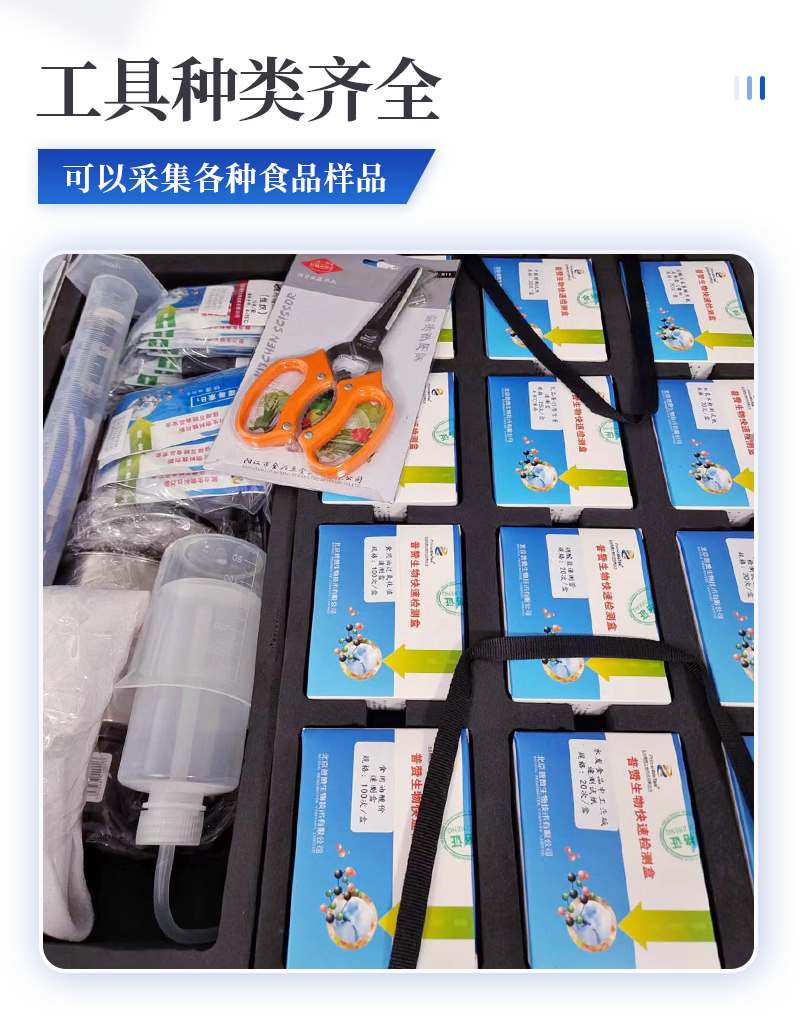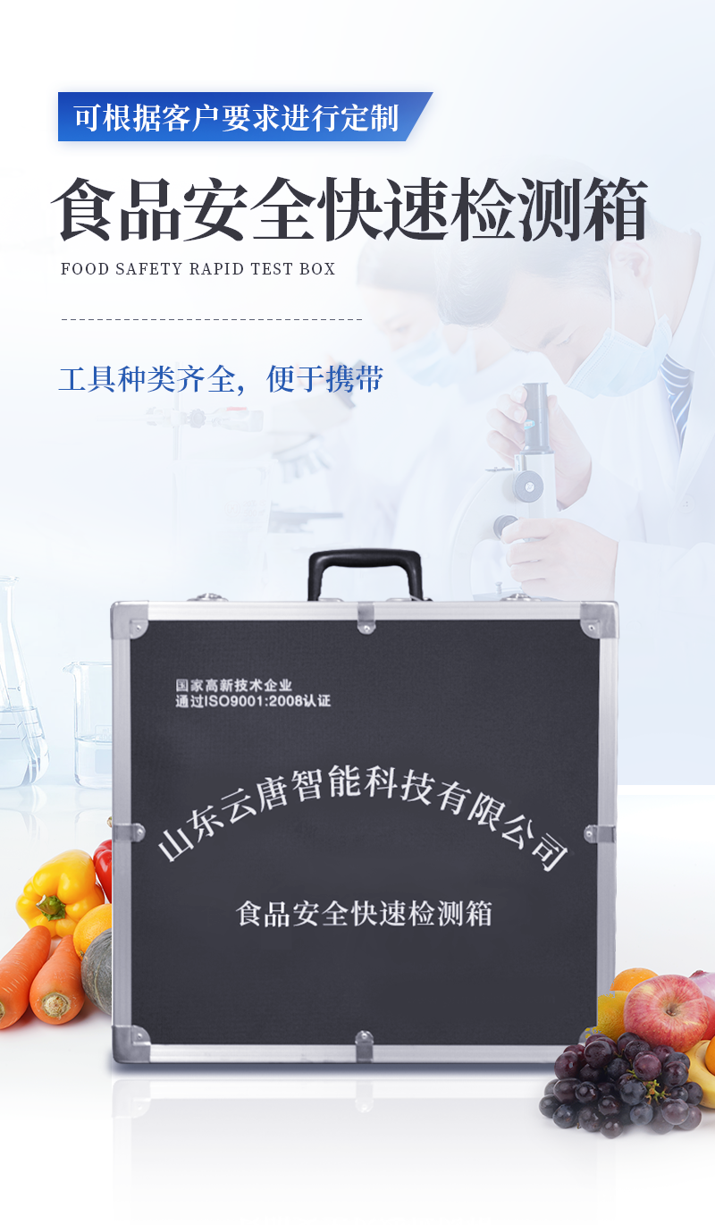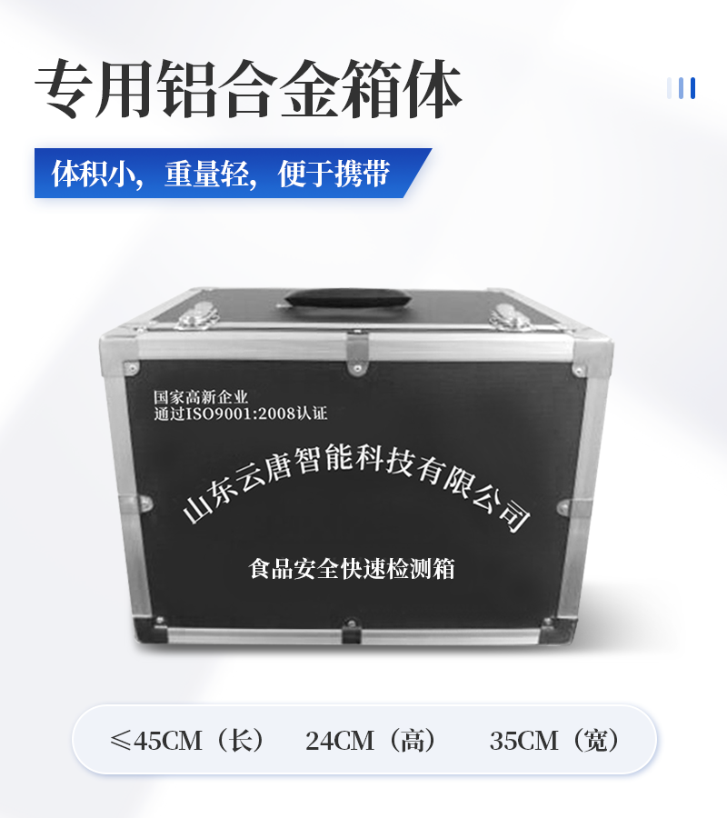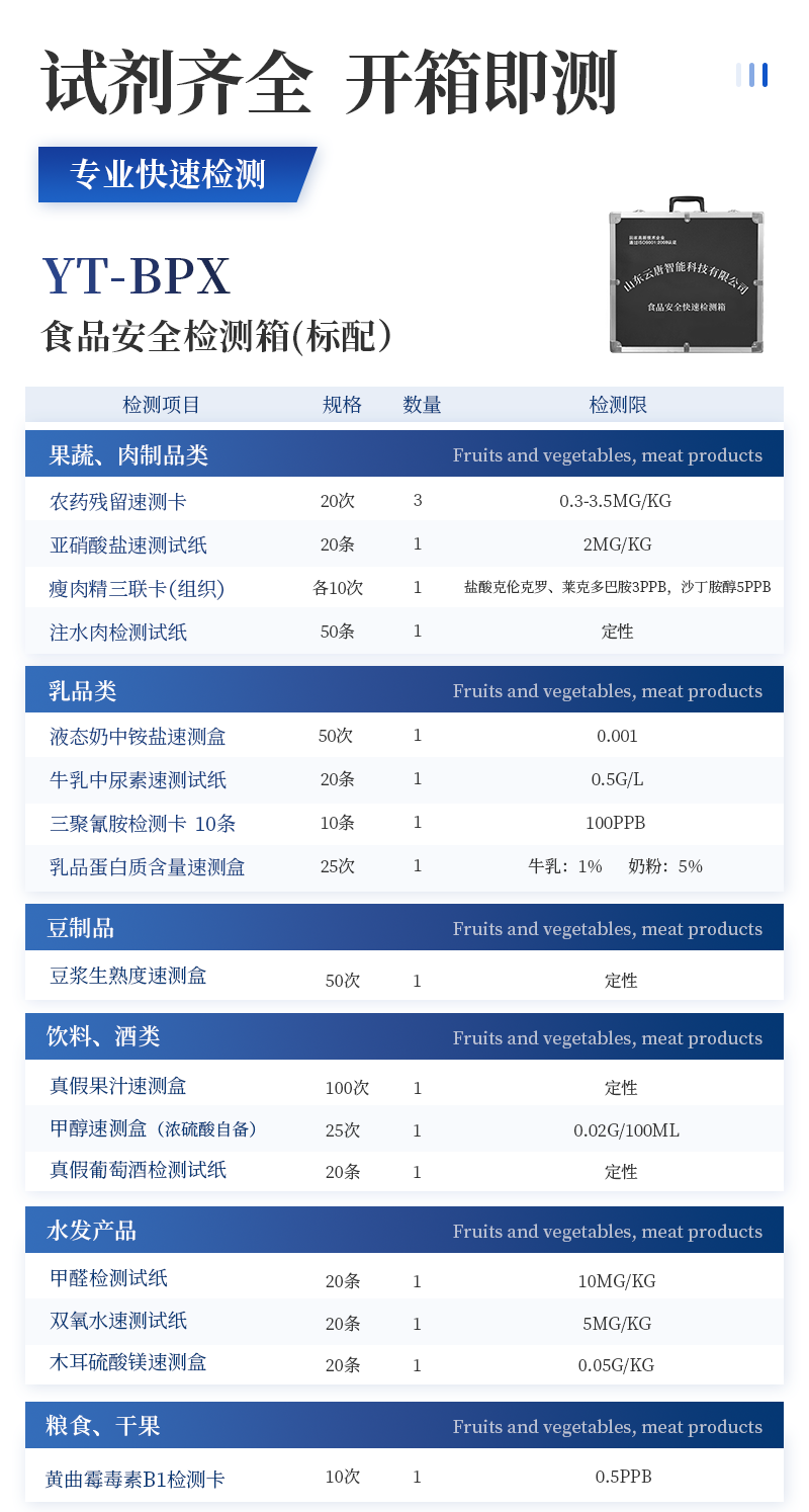 急性中毒快速檢測箱標配箱 序號適用范圍檢測項目規(guī)格單位數(shù)量檢測限檢測范圍1果蔬、肉制品類便攜式農(nóng)藥殘留快速檢測儀12通道臺1//農(nóng)藥殘留速測卡20次盒30.3-3.5mg/kg/亞硝酸鹽速測試紙20條套12mg/kg0-40mg/kg砷速測盒30次盒1砷:2mg/kg /汞速測盒30次盒1 汞:20mg/kg/瘦肉精三聯(lián)卡(組織)各10次包2鹽酸克倫克羅、萊克多巴胺3ppb,沙丁胺醇5ppb/2豆制品 奶制品液態(tài)奶新鮮度速測盒20次盒10.60T/豆?jié){生熟度速測盒 50次盒1定性/3飲料、酒類甲醇速測盒(濃硫酸自備) 25次盒10.02g/100mL0-0.32g/100mL4糧食、干果黃曲霉毒素B1檢測卡10次包10.5ppb/5食用油類食用油酸價速測盒100次盒11mg/kg0-8mg/kg食用油過氧化值速測盒100次盒10.09g/100g0.09-0.45g/100g6食物及水中毒物殘留毒鼠強速測盒(乙酸乙酯自備)10次盒12mg/kg/敵鼠鈉鹽速測盒100次盒1100mg/kg/氰化物檢測試紙20條套11mg/L0-10mg/L氟乙酰胺速測盒30次盒150mg/kg/硼酸和硼砂速測盒100次盒125mg/kg定性鼠藥安妥檢測試紙 40次包10.02mg/g,mL/鼠藥磷化鋅速測盒10次包120mg/kg/7箱體預裝輔助設備急性中毒箱箱體便攜式個1//便攜水浴鍋功率300W個1多功能剪刀-把1計算器-個1洗瓶250ml個1塑料滴管3ml根10塑料滴管0.2ml根50樣品管架10ml個1天平0.1-200g個1移液器1mL支1玻璃三角瓶100ml個2玻璃樣品管10ml個2小離心管1.5ml個24塑料樣品管10ml個10樣品瓶50ml個2離心管架1.5ml個1燒杯250ml個1量筒100ml個1手套-包1計時器-個1槍頭1ml個20組織提取器便攜式個1錫箔紙10張/包包1裝箱清單-份1產(chǎn)品合格證-份1使用說明書-份1 |