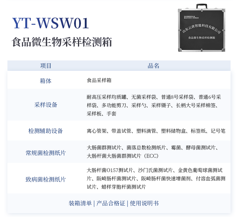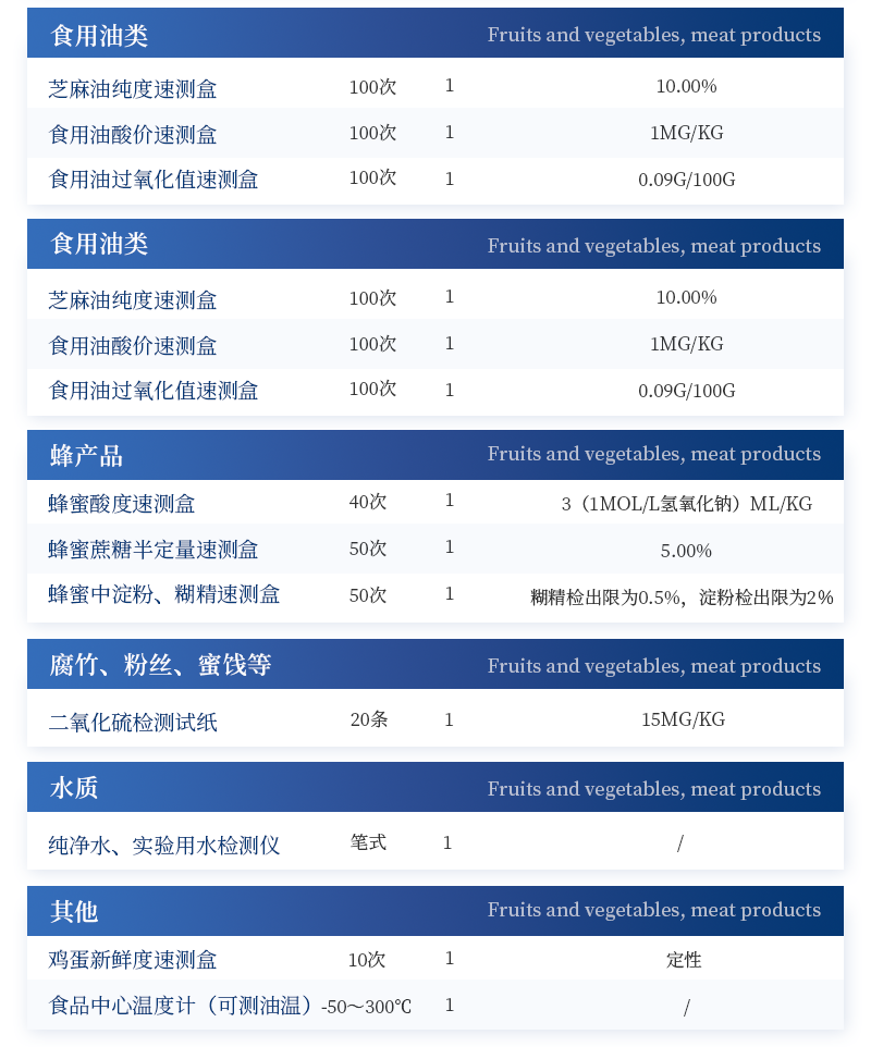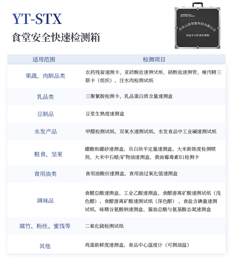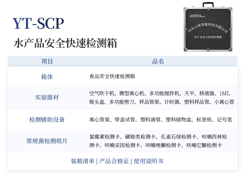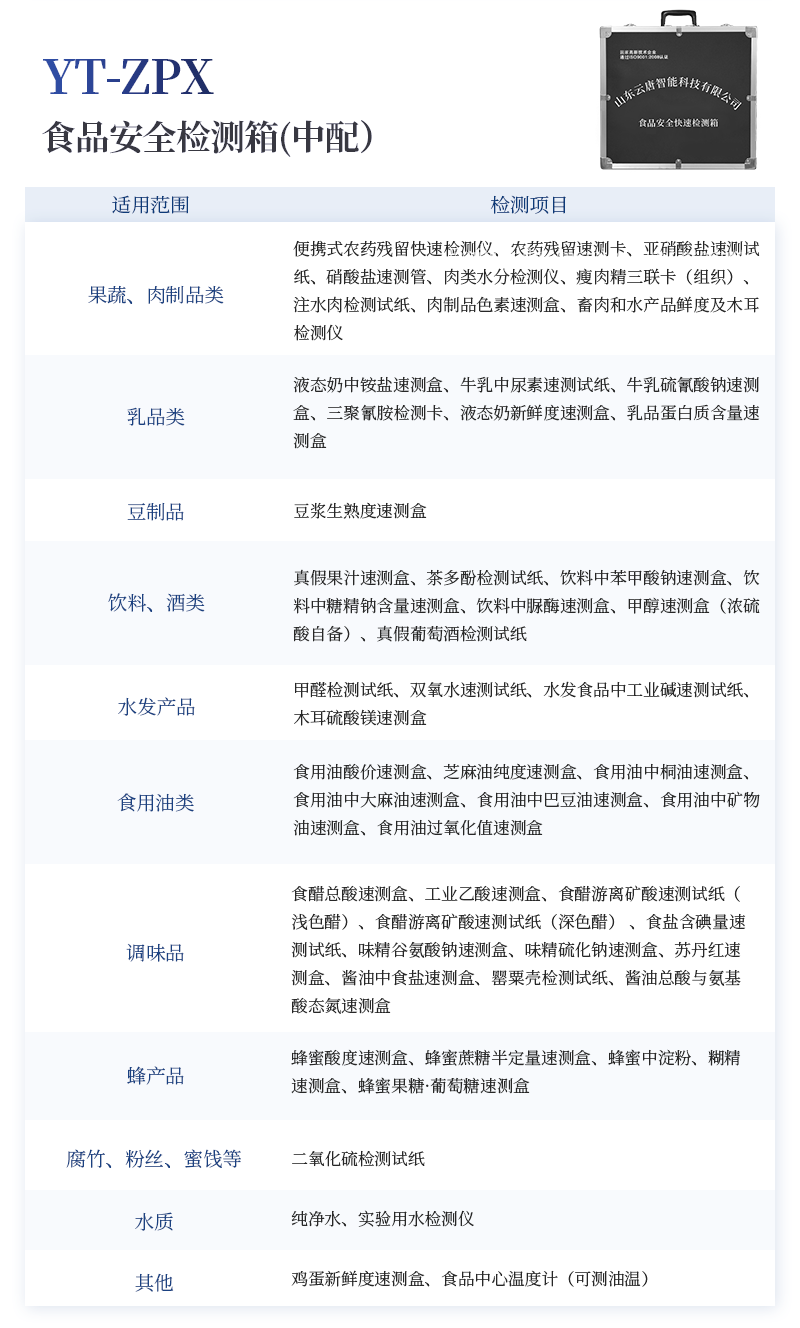 急性中毒快速檢測箱標配箱 序號適用范圍檢測項目規(guī)格單位數(shù)量檢測限檢測范圍1果蔬、肉制品類便攜式農(nóng)藥殘留快速檢測儀12通道臺1//農(nóng)藥殘留速測卡20次盒30.3-3.5mg/kg/亞硝酸鹽速測試紙20條套12mg/kg0-40mg/kg砷速測盒30次盒1砷:2mg/kg /汞速測盒30次盒1 汞:20mg/kg/瘦肉精三聯(lián)卡(組織)各10次包2鹽酸克倫克羅、萊克多巴胺3ppb,沙丁胺醇5ppb/2豆制品 奶制品液態(tài)奶新鮮度速測盒20次盒10.60T/豆?jié){生熟度速測盒 50次盒1定性/3飲料、酒類甲醇速測盒(濃硫酸自備) 25次盒10.02g/100mL0-0.32g/100mL4糧食、干果黃曲霉毒素B1檢測卡10次包10.5ppb/5食用油類食用油酸價速測盒100次盒11mg/kg0-8mg/kg食用油過氧化值速測盒100次盒10.09g/100g0.09-0.45g/100g6食物及水中毒物殘留毒鼠強速測盒(乙酸乙酯自備)10次盒12mg/kg/敵鼠鈉鹽速測盒100次盒1100mg/kg/氰化物檢測試紙20條套11mg/L0-10mg/L氟乙酰胺速測盒30次盒150mg/kg/硼酸和硼砂速測盒100次盒125mg/kg定性鼠藥安妥檢測試紙 40次包10.02mg/g,mL/鼠藥磷化鋅速測盒10次包120mg/kg/7箱體預裝輔助設備急性中毒箱箱體便攜式個1//便攜水浴鍋功率300W個1多功能剪刀-把1計算器-個1洗瓶250ml個1塑料滴管3ml根10塑料滴管0.2ml根50樣品管架10ml個1天平0.1-200g個1移液器1mL支1玻璃三角瓶100ml個2玻璃樣品管10ml個2小離心管1.5ml個24塑料樣品管10ml個10樣品瓶50ml個2離心管架1.5ml個1燒杯250ml個1量筒100ml個1手套-包1計時器-個1槍頭1ml個20組織提取器便攜式個1錫箔紙10張/包包1裝箱清單-份1產(chǎn)品合格證-份1使用說明書-份1 |