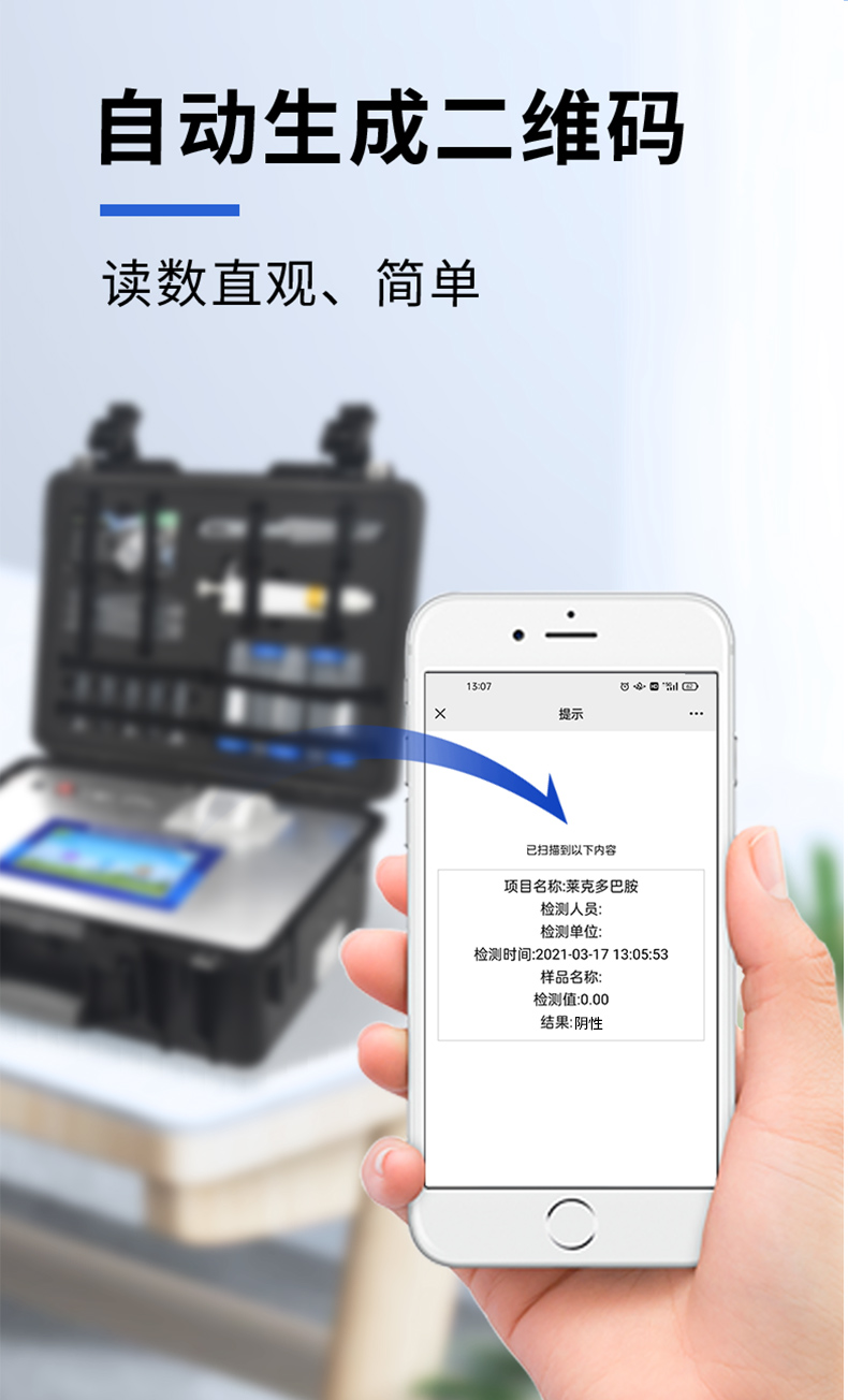 | 安卓智能操作系統(tǒng),采用更加**和人性化操作,儀器具有wifi聯(lián)網(wǎng)上傳、4G聯(lián)網(wǎng)傳輸、GPRS無線遠(yuǎn)傳、網(wǎng)線連接功能,快速上傳數(shù)據(jù)。 | 智能化程度高,儀器具有自檢功能:具有開機(jī)自檢和調(diào)零功能,具有自動檢測重復(fù)性功能。 | 新一代高速熱敏打印機(jī),檢測完成可自動打印檢測報告和二維碼。 | 儀器帶有監(jiān)管平臺,數(shù)據(jù)可局域網(wǎng)和互聯(lián)網(wǎng)數(shù)據(jù)上傳,檢測結(jié)果直接傳至食品安全監(jiān)管平臺。進(jìn)行區(qū)域食品安全監(jiān)管及大數(shù)據(jù)分析處理與數(shù)據(jù)統(tǒng)計,檢測區(qū)域食品安全長短期動態(tài),達(dá)到食品安全問題預(yù)估、預(yù)警 | 一體化便攜式快檢設(shè)備,滿足現(xiàn)場及流動檢測使用需求,能夠在同一軟件下實現(xiàn)所有檢測項目的檢測,并可通過同一窗口直觀顯示檢測結(jié)果。 | 膠體金模塊檢測方式:軌道式自動傳輸掃描,檢測完成后自動退出檢測卡。 | 儀器內(nèi)置攝像頭拍照,可顯示金標(biāo)卡實時圖像,系統(tǒng)自動分析并呈現(xiàn)出CT曲線圖,CT線自動識別,無需手動調(diào)整。 | 儀器具有品類多種類樣品菜單庫,可靈活選擇檢測樣品,不同的檢測通道可同時檢測不同的樣品項目。 | 樣品處理簡單省力,整體操作快速、安全、便捷。 | 高靈敏度,高檢測精度,高重復(fù)性精度,掃描式高精度光學(xué)傳感器。 | 內(nèi)置強大的數(shù)據(jù)庫,可在儀器上直接選擇樣品名稱、檢測指標(biāo)、送檢單位等信息,也可在儀器上直接編輯錄入樣品名稱、檢測指標(biāo)、送檢單位等信息并保存進(jìn)樣品數(shù)據(jù)庫。 | 儀器具有自身保護(hù)功能,可設(shè)置用戶名及密碼,防止非工作人員操作等。 | 儀器具有重新校準(zhǔn)、鎖定、恢復(fù)出廠設(shè)置功能。 | 結(jié)果判定線可修改,對照值標(biāo)定值可保存,斷電不丟失數(shù)據(jù)。 | 兼容市場上所有的膠體金卡,使用耗材不受限制,極大增強用戶使用體驗。 |