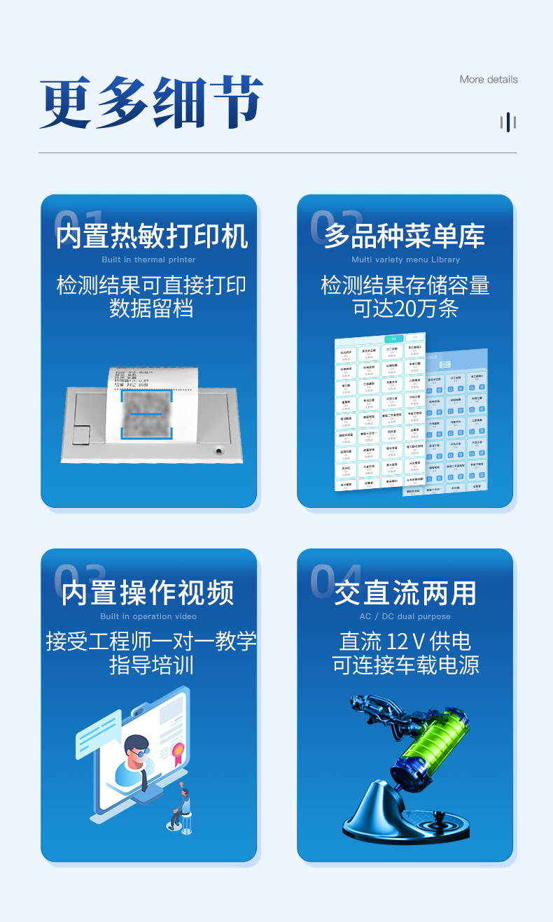 | 儀器采用手提一體化系統(tǒng)檢測(cè)技術(shù),將分光光度模塊、數(shù)字化管理模塊、無(wú)線通訊模塊高度集成于一體,可支持檢測(cè)60種食品安全檢測(cè)項(xiàng)目,同時(shí)預(yù)留升級(jí)檢測(cè)方法。 | 儀器檢測(cè)模塊標(biāo)準(zhǔn)化、智能化,檢測(cè)項(xiàng)目可隨意自由組合。檢測(cè)箱體內(nèi)置多個(gè)標(biāo)準(zhǔn)檢測(cè)單元,檢測(cè)模塊可以調(diào)整配置。 | 顯示屏幕:儀器采用10.1英寸豎向液晶觸摸屏顯,搭配運(yùn)行安卓智能操作系統(tǒng),主控芯片采用ARM Cortex-A7,RK3288/4核處理器,主頻1.88Ghz,操作方便,性能更強(qiáng)。 | 檢測(cè)通道:≥12通道;采用精密旋轉(zhuǎn)比色池設(shè)計(jì),使用同芯片同光源校準(zhǔn)精度,解決不同光源之間的誤差值,更加準(zhǔn)確**。(1-12通道間誤差0.1%,***:**202022821055.2) | 儀器光源:高精度進(jìn)口四波長(zhǎng)冷光源,每個(gè)通道均配置 410、520、590、630nm 波長(zhǎng)光源,標(biāo)配**的光路切換裝置,專利光路切換功能可實(shí)現(xiàn)64波長(zhǎng),并且所有檢測(cè)項(xiàng)目可實(shí)現(xiàn)所有通道同時(shí)檢測(cè)。 | 設(shè)備可一鍵校準(zhǔn),自動(dòng)保存校準(zhǔn)數(shù)據(jù),自動(dòng)對(duì)比校驗(yàn),得到精準(zhǔn)光源,采用Android SP存儲(chǔ)數(shù)據(jù),光源數(shù)據(jù)永不丟失,方便每一次使用。 | 通訊接口:配備無(wú)線通信模塊、4G(APN)通訊模塊、藍(lán)牙傳輸,同時(shí)具有雙USB接口以及RJ45網(wǎng)線接口,可以多方式實(shí)現(xiàn)數(shù)據(jù)保存及數(shù)據(jù)傳輸。 | 存儲(chǔ)方式:支持U盤(pán)存儲(chǔ),標(biāo)準(zhǔn)USB接口,免驅(qū)動(dòng)安裝。檢測(cè)結(jié)果存儲(chǔ)容量20萬(wàn)條以上,可生成Excel表格進(jìn)行拷貝,并具有登錄保護(hù)功能。 | 智能化操作系統(tǒng): | 1、操作系統(tǒng):儀器可在同一檢測(cè)界面自動(dòng)對(duì)應(yīng)相關(guān)檢測(cè)通道,一次性選擇1-12個(gè)樣品名稱,無(wú)需退出界面,節(jié)省操作時(shí)間。并可以對(duì)每個(gè)通道屬性和樣品信息單獨(dú)進(jìn)行編輯,例如送檢單位、人員,檢測(cè)人員等,打印時(shí)勾選打印顯示。 | 2、數(shù)據(jù)集成系統(tǒng):設(shè)備首頁(yè)自動(dòng)匯總分析檢測(cè)數(shù)據(jù),包含:周檢測(cè)數(shù)據(jù)、月檢測(cè)數(shù)據(jù),全部檢測(cè)總數(shù)量,均包含檢測(cè)總數(shù),合格數(shù),不合格數(shù),以及相關(guān)柱形分析圖,各項(xiàng)檢測(cè)數(shù)據(jù)一目了然,無(wú)需電腦查詢,更加快捷直觀。 | 3、數(shù)據(jù)庫(kù)系統(tǒng):十幾項(xiàng)數(shù)據(jù)庫(kù)分類管理儀器:包含項(xiàng)目類型、項(xiàng)目數(shù)據(jù)、檢測(cè)數(shù)據(jù)、歷史記錄、國(guó)標(biāo)信息、曲線信息、采樣信息、檢測(cè)信息、受檢信息、復(fù)核信息、圖表信息、光源校準(zhǔn)信息、打印樣式信息、樣品庫(kù)信息等等,數(shù)據(jù)庫(kù)之間互相協(xié)調(diào)聯(lián)動(dòng)保證數(shù)據(jù)的真實(shí)完整性。同時(shí)產(chǎn)品數(shù)據(jù)庫(kù)以及歷史檢測(cè)記錄支持一鍵檢索功能。 | 4、限量規(guī)判系統(tǒng):具有限量查詢、添加物質(zhì)合規(guī)判定系統(tǒng)。檢測(cè)出結(jié)果后,系統(tǒng)自動(dòng)調(diào)用系統(tǒng)數(shù)據(jù)庫(kù)中相關(guān)國(guó)標(biāo)進(jìn)行比對(duì)判定,客觀顯示判定結(jié)果是否合格。 | 5、項(xiàng)目預(yù)設(shè)系統(tǒng):儀器具有任務(wù)預(yù)設(shè)模塊,一鍵提前預(yù)設(shè),給出方便快捷的新檢測(cè)方案,每一個(gè)任務(wù)分別可以設(shè)置不同的樣品、批次、編號(hào)、來(lái)源、備注、抽樣信息、檢測(cè)信息、受檢信息、復(fù)核信息等更多信息。樣品送檢時(shí)一鍵調(diào)取保存信息,并可多次調(diào)取,大大提高檢測(cè)效率。 | 6、數(shù)據(jù)監(jiān)管系統(tǒng):同步對(duì)接監(jiān)管平臺(tái),數(shù)據(jù)可局域網(wǎng)和互聯(lián)網(wǎng)數(shù)據(jù)上傳,檢測(cè)結(jié)果可選擇直接傳至食品安全監(jiān)管平臺(tái)。進(jìn)行區(qū)域食品安全監(jiān)管及大數(shù)據(jù)分析處理與數(shù)據(jù)統(tǒng)計(jì),檢測(cè)區(qū)域食品安全長(zhǎng)短期動(dòng)態(tài),達(dá)到食品安全問(wèn)題預(yù)估、預(yù)警。 | 7.1、全新打印系統(tǒng):內(nèi)置全新打印機(jī),新創(chuàng)自定義打印方式,可按需靈活勾選控制:二維碼,抽樣信息、檢測(cè)信息,受檢信息、復(fù)核信息、抽樣日期、檢測(cè)日期等信息的打印。 | 7.2、A4紙版本報(bào)告打印功能(可選配):設(shè)備擁有兩種結(jié)果展示方式,可以自動(dòng)生成A4打印模板和小票打印模板兩種樣式,可通過(guò)WiFi及網(wǎng)線等方式鏈接外置打印機(jī)可進(jìn)行打印。 | 供電模式:儀器交直流兩用,直流12V供電,可連接車載電源,可配6ah大容量充電鋰電池,電量可實(shí)時(shí)顯示,方便戶外流動(dòng)測(cè)試。 | 儀器具備遠(yuǎn)程升級(jí)功能,可定向分客戶分儀器更新,開(kāi)機(jī)后自動(dòng)更新,并可持續(xù)性免費(fèi)更新系統(tǒng)版本,無(wú)需像傳統(tǒng)產(chǎn)品返廠更新,節(jié)省時(shí)間及人力成本并避免了物流運(yùn)輸返廠升級(jí)導(dǎo)致設(shè)備損壞的潛在風(fēng)險(xiǎn)。 |