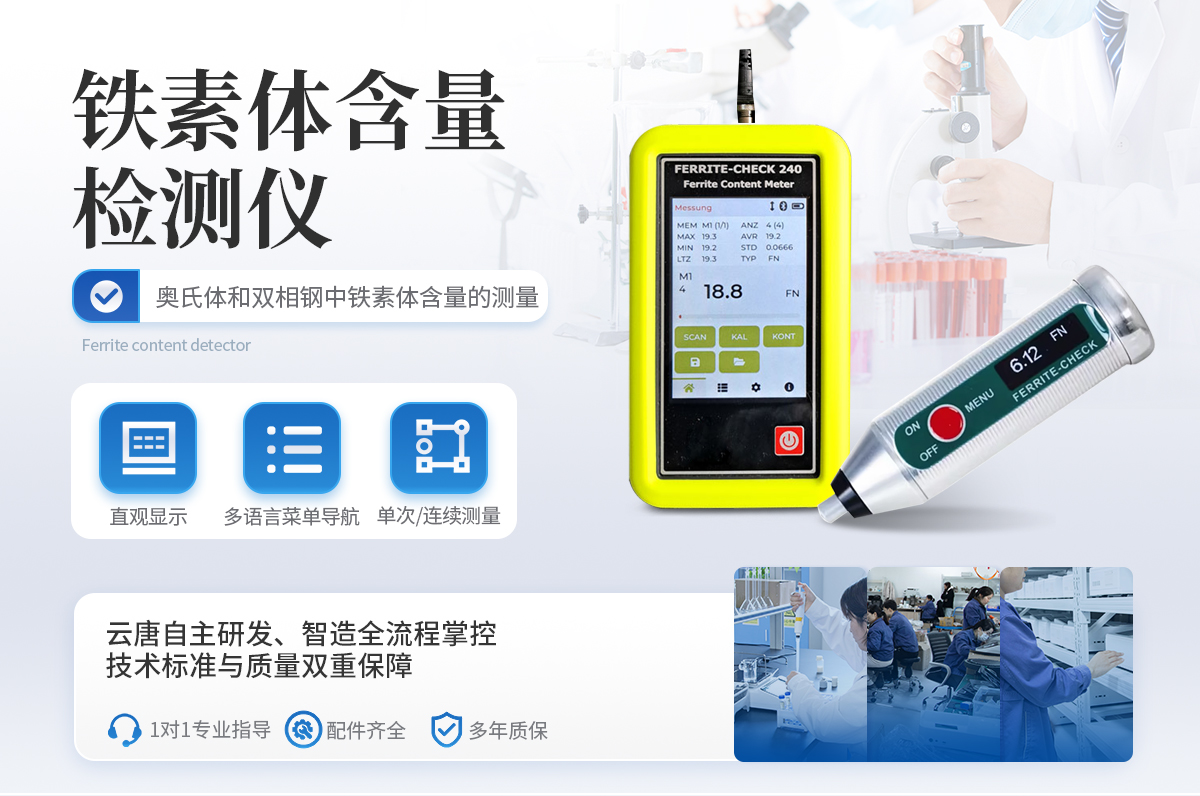 FERRITE-CHECK 240鐵素體含量檢測儀采用分體式的設(shè)計,使用方便,儀器符合Basel標準DIN EN ISO 8249,使用磁感應(yīng)法測量奧氏體鋼和雙相鋼中的鐵素體含量。 全新測頭