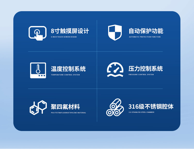 | (1)高溫度≥300℃,高壓力≥1500psi; | (2)內罐材質:聚四氟材料; | (3)防爆外套管材質:PEEK宇航材料; | (4)內罐反應容積:100ml; | (5)高壓消解罐批處理量≥20個樣品/批(可不更換轉子升級為40位); | (6)防爆膜片采用陶瓷壓緊,陶瓷受熱不變形,四氟受熱變形,起不到防爆膜作用,采用陶瓷件壓緊。 | (7)消解罐工作方式為360°同向連續(xù)旋轉,微波均勻,各個樣品微波環(huán)境相同,提高實驗結果的一致性 |