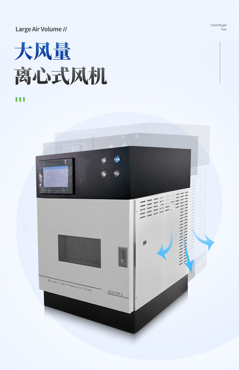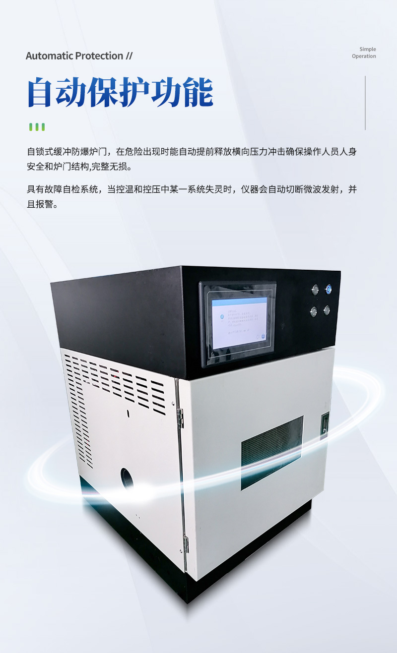 儀器采用微波非脈沖連續(xù)自動變頻控制,延長了儀器的使用壽命和電磁波的均勻性,腔體采用52L大容積316L不銹鋼腔體材料制成,自鎖式緩沖防爆爐門,當反應異常時,緩沖結構確保操作人員人身安全和爐門結構完整無損,爐門和腔體結合緊密,微波泄漏符合國家標準。儀器采用溫、壓雙控系統(tǒng)對消解實驗的壓力和溫度進行控制,實時顯示。360°同向連續(xù)旋轉,微波均勻,確定各個樣品微波環(huán)境相同,提高實驗結果的一致性。當罐內的壓力超過設定的保護值時,微波會自動停止加熱。安全防爆膜具有雙保險功能,當罐內的壓力超過防爆膜所能承受的壓力時,防爆膜先行破裂,氣體瀉出,防止罐體受損和對人體的傷害。