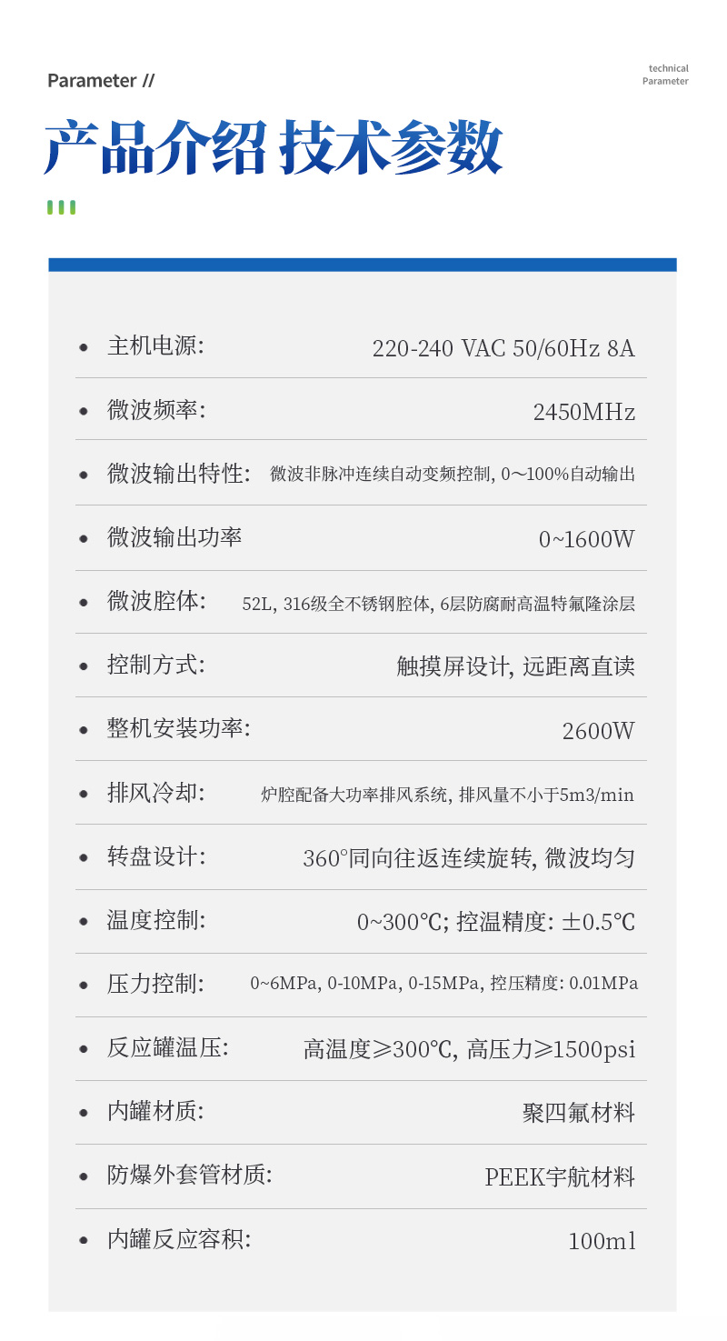 | 主機參數(shù);1.1電 源:220-240 VAC 50/60Hz 8A ; | 微波頻率:2450MHz; | 整機安裝功率:2600W; | (1)電源要求:220 VAC 50 Hz 15A; | (2)微波源: | (3)微波輸出功率 :0~1600W; | (4)微波輸出特性:微波非脈沖連續(xù)自動變頻控制,0~100%自動輸出; | (5)微波均勻性:垂直雙向波導設計,三維輸出技術,匹配諧波功頻實現(xiàn)了高度的場均勻性; | (6)微波腔體:52L,316級全不銹鋼腔體,6層防腐耐高溫特氟隆涂層; | (7)自鎖式緩沖防爆爐門,在危險出現(xiàn)時能自動提前釋放橫向壓力沖擊,確保操作人員人身安全和爐門結構 完整無損; | (8)排風和冷卻系統(tǒng):爐腔配備大功率排風系統(tǒng),各種反應可在通風,安全和易于觀察的環(huán)境下長時間連續(xù)進行。爐腔通風采用耐酸蝕,大風量離心式風機,排風量不小于5m3/min;爐腔內具有風冷功能,持續(xù)為反應罐降溫,溫度和壓力實時顯示。 | (9)轉盤設計:360°同向往返連續(xù)旋轉,微波均勻,保證各個樣品微波環(huán)境相同,提高實驗結果的一致性。 | (10)控制方式:觸摸屏設計,8寸TFT-LED(800X480彩)大屏幕顯示,遠距離直讀反應進程,實時顯示密閉反應罐溫度、壓力,并可實時顯示溫壓曲線; | (11)操作語言:中文簡體 | (12)自動保護功能:具有故障自檢系統(tǒng);當控溫和控壓中某一系統(tǒng)失靈時,儀器會自動切斷微波發(fā)射,并且報警; |