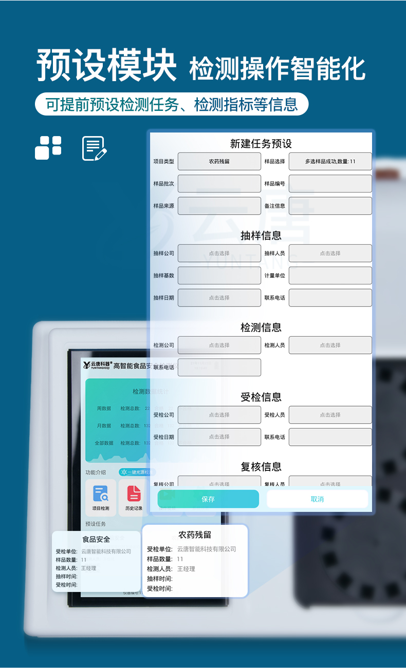 山東云唐智能科技有限公司生產的高智能食品安全檢測儀為集成化食品安全快速檢測分析設備,采用臺式一體化設計,可快速檢測200多種食品安全項目,包含非食用化學物質、濫用食品添加劑、農藥殘留、獸藥殘留、重金屬、病害肉、營養(yǎng)強化劑、抗生素類殘留、激素類殘留、真菌毒素類殘留、化學類殘留等項目的定性定量檢測。目前廣泛應用于市場監(jiān)管局、檢測中心、衛(wèi)生監(jiān)督部門、農業(yè)部門、院校及各單位食堂、食品肉產品深加工企業(yè)、商超市場、司法部門、餐飲機構、養(yǎng)殖場、屠宰場、檢驗檢疫部門等單位。
