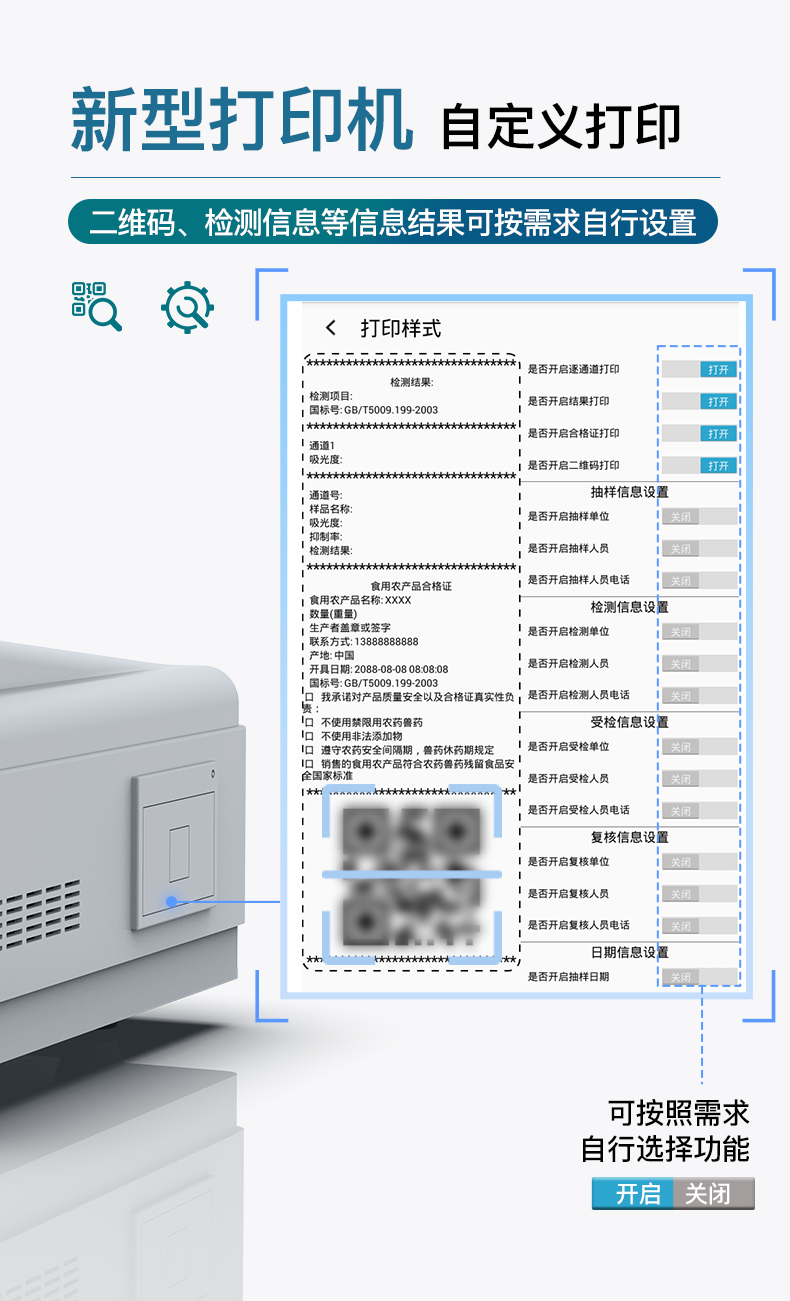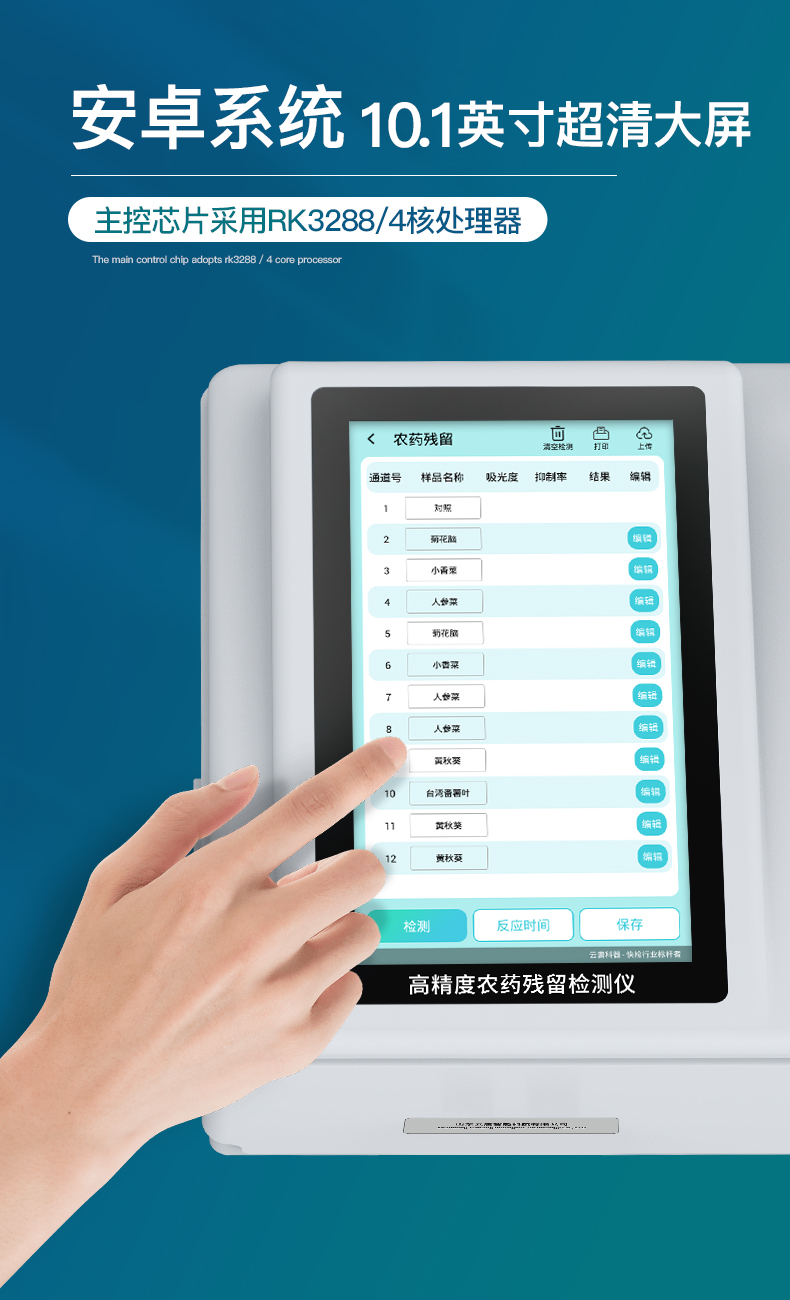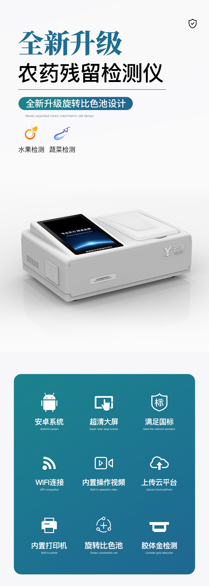 | 1、儀器采用臺式一體化系統(tǒng)檢測技術,將分光光度模塊、膠體金檢測模塊、新型農殘檢測模塊、數字化管理模塊、無線通訊模塊高度集成于一體,支持檢測200種食品安全檢測項目,同時預留升級檢測方法。 | 2、儀器檢測模塊標準化、智能化,檢測項目可隨意自由組合。檢測箱體內置多個標準檢測單元,檢測模塊可以調整配置。 | 3、顯示屏幕:儀器采用10.1英寸豎向液晶觸摸屏顯,搭配運行安卓智能操作系統(tǒng),主控芯片采用ARM Cortex-A7,RK3288/4核處理器,主頻1.88Ghz,操作方便,性能更強。 | 4、檢測通道:≥12通道;采用精密旋轉比色池設計,使用同芯片同光源校準精度,解決不同光源之間的誤差值,更加準確**。(1-12通道間誤差0.1%,***:**202022821055.2) | 5、儀器光源:高精度進口四波長冷光源,每個通道均配置 410、520、590、630nm 波長光源,標配**的光路切換裝置,專利光路切換功能可實現(xiàn)64波長,并且所有檢測項目可實現(xiàn)所有通道同時檢測。 | 6、設備可一鍵校準,自動保存校準數據,自動對比校驗,得到精準光源,采用Android SP存儲數據,光源數據永不丟失,方便每一次使用。 | 7、通訊接口:配備無線通信模塊、4G(APN)通訊模塊、藍牙傳輸,同時具有雙USB接口以及RJ45網線接口,可以多方式實現(xiàn)數據保存及數據傳輸。 | 8、存儲方式:支持U盤存儲,標準USB接口,免驅動安裝。檢測結果存儲容量20萬條以上,可生成Excel表格進行拷貝,并具有登錄保護功能。 | 9、智能化操作系統(tǒng): | 9.1、操作系統(tǒng):儀器可在同一檢測界面自動對應相關檢測通道,一次性選擇1-12個樣品名稱,無需退出界面,節(jié)省操作時間。并可以對每個通道屬性和樣品信息單獨進行編輯,例如送檢單位、人員,檢測人員等,打印時勾選打印顯示。 | 9.2、數據集成系統(tǒng):設備首頁自動匯總分析檢測數據,包含:周檢測數據、月檢測數據,全部檢測總數量,均包含檢測總數,合格數,不合格數,以及相關柱形分析圖,各項檢測數據一目了然,無需電腦查詢,更加快捷直觀。 | 9.3、數據庫系統(tǒng):十幾項數據庫分類管理儀器:包含項目類型、項目數據、檢測數據、歷史記錄、國標信息、曲線信息、采樣信息、檢測信息、受檢信息、復核信息、圖表信息、光源校準信息、打印樣式信息、樣品庫信息等等,數據庫之間互相協(xié)調聯(lián)動保證數據的真實完整性。同時產品數據庫以及歷史檢測記錄支持一鍵檢索功能。 | 9.4、限量規(guī)判系統(tǒng):具有限量查詢、添加物質合規(guī)判定系統(tǒng)。檢測出結果后,系統(tǒng)自動調用系統(tǒng)數據庫中相關國標進行比對判定,客觀顯示判定結果是否合格。 | 9.5、項目預設系統(tǒng):儀器具有任務預設模塊,一鍵提前預設,給出方便快捷的新檢測方案,每一個任務分別可以設置不同的樣品、批次、編號、來源、備注、抽樣信息、檢測信息、受檢信息、復核信息等更多信息。樣品送檢時一鍵調取保存信息,并可多次調取,大大提高檢測效率。 | 9.6、數據監(jiān)管系統(tǒng):同步對接監(jiān)管平臺,數據可局域網和互聯(lián)網數據上傳,檢測結果可選擇直接傳至食品安全監(jiān)管平臺。進行區(qū)域食品安全監(jiān)管及大數據分析處理與數據統(tǒng)計,檢測區(qū)域食品安全長短期動態(tài),達到食品安全問題預估、預警。 | 9.7.1、全新打印系統(tǒng):內置全新打印機,新創(chuàng)自定義打印方式,可按需靈活勾選控制:產品合格證(國家農業(yè)部標準要求),二維碼,抽樣信息、檢測信息,受檢信息、復核信息、抽樣日期、檢測日期等信息的打印。 | 9.7.2、A4紙版本報告打印功能(選配):設備擁有兩種結果展示方式,可以自動生成A4打印模板和小票打印模板兩種樣式,可通過WiFi及網線等方式鏈接外置打印機可進行打印。 | 10、供電模式:儀器交直流兩用,直流12V供電,可連接車載電源,可配6ah大容量充電鋰電池,電量可實時顯示,方便戶外流動測試。 | 11、膠體金檢測模塊:采用單通道CMOS成像處理技術及膠體金免疫層析技術,可讀取膠體金卡數據,自動采集、處理分析,將檢測結果顯示,并可根據參考限值自動判斷檢測結果,可檢測常見的獸藥殘留、生物毒素、抗生素、違禁添加物等。 | 11.1、探測技術:CMOS成像探測; | 11.2、檢測通道:1個通道; | 11.3、檢測方式:消線法和比色法; | 11.4、顯示模式:陰性或陽性; | 11.5、曲線形式:直插式掃描方式,顯示金標卡圖像,實時生成、識別CT曲線圖,無需手動調整,完成檢測后自動退出檢測卡。兼容市場上其他金標卡,使用耗材不受限制。 | 12、儀器具備遠程升級功能,可定向分客戶分儀器更新,開機后自動更新,并可持續(xù)性免費更新系統(tǒng)版本,無需像傳統(tǒng)產品返廠更新,節(jié)省時間及人力成本并避免了物流運輸返廠升級導致設備損壞的潛在風險。 |