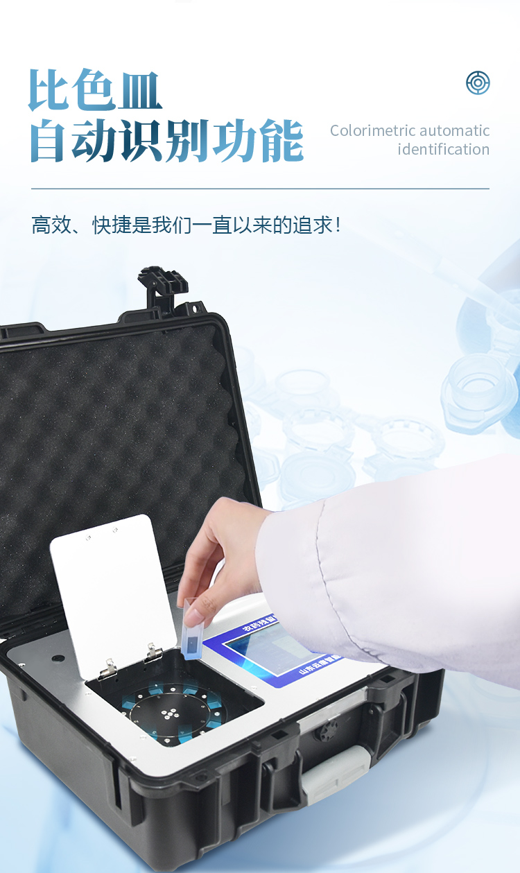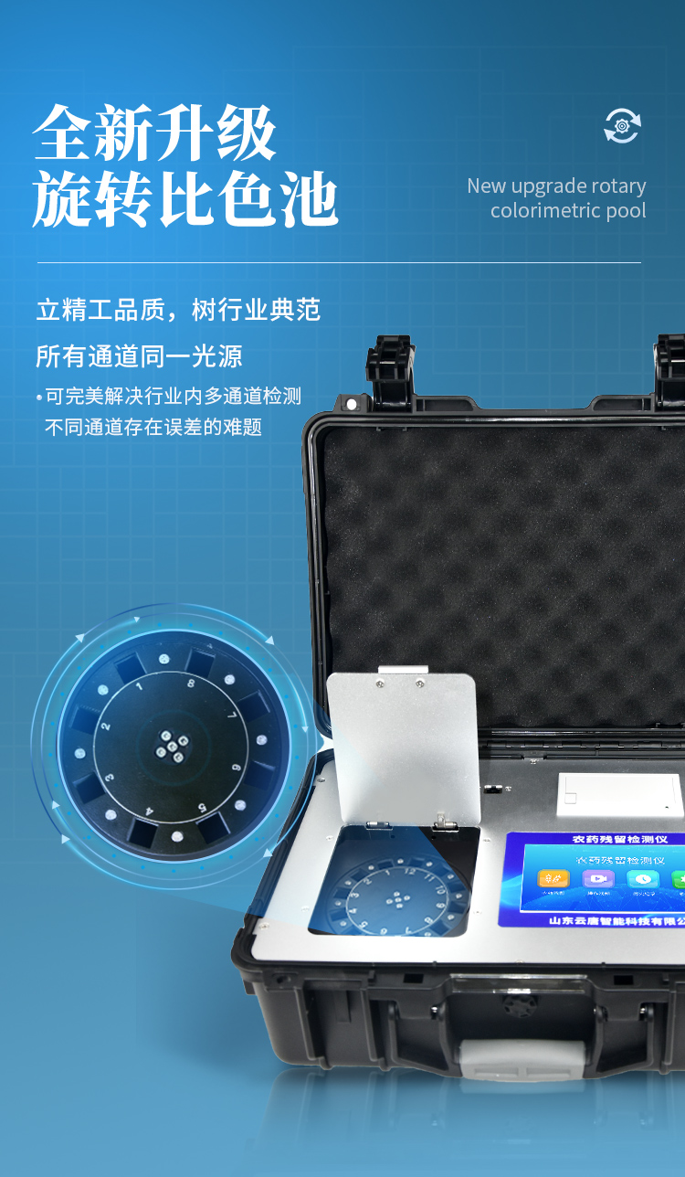 | 機(jī)器采用全新安卓智能系統(tǒng),主控芯片采用 ARM Cortex-A7,RK3288/4核處理器,主頻1.88Ghz,運(yùn)轉(zhuǎn)速度更快速,穩(wěn)定性更強(qiáng)。 | 創(chuàng)新檢測模式: *儀器采用精密旋轉(zhuǎn)比色池設(shè)計(jì),使用光源一致,可以解決各通道間由于光源誤差帶來的檢測結(jié)果誤差問題,檢測結(jié)果更加精準(zhǔn)。 *儀器具有自動(dòng)識(shí)別比色皿檢測功能,即:將樣品比色皿放入儀器后,點(diǎn)擊樣品檢測,儀器自動(dòng)識(shí)別比色皿進(jìn)行通道檢測。 | 供電方式:交直流兩用,直流 12V 供電,可連接車載電源,可配 6ah 大容量充電鋰電池,方便戶外流動(dòng)測試。 | 顯示方式:7英寸液晶觸摸屏顯示,人性化中文操作界面,讀數(shù)直觀、簡單。 | 檢測通道:8個(gè)檢測通道,可以同時(shí)測試多個(gè)樣品,循環(huán)檢測,即放即檢,每個(gè)樣品由程序控制分別獨(dú)立工作,不會(huì)互相干擾。 | 高精光源系統(tǒng): ①儀器光源采用進(jìn)口超高亮發(fā)光二極管,光源亮度可以自動(dòng)調(diào)節(jié)與校準(zhǔn) ②智能恒流穩(wěn)壓,光強(qiáng)自動(dòng)校準(zhǔn),長時(shí)間連續(xù)工作光源無溫漂現(xiàn)象。 | 智能操作分析系統(tǒng): ①儀器具有100多種蔬菜名稱菜單庫,分類管理,并可按需添加或刪除、編輯蔬菜名稱;可在同一檢測界面自動(dòng)對(duì)應(yīng)相關(guān)檢測通道一次性選擇1-24個(gè)樣品名稱,無需退出界面,節(jié)省操作時(shí)間。 ②內(nèi)置新國家限量標(biāo)準(zhǔn),與所測結(jié)果進(jìn)行現(xiàn)場比對(duì),并持續(xù)更新標(biāo)準(zhǔn)。 | 完善的配套硬件: ①采用串口5v打印機(jī),可選擇手動(dòng)打印或者自動(dòng)打印,三分鐘出打印結(jié)果,打印格式為檢測人姓名、吸光度差值、檢測時(shí)間、檢測機(jī)構(gòu)、樣品名稱及結(jié)果判定。 ②儀器具有無線上傳模塊,檢測結(jié)果可批量打印,批量上傳。 | 數(shù)據(jù)調(diào)用: ①儀器可存儲(chǔ)20萬條檢測結(jié)果, ②檢測結(jié)果為Excel表格,方便后期進(jìn)行數(shù)據(jù)分析與匯總報(bào)告 ③儀器采用USB2.0接口設(shè)計(jì),支持 U 盤存儲(chǔ),方便數(shù)據(jù)的存貯和移動(dòng),并可隨時(shí)與計(jì)算機(jī)直接相連,實(shí)現(xiàn)數(shù)據(jù)查詢、瀏覽、分析、統(tǒng)計(jì)、打印等。 | 后期產(chǎn)品固件可升級(jí)。 | 安全證書,放心保障:儀器具有中國計(jì)量科學(xué)研究院校準(zhǔn)證書,權(quán)威認(rèn)證,使用放心。 | 機(jī)箱采用工業(yè)級(jí)ABS工程塑料箱,方便攜帶,穩(wěn)固耐用,便于流動(dòng)測試。 |