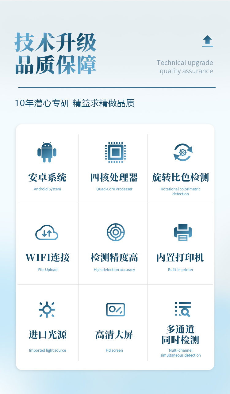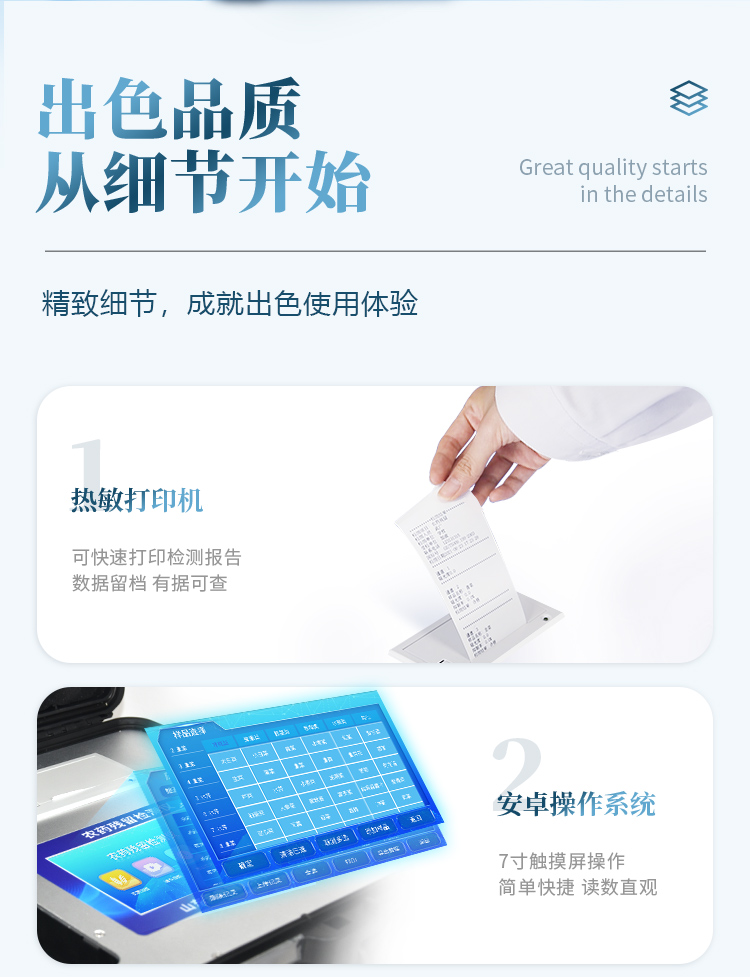 | 安卓智能操作系統(tǒng),采用更加**和人性化操作,儀器具有無線聯(lián)網(wǎng)上傳功能,快速上傳數(shù)據(jù),進(jìn)行數(shù)據(jù)統(tǒng)計(jì)和分析。 | 智能化程度高,儀器具有自檢功能:具有開機(jī)自檢和調(diào)零功能,具有自動(dòng)檢測重復(fù)性功能;同時(shí),檢測完成可自動(dòng)打印檢測報(bào)告和二維碼。手機(jī)掃碼可顯示出詳細(xì)檢測信息。 | 儀器帶有監(jiān)管平臺(tái),數(shù)據(jù)可局域網(wǎng)和互聯(lián)網(wǎng)數(shù)據(jù)上傳,檢測結(jié)果直接傳至食品安全監(jiān)管平臺(tái)。進(jìn)行區(qū)域食品安全監(jiān)管及大數(shù)據(jù)分析處理與數(shù)據(jù)統(tǒng)計(jì),檢測區(qū)域食品安全長短期動(dòng)態(tài),達(dá)到食品安全問題預(yù)估、預(yù)警 。 | 樣品處理簡單省力,整體操作快速、安全、便捷。 | 儀器具有自身保護(hù)功能,可設(shè)置用戶名及密碼,防止非工作人員操作等。 | 內(nèi)置強(qiáng)大的數(shù)據(jù)庫,可在儀器上直接選擇樣品名稱、檢測指標(biāo)、送檢單位等信息,也可在儀器上直接編輯錄入樣品名稱、檢測指標(biāo)、送檢單位等信息并保存進(jìn)樣品數(shù)據(jù)庫,方便后期操作調(diào)取使用。 | 儀器具有重新校準(zhǔn)、鎖定、恢復(fù)出廠設(shè)置功能。 |