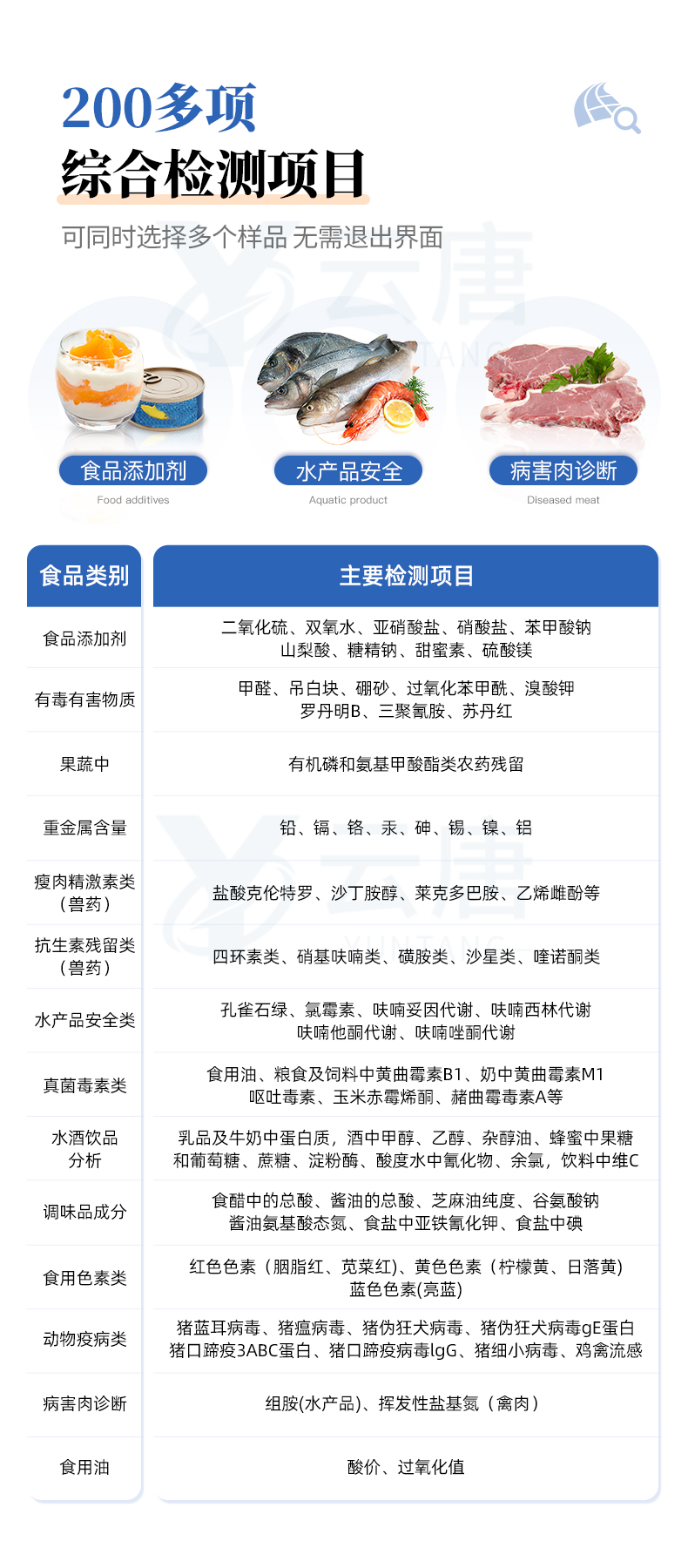 | 食品添加劑:二氧化硫、雙氧水、亞硝酸鹽、硝酸鹽、苯甲酸鈉、山梨酸鉀、糖精鈉、甜蜜素、木耳硫酸鎂等 | 有毒有害物質(zhì):甲醛、吊白塊、硼砂、過氧化苯甲酰、溴酸鉀、羅丹明B、三聚氰胺、蘇丹紅、工業(yè)堿、尿素、明礬等 | 果蔬:農(nóng)藥殘留(酶抑制率法) | 病害肉診斷:組胺、揮發(fā)性鹽基氮; | 重金屬含量:鉛、鎘、鉻、汞、砷、錫、鎳、鋁等; | 食用油脂: 過氧化值、酸價(jià)等 | 瘦肉精激素類(獸藥):鹽酸克倫特羅、沙丁胺醇、萊克多巴胺、己烯雌酚等 | 抗生素殘留類(獸藥):四環(huán)素類、硝基呋喃類、磺胺類、β-興奮劑類、沙星類、磺胺類、喹諾酮類,甲砜霉素,氟苯尼考,金剛烷胺、替米考星、慶大霉素、林可霉素、鏈霉素、恩諾沙星、環(huán)丙沙星、頭孢啦啶、青霉素、阿莫西林等 | 真菌毒素類:食用油、糧食及飼料中黃曲霉毒素B1、黃曲霉毒素總量,奶中黃曲霉毒素M1、嘔吐毒素、玉米赤霉烯酮、赭曲霉毒素A、T2毒素、伏馬毒素等; | 水酒飲品分析:酒中甲醇、乙醇、乳品及牛奶中蛋白質(zhì), | 調(diào)味品成分:食醋的總酸、醬油的總酸、芝麻油純度、谷氨酸鈉、醬油氨基酸態(tài)氮、食鹽中亞鐵氰化鉀、食鹽中碘等 | 食用色素類:紅色色素(胭脂紅、莧菜紅、赤蘚紅、誘惑紅)、黃色色素(檸檬黃、日落黃)、藍(lán)色色素(亮藍(lán))等 | 動(dòng)物疫病類:禽流感、新城疫、牛羊口蹄疫、牛羊結(jié)核病、牛羊包蟲、牛羊布病、小反芻獸、豬藍(lán)耳病毒、豬瘟病毒、豬偽狂犬病毒、豬細(xì)小、豬圓環(huán)、犬細(xì)小病毒、犬瘟熱病毒、犬狂犬病毒等; | 蜂蜜成分:果糖和葡萄糖、蔗糖、淀粉酶、酸度等 | 水產(chǎn)品安全類:孔雀石綠、氯霉素、呋喃妥因、呋喃西林、呋喃它酮、呋喃唑酮等 | 蛋類藥物殘留:氯霉素,四環(huán)素,磺胺類,喹諾酮類,呋喃西林,呋喃它酮,呋喃妥因,呋喃唑酮,氟苯尼考,阿莫西林、頭孢氨芐、紅霉素、鏈霉素等 |