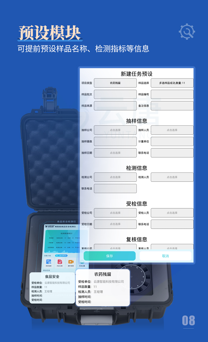 山東云唐智能科技有限公司生產(chǎn)的高智能食品安全檢測(cè)儀為集成化食品安全快速檢測(cè)分析設(shè)備,采用臺(tái)式一體化設(shè)計(jì),可快速檢測(cè)200多種食品安全項(xiàng)目,包含非食用化學(xué)物質(zhì)、濫用食品添加劑、農(nóng)藥殘留、獸藥殘留、重金屬、病害肉、營(yíng)養(yǎng)強(qiáng)化劑、抗生素類殘留、激素類殘留、真菌毒素類殘留、化學(xué)類殘留等項(xiàng)目的定性定量檢測(cè)。該高智能食品安全檢測(cè)儀為集成化食品安全快速檢測(cè)分析設(shè)備,目前已于食藥監(jiān)局、衛(wèi)生部門、高教院校、科研院所、農(nóng)業(yè)部門、養(yǎng)殖場(chǎng)、屠宰場(chǎng)、食品肉產(chǎn)品深加工企業(yè)及檢驗(yàn)檢疫部門等單位廣泛使用。