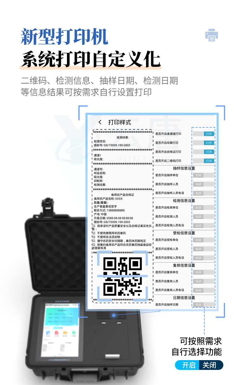 | 儀器采用手提式一體化系統(tǒng)檢測(cè)技術(shù),將分光光度模塊、膠體金檢測(cè)模塊、新型農(nóng)殘檢測(cè)模塊、數(shù)字化管理模塊、無線通訊模塊高度集成于一體,支持檢測(cè)200種食品安全檢測(cè)項(xiàng)目,同時(shí)預(yù)留升級(jí)檢測(cè)方法。 | 儀器檢測(cè)模塊標(biāo)準(zhǔn)化、智能化,檢測(cè)項(xiàng)目可隨意自由組合。檢測(cè)箱體內(nèi)置多個(gè)標(biāo)準(zhǔn)檢測(cè)單元,檢測(cè)模塊可以調(diào)整配置。 | 顯示屏幕:儀器采用10.1英寸豎向液晶觸摸屏顯,搭配運(yùn)行安卓智能操作系統(tǒng),主控芯片采用ARM Cortex-A7,RK3288/4核處理器,主頻1.88Ghz,操作方便,性能更強(qiáng)。 | 檢測(cè)通道:≥12通道;采用精密旋轉(zhuǎn)比色池設(shè)計(jì),使用同芯片同光源校準(zhǔn)精度,解決不同光源之間的誤差值,更加準(zhǔn)確**。(1-12通道間誤差0.1%,***:**202022821055.2) | 儀器光源:高精度進(jìn)口四波長(zhǎng)冷光源,每個(gè)通道均配置 410、520、590、630nm 波長(zhǎng)光源,標(biāo)配**的光路切換裝置,專利光路切換功能可實(shí)現(xiàn)64波長(zhǎng),并且所有檢測(cè)項(xiàng)目可實(shí)現(xiàn)所有通道同時(shí)檢測(cè)。 | 設(shè)備可一鍵校準(zhǔn),自動(dòng)保存校準(zhǔn)數(shù)據(jù),自動(dòng)對(duì)比校驗(yàn),得到精準(zhǔn)光源,采用Android SP存儲(chǔ)數(shù)據(jù),光源數(shù)據(jù)永不丟失,方便每一次使用。 | 通訊接口:配備無線通信模塊、4G(APN)通訊模塊、藍(lán)牙傳輸,同時(shí)具有雙USB接口以及RJ45網(wǎng)線接口,可以多方式實(shí)現(xiàn)數(shù)據(jù)保存及數(shù)據(jù)傳輸。 | 存儲(chǔ)方式:支持U盤存儲(chǔ),標(biāo)準(zhǔn)USB接口,免驅(qū)動(dòng)安裝。檢測(cè)結(jié)果存儲(chǔ)容量20萬條以上,可生成Excel表格進(jìn)行拷貝,并具有登錄保護(hù)功能。 | 智能化操作系統(tǒng):: ★操作系統(tǒng):儀器可在同一檢測(cè)界面自動(dòng)對(duì)應(yīng)相關(guān)檢測(cè)通道,一次性選擇1-12個(gè)樣品名稱,無需退出界面,節(jié)省操作時(shí)間。并可以對(duì)每個(gè)通道屬性和樣品信息單獨(dú)進(jìn)行編輯,例如送檢單位、人員,檢測(cè)人員等,打印時(shí)勾選打印顯示。 | ★數(shù)據(jù)集成系統(tǒng):設(shè)備首頁(yè)自動(dòng)匯總分析檢測(cè)數(shù)據(jù),包含:周檢測(cè)數(shù)據(jù)、月檢測(cè)數(shù)據(jù),全部檢測(cè)總數(shù)量,均包含檢測(cè)總數(shù),合格數(shù),不合格數(shù),以及相關(guān)柱形分析圖,各項(xiàng)檢測(cè)數(shù)據(jù)一目了然,無需電腦查詢,更加快捷直觀。 | ★數(shù)據(jù)庫(kù)系統(tǒng):十幾項(xiàng)數(shù)據(jù)庫(kù)分類管理儀器:包含項(xiàng)目類型、項(xiàng)目數(shù)據(jù)、檢測(cè)數(shù)據(jù)、歷史記錄、國(guó)標(biāo)信息、曲線信息、采樣信息、檢測(cè)信息、受檢信息、復(fù)核信息、圖表信息、光源校準(zhǔn)信息、打印樣式信息、樣品庫(kù)信息等等,數(shù)據(jù)庫(kù)之間互相協(xié)調(diào)聯(lián)動(dòng)保證數(shù)據(jù)的真實(shí)完整性。同時(shí)產(chǎn)品數(shù)據(jù)庫(kù)以及歷史檢測(cè)記錄支持一鍵檢索功能。 | ★限量規(guī)判系統(tǒng):具有限量查詢、添加物質(zhì)合規(guī)判定系統(tǒng)。檢測(cè)出結(jié)果后,系統(tǒng)自動(dòng)調(diào)用系統(tǒng)數(shù)據(jù)庫(kù)中相關(guān)國(guó)標(biāo)進(jìn)行比對(duì)判定,客觀顯示判定結(jié)果是否合格 | ★項(xiàng)目預(yù)設(shè)系統(tǒng):儀器具有任務(wù)預(yù)設(shè)模塊,一鍵提前預(yù)設(shè),給出方便快捷的新檢測(cè)方案,每一個(gè)任務(wù)分別可以設(shè)置不同的樣品、批次、編號(hào)、來源、備注、抽樣信息、檢測(cè)信息、受檢信息、復(fù)核信息等更多信息。樣品送檢時(shí)一鍵調(diào)取保存信息,并可多次調(diào)取,大大提高檢測(cè)效率。 | ★數(shù)據(jù)監(jiān)管系統(tǒng):同步對(duì)接監(jiān)管平臺(tái),數(shù)據(jù)可局域網(wǎng)和互聯(lián)網(wǎng)數(shù)據(jù)上傳,檢測(cè)結(jié)果可選擇直接傳至食品安全監(jiān)管平臺(tái)。進(jìn)行區(qū)域食品安全監(jiān)管及大數(shù)據(jù)分析處理與數(shù)據(jù)統(tǒng)計(jì),檢測(cè)區(qū)域食品安全長(zhǎng)短期動(dòng)態(tài),達(dá)到食品安全問題預(yù)估、預(yù)警。 | ★打印系統(tǒng):內(nèi)置全新打印機(jī),新創(chuàng)自定義打印方式,可按需靈活勾選控制:產(chǎn)品合格證(國(guó)家農(nóng)業(yè)部標(biāo)準(zhǔn)要求),二維碼,抽樣信息、檢測(cè)信息,受檢信息、復(fù)核信息、抽樣日期、檢測(cè)日期等信息的打印。 | 供電模式:儀器交直流兩用,直流12V供電,可連接車載電源,可配6ah大容量充電鋰電池,電量可實(shí)時(shí)顯示,方便戶外流動(dòng)測(cè)試。 | 膠體金檢測(cè)模塊:采用雙通道CMOS成像處理技術(shù)及膠體金免疫層析技術(shù),可同時(shí)讀取雙膠體金卡數(shù)據(jù),自動(dòng)采集、處理分析,將檢測(cè)結(jié)果顯示,并可根據(jù)參考限值自動(dòng)判斷檢測(cè)結(jié)果,可檢測(cè)常見的獸藥殘留、生物毒素、抗生素、違禁添加物等。 | ★探測(cè)技術(shù):CMOS成像探測(cè); | ★檢測(cè)通道:1個(gè)通道; | ★檢測(cè)方式:消線法和比色法; | ★顯示模式:陰性或陽(yáng)性; | ★曲