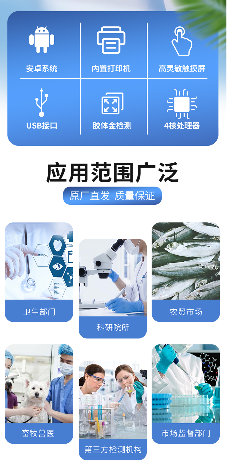 該動(dòng)物疫病診斷儀適用于豬、雞、鴨、羊、牛、牛奶等畜禽產(chǎn)品中動(dòng)物疫病、獸藥殘留、有毒有害物質(zhì)和抗生素殘留的檢測(cè)可廣泛應(yīng)用于食藥監(jiān)局、衛(wèi)生部門、高教院校、科研院所、農(nóng)業(yè)部門、畜牧獸醫(yī)、養(yǎng)殖場(chǎng)、屠宰場(chǎng)、食品肉產(chǎn)品深加工企業(yè)、檢驗(yàn)檢疫部門等單位使用。