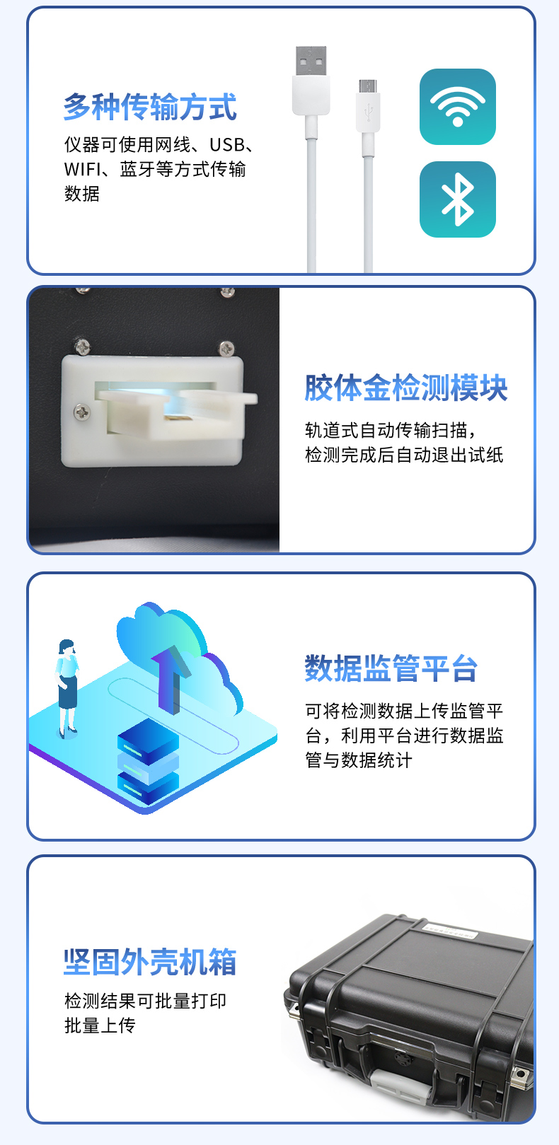 兼容市場(chǎng)上所有的膠體金卡,使用耗材不受限制,極大增強(qiáng)用戶使用體驗(yàn)。